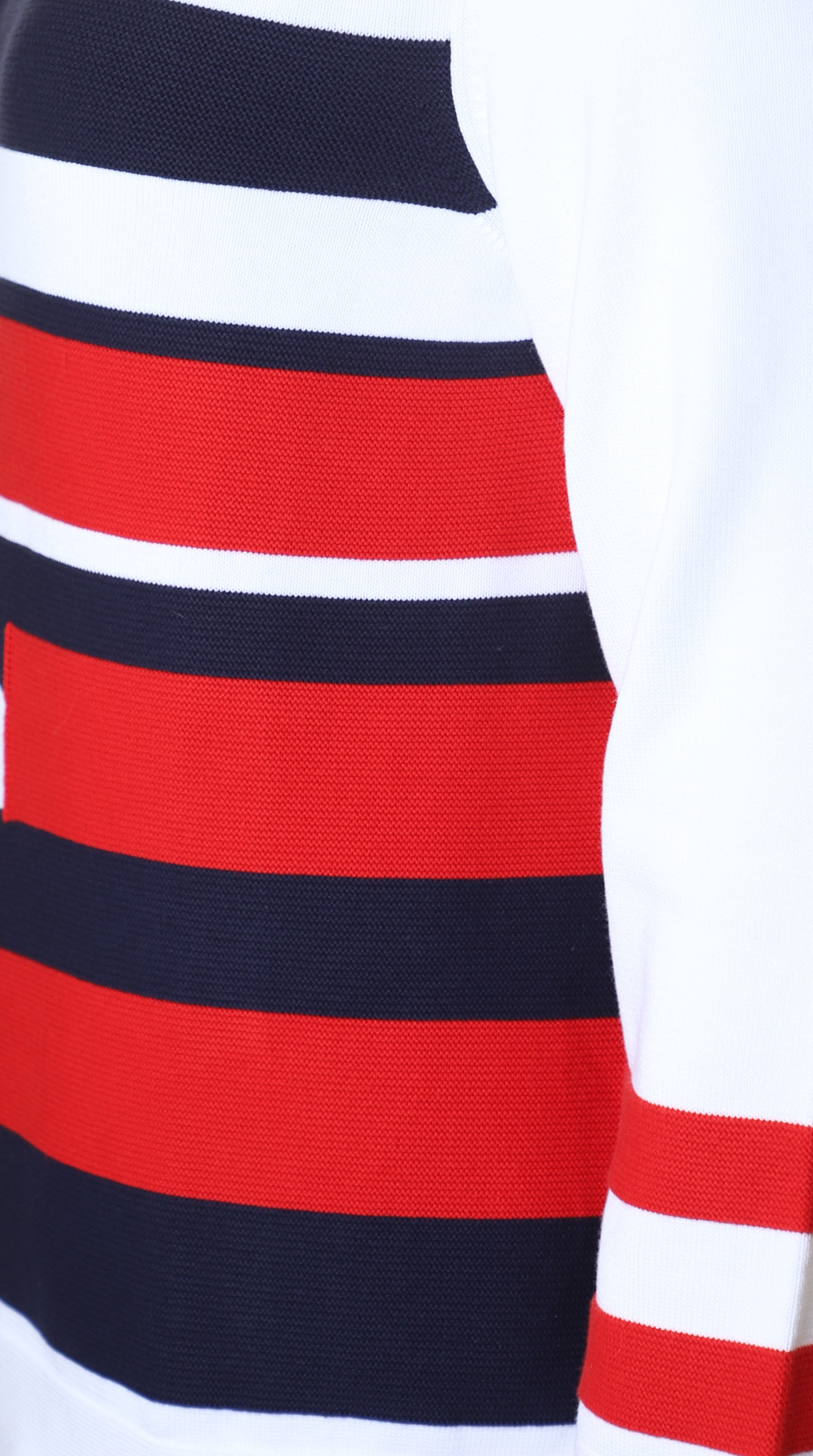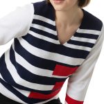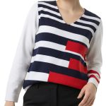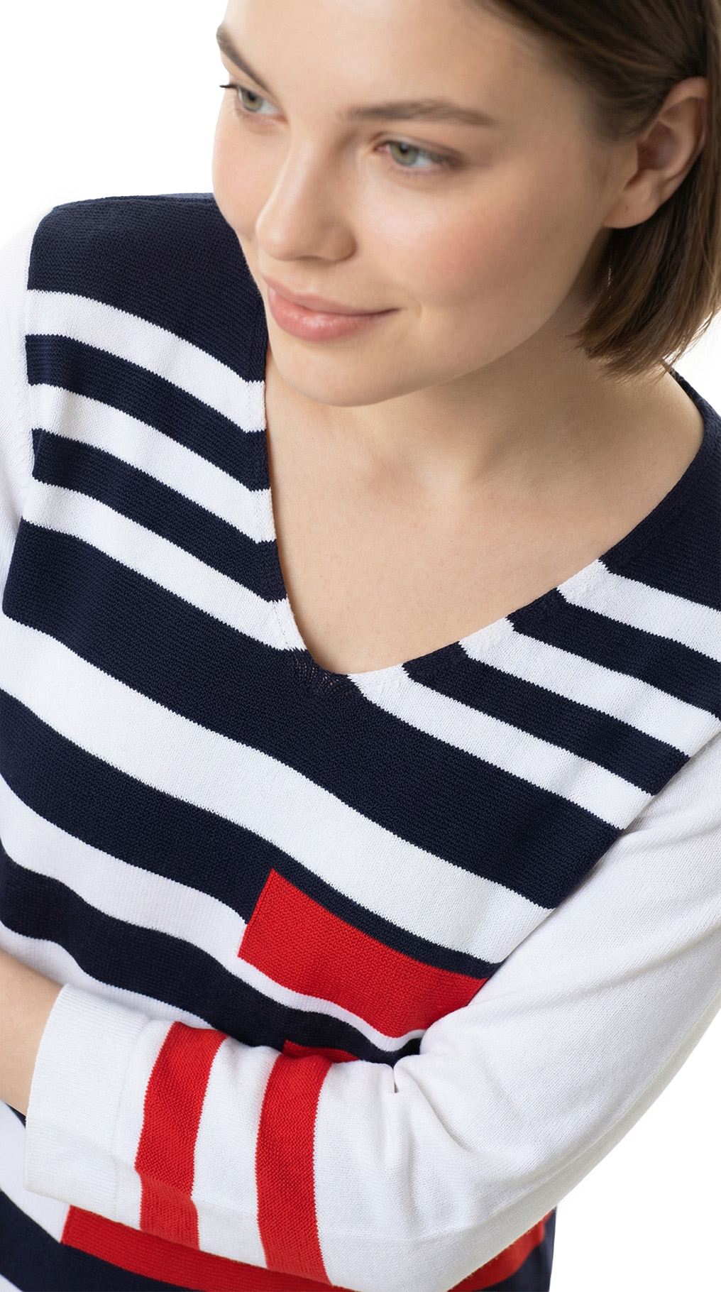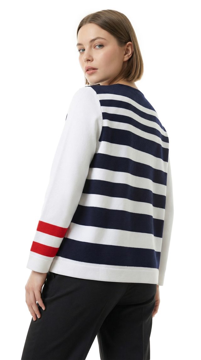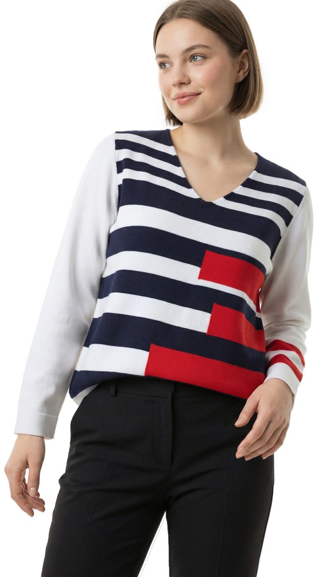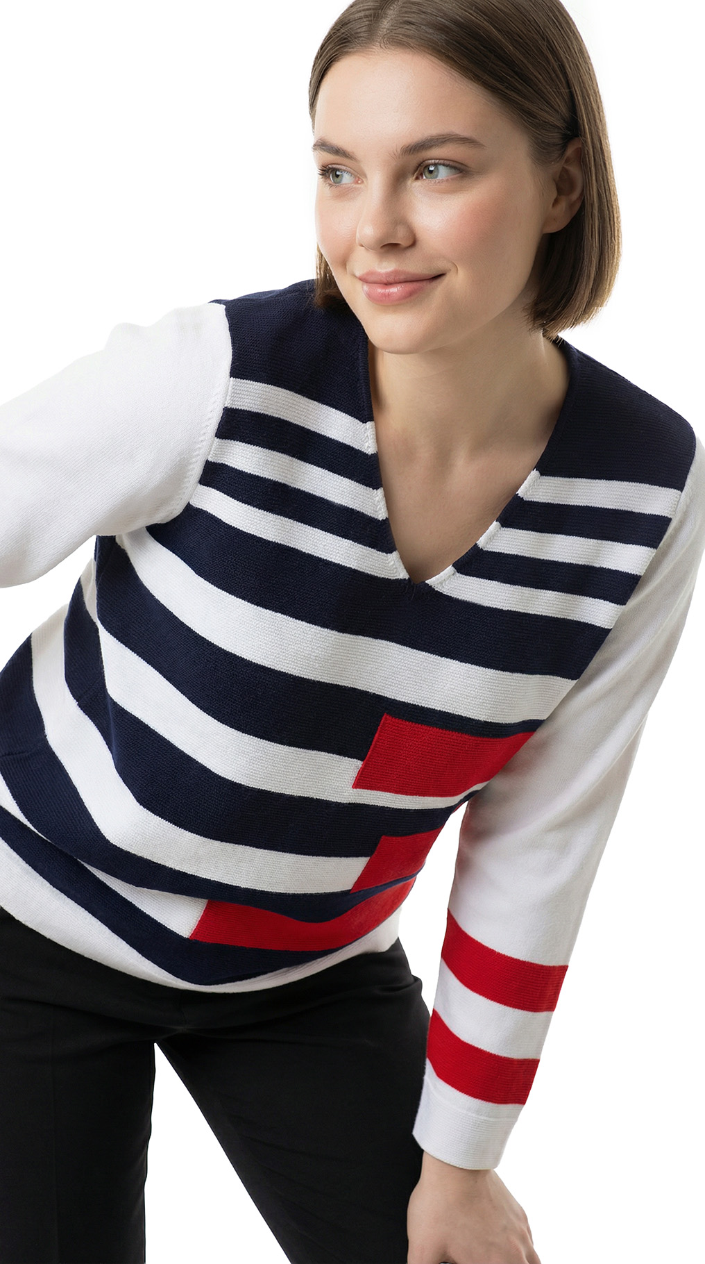 Оригинал. Новый хлопковый джемпер концерна Max Mara (линия Marina Rinaldi) белого цвета с темно-сине-красными полосами. Свободный фасон «трапеция» с длинным рукавом и V-образным вырезом горловины. В составе: 100% хлопок — ткань экстра качества: плотная, мягкая, хорошо держит форму. Пошив — Румыния. Состояние — новое, из аутлета концерна MaxMara (ярлык бренда надрезан — это политика аутлета).
