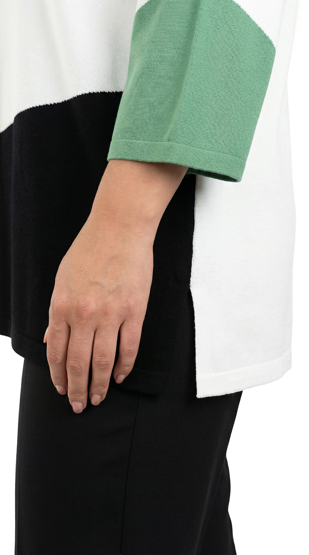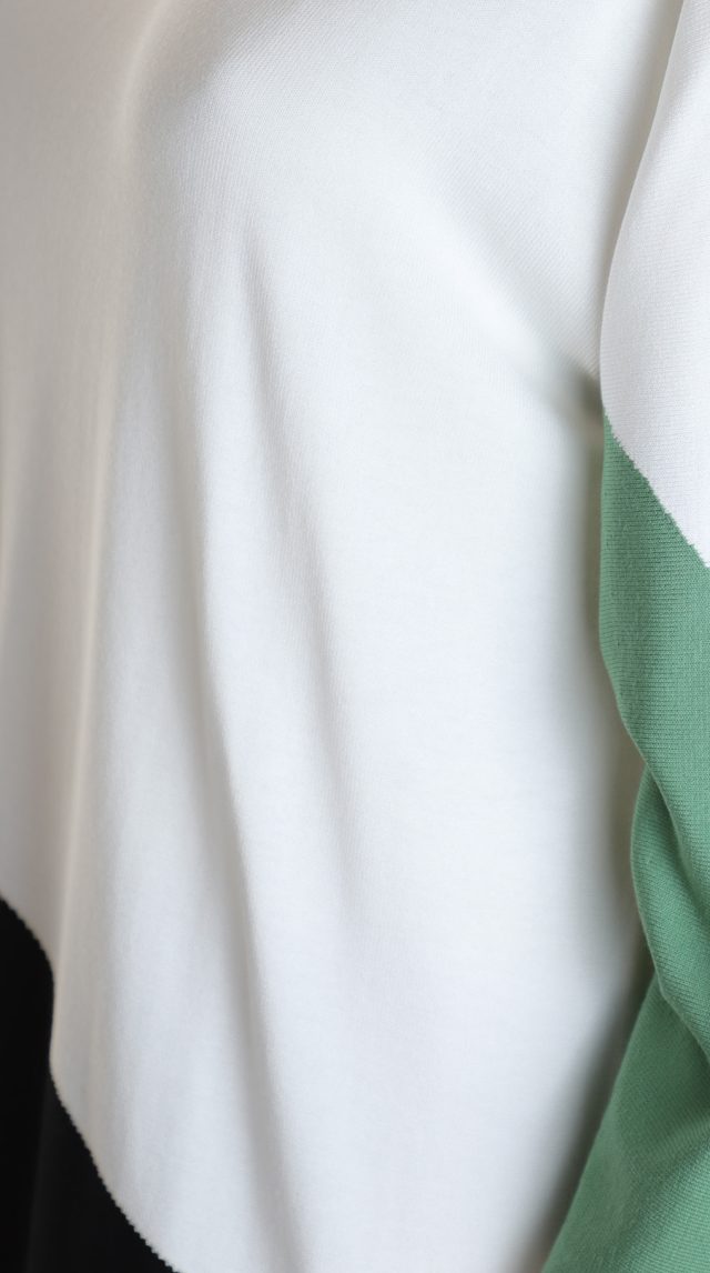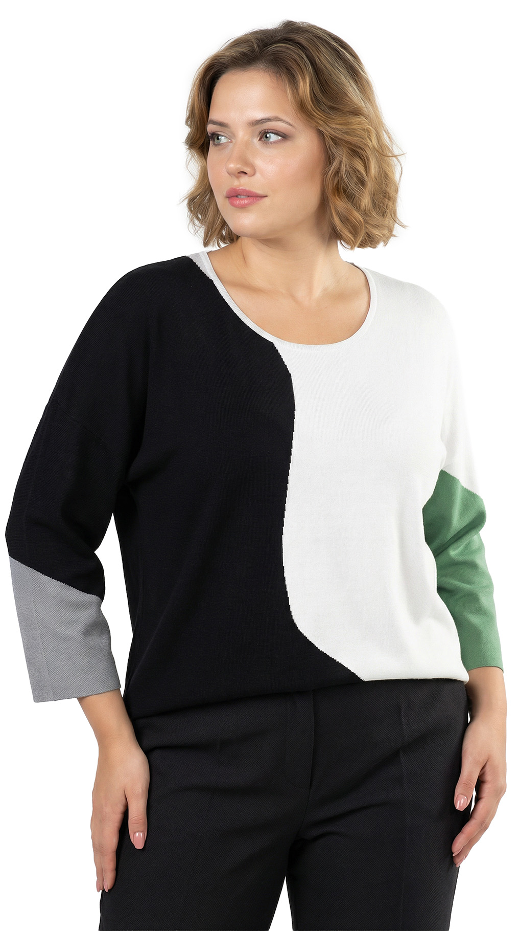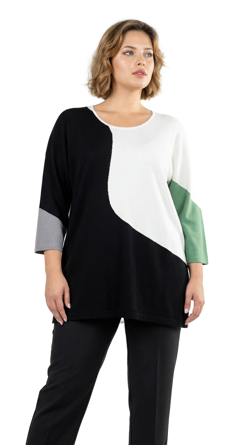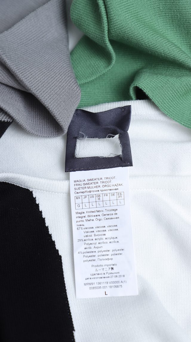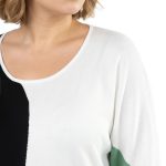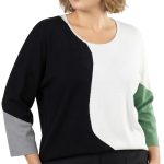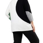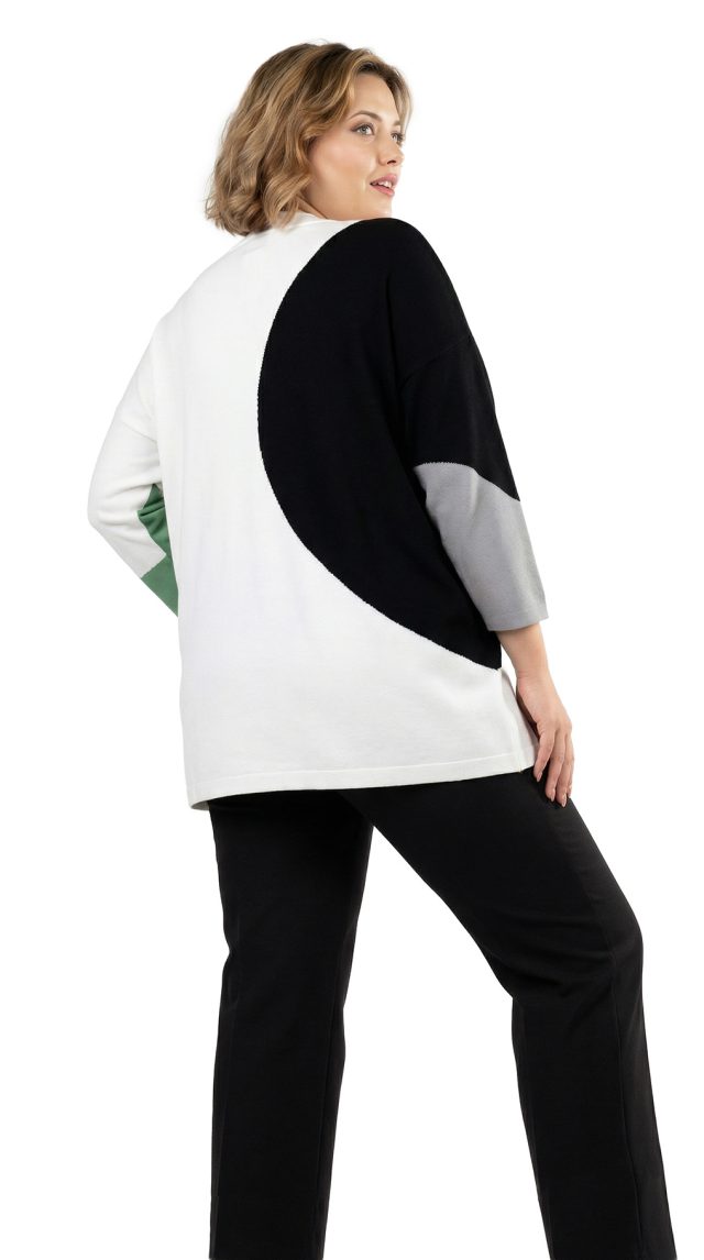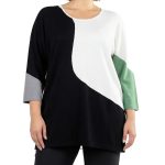 Оригинал. Новый трикотажный джемпер концерна Max Mara (линия Marina Rinaldi) с красивым принтом в бело-черно-серо-зеленых цветах. Свободный прямой удлиненный фасон с приспущенным рукавом длиной 3/4. Скругленный вырез горловины. Вырезы в боковых швах для комфортной посадки. Пошив — Румыния. В составе: 67% вискоза, 29% акрил, 4% эластан — ткань экстра качества: средней плотности, мягкая, теплая. Состояние — новое, из аутлета концерна MaxMara (ярлык бренда надрезан — это политика аутлета).