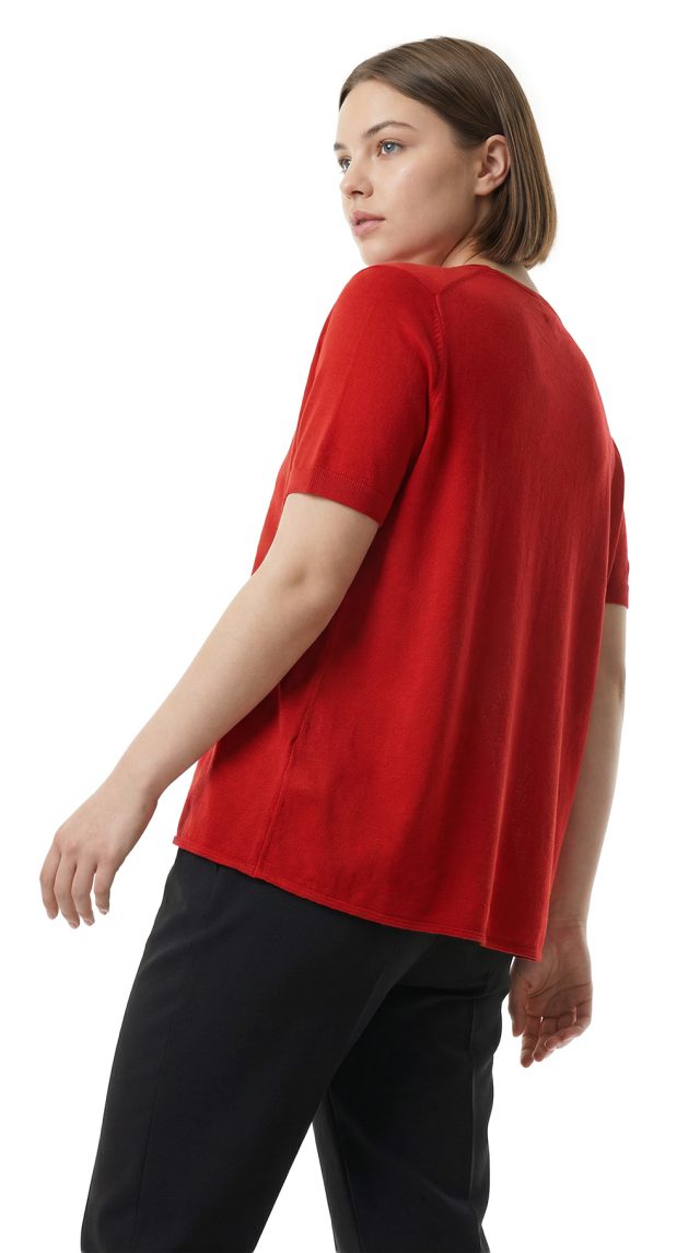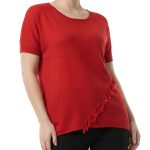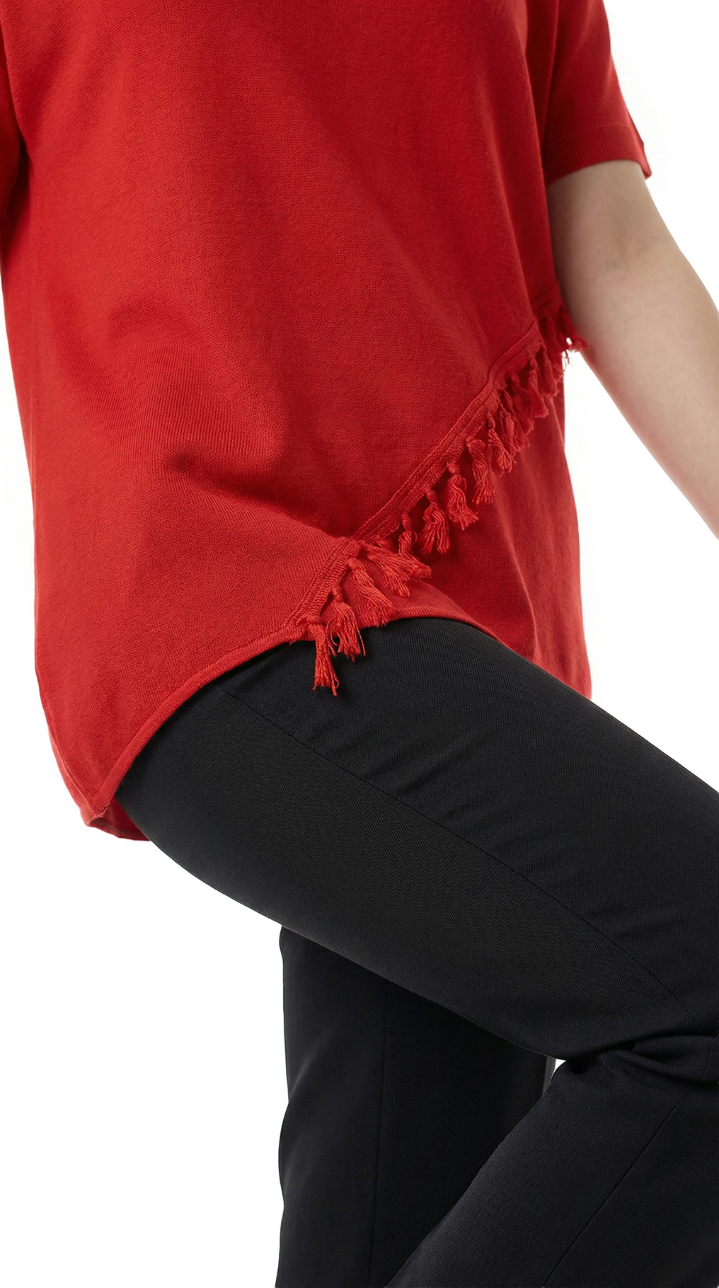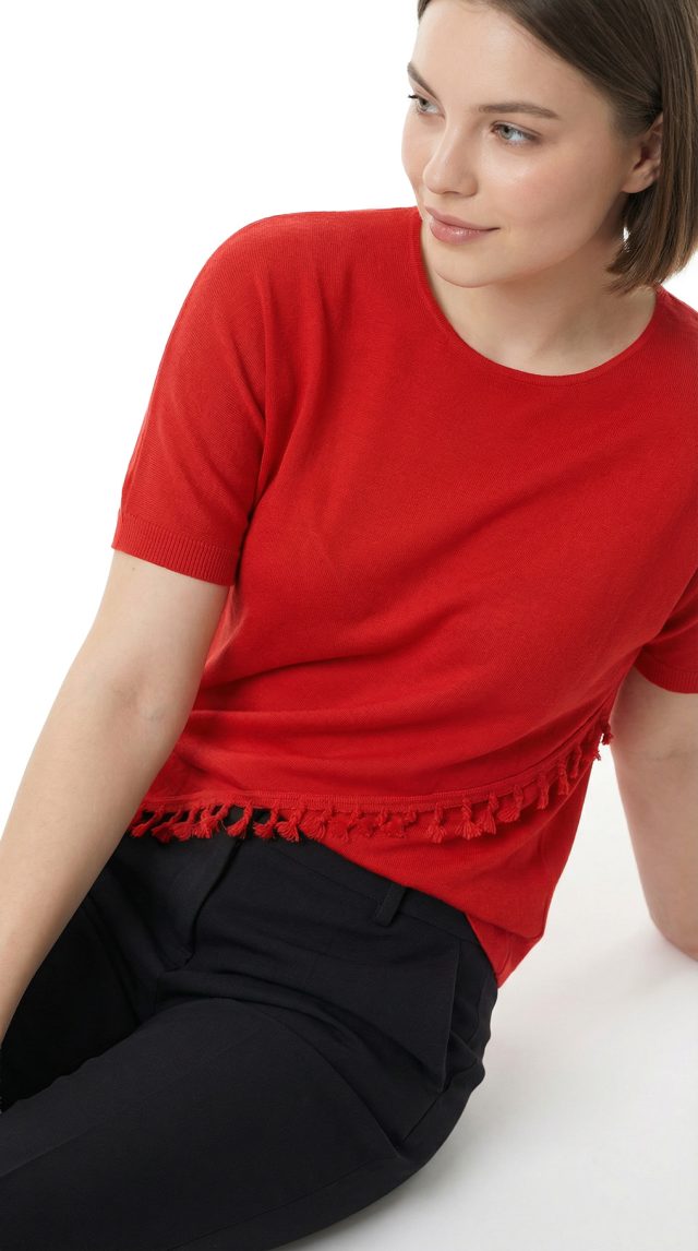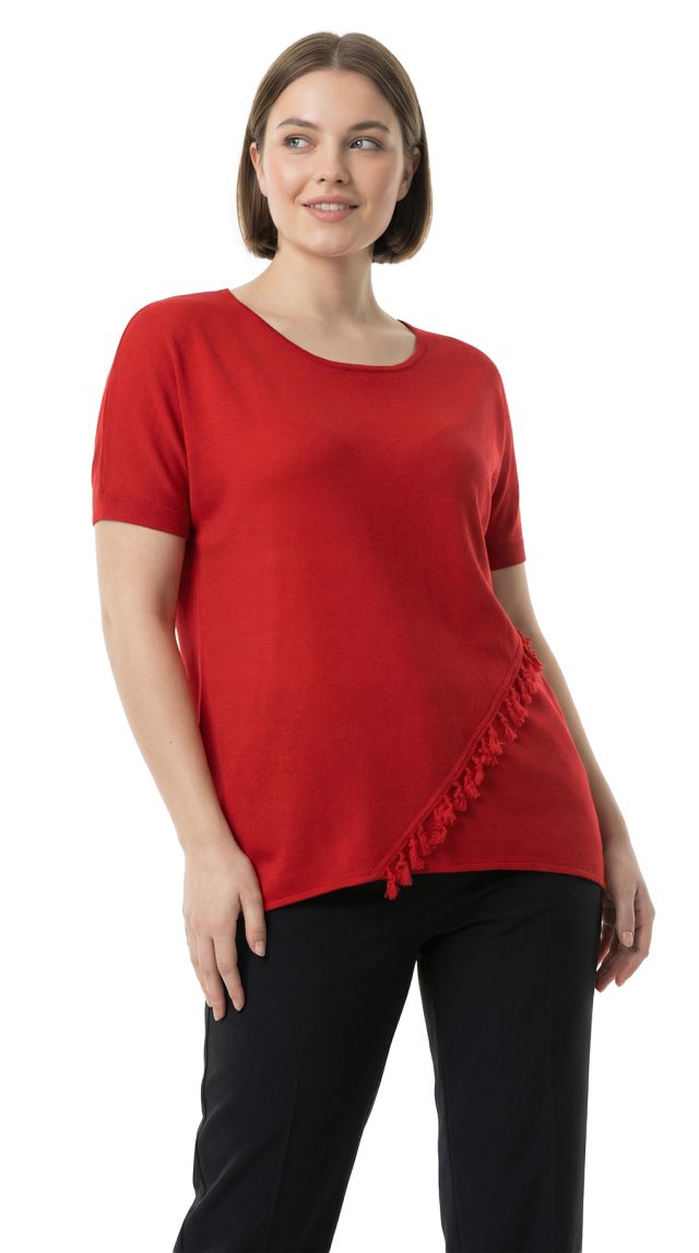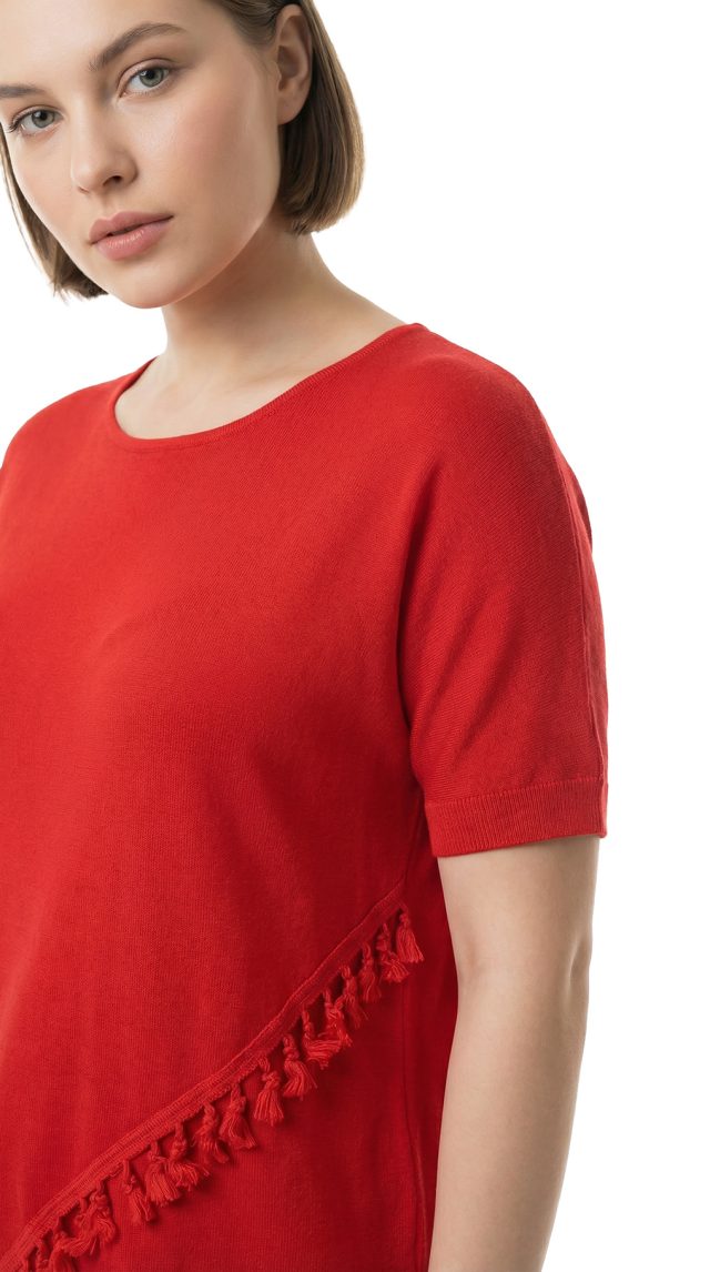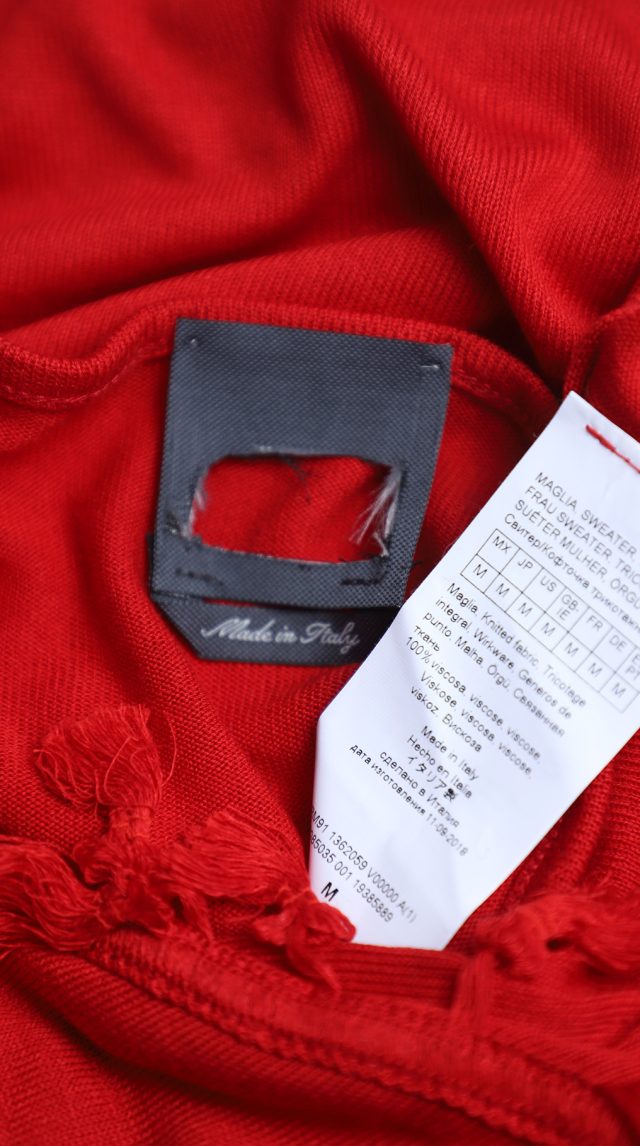 Оригинал. Новый трикотажный джемпер концерна Max Mara (линия Marina Rinaldi) насыщенного красного цвета. Свободный прямой удлиненный фасон с коротким приспущенным рукавом реглан. Скругленный вырез горловины. Красивая декорация в виде кисточек. В составе 100% вискоза — ткань экстра качества: легкая, очень мягкая, шелковистая на ощупь. Пошив — Италия. Состояние — новое, из аутлета концерна MaxMara (ярлык бренда надрезан — это политика аутлета).