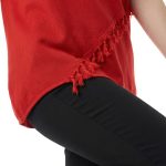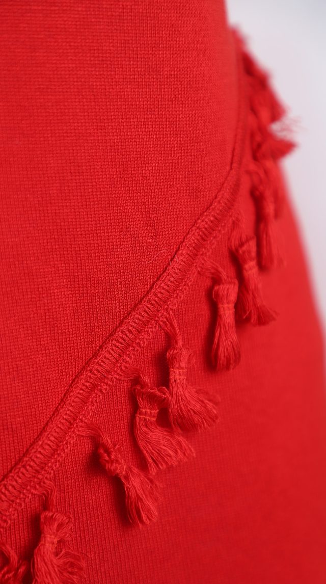 Трикотажный джемпер Max Mara красного цвета свободного прямого удлиненного фасона с коротким приспущенным рукавом реглан и касивой декорацией в виде кисточек.