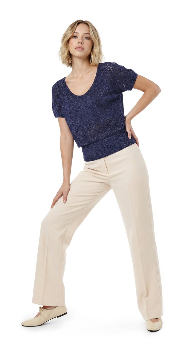 Оригинал. Трикотажный джемпер концерна Max Mara темно-синего цвета с вплетенными нитями металлик — смотрится мега стильно и элегантно. Узорная вязка ромбами по талии и рукавам. Широкая резинка. Короткий рукав. Скругленный глубокий вырез горловины с защипами по спинке. В составе 80% вискоза, 20% металлик — ткань средней плотности, эластичная. Прекрасное дополнение гардероба в любое время года. Состояние — новое, из аутлета концерна MaxMara (ярлык бренда надрезан — это политика аутлета).