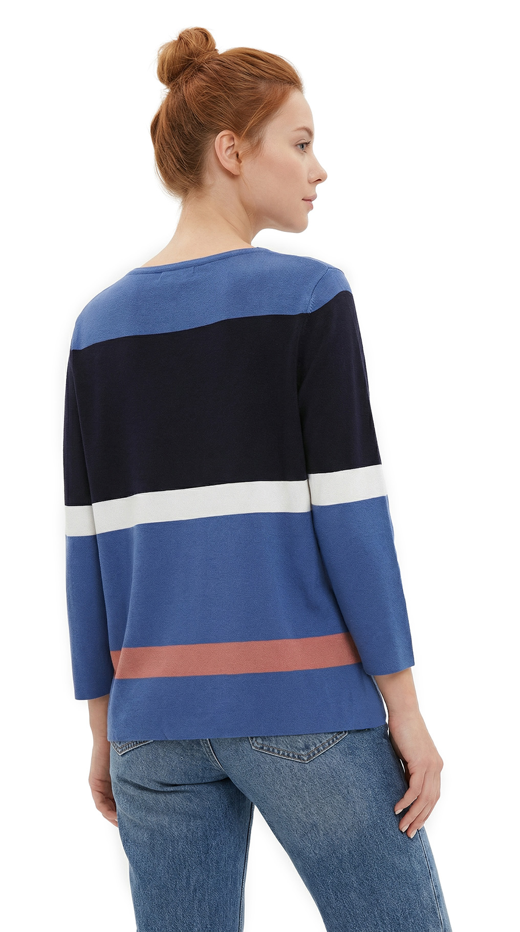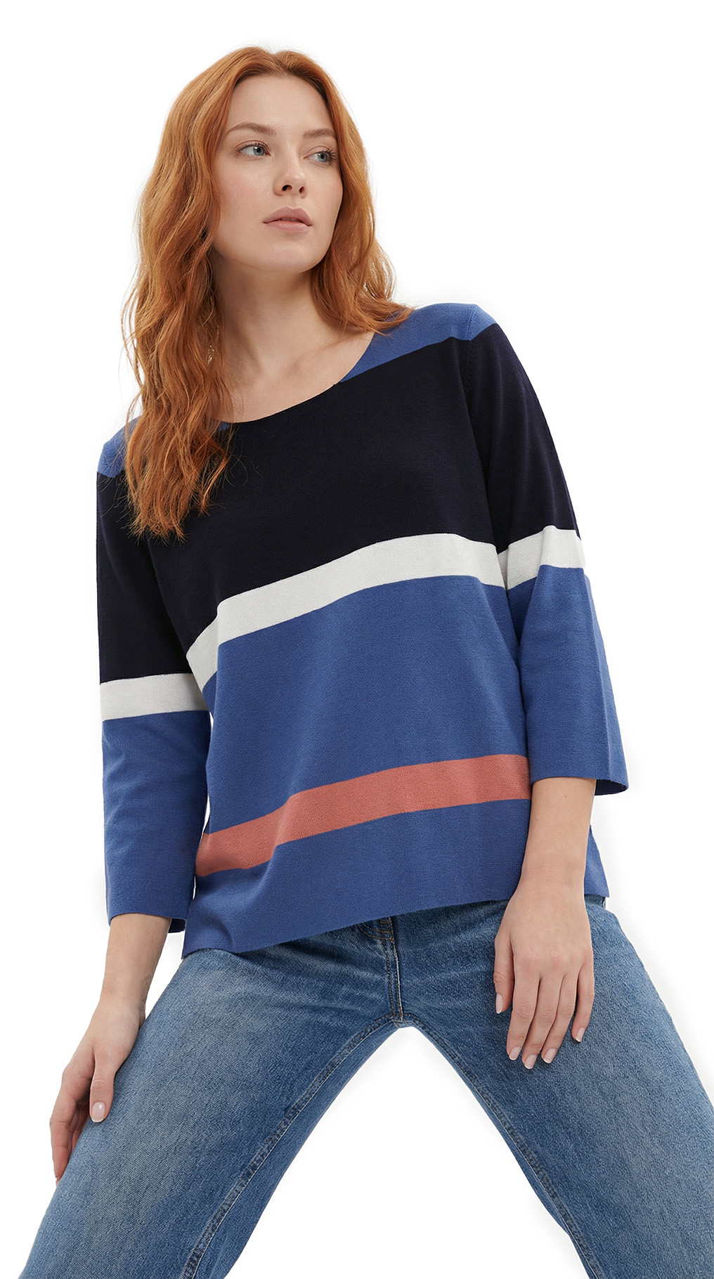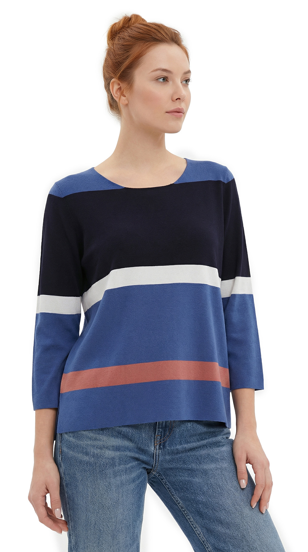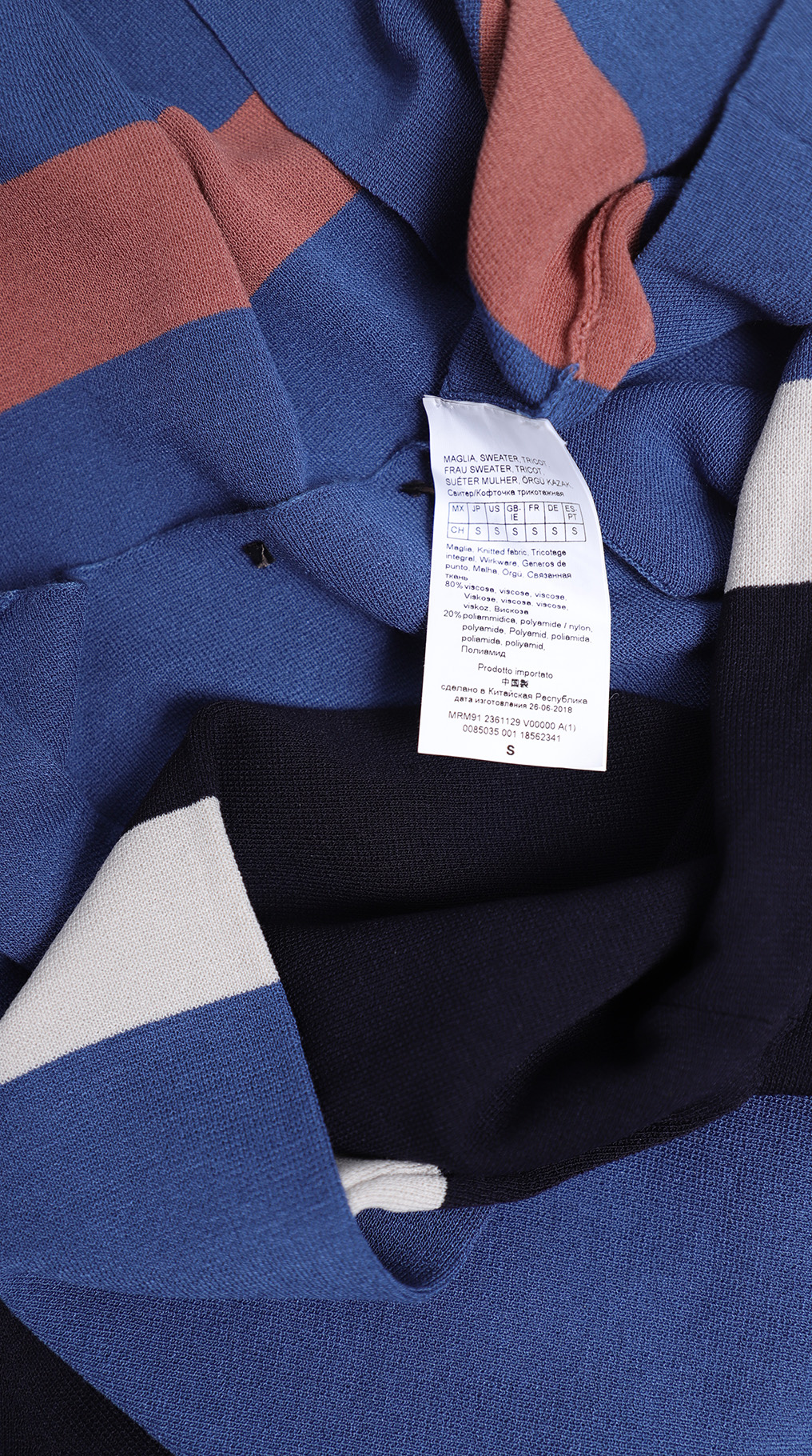 Оригинал. Новый трикотажный джемпер концерна Max Mara в полоску синего, терракотового, белого и черного цветов. Свободный укороченный фасон «трапеция» с рукавом 3/4, скругленной горловиной и открытыми швами. В составе: 80% вискоза, 20% полиамид — ткань экстра качества: средней плотности, мягкая, хорошо тянется. Состояние — новое, из аутлета концерна MaxMara (ярлык бренда надрезан — это политика аутлета).