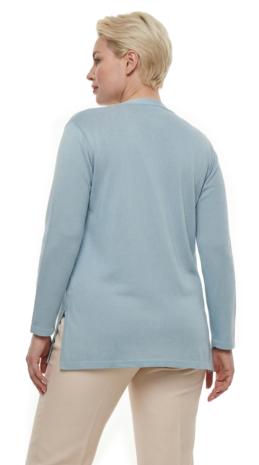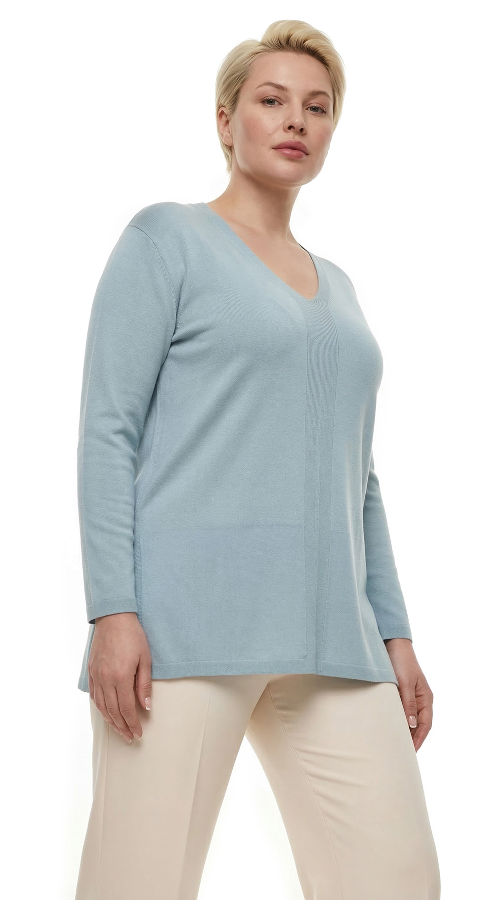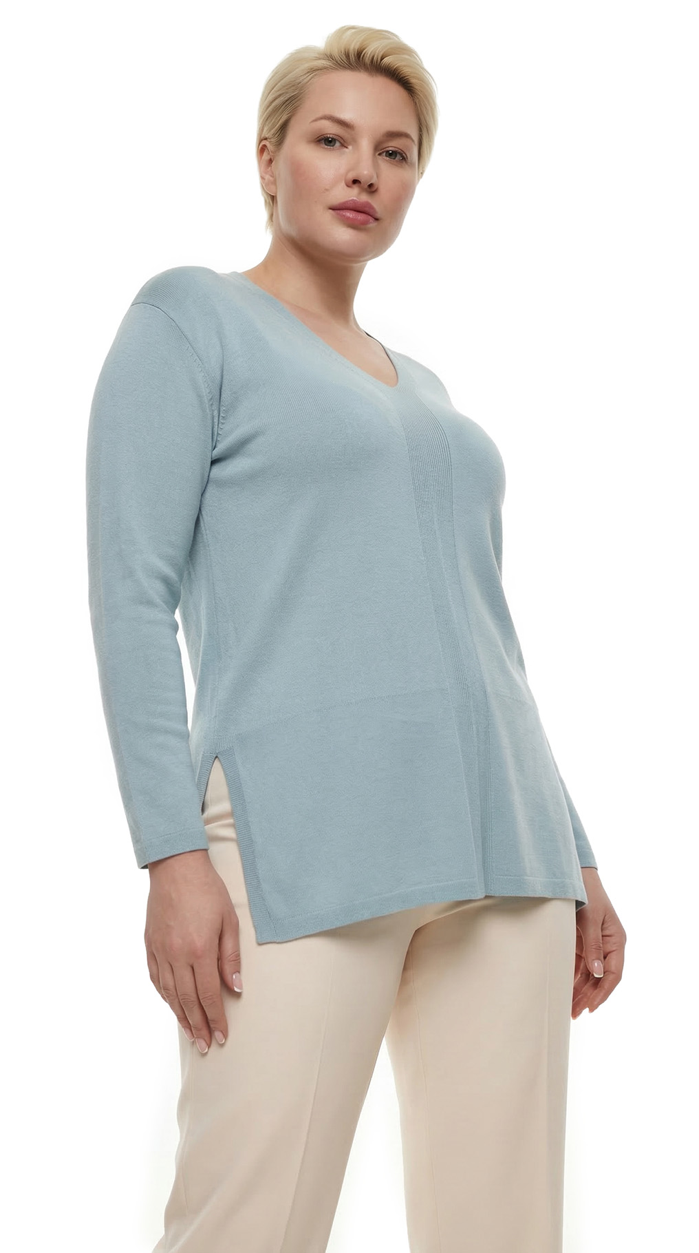 Оригинал. Новый трикотажный джемпер концерна Max Mara (линия Weekend) нежного голубого цвета. Свободный удлиненный фасон «трапеция» с рукавом 3/4 и V-образным вырезом горловины. Вертикальная вставка-декор по центру. Глубокие вырезы в боковых швах для комфортной посадки. В составе 90% вискоза, 10% полиамид — ткань экстра качества: легкая, мягкая, приятная к телу. Состояние — новое, из аутлета концерна MaxMara (ярлык бренда надрезан — это политика аутлета).