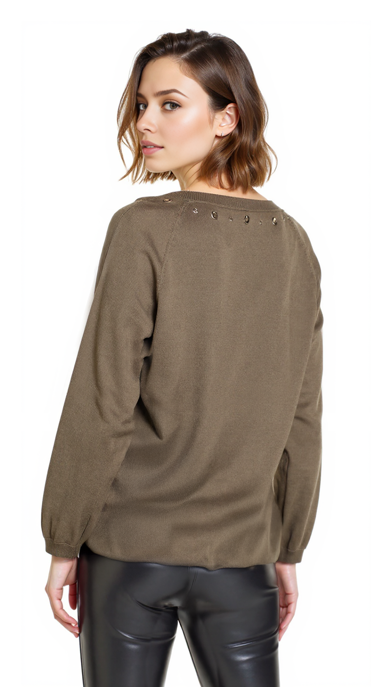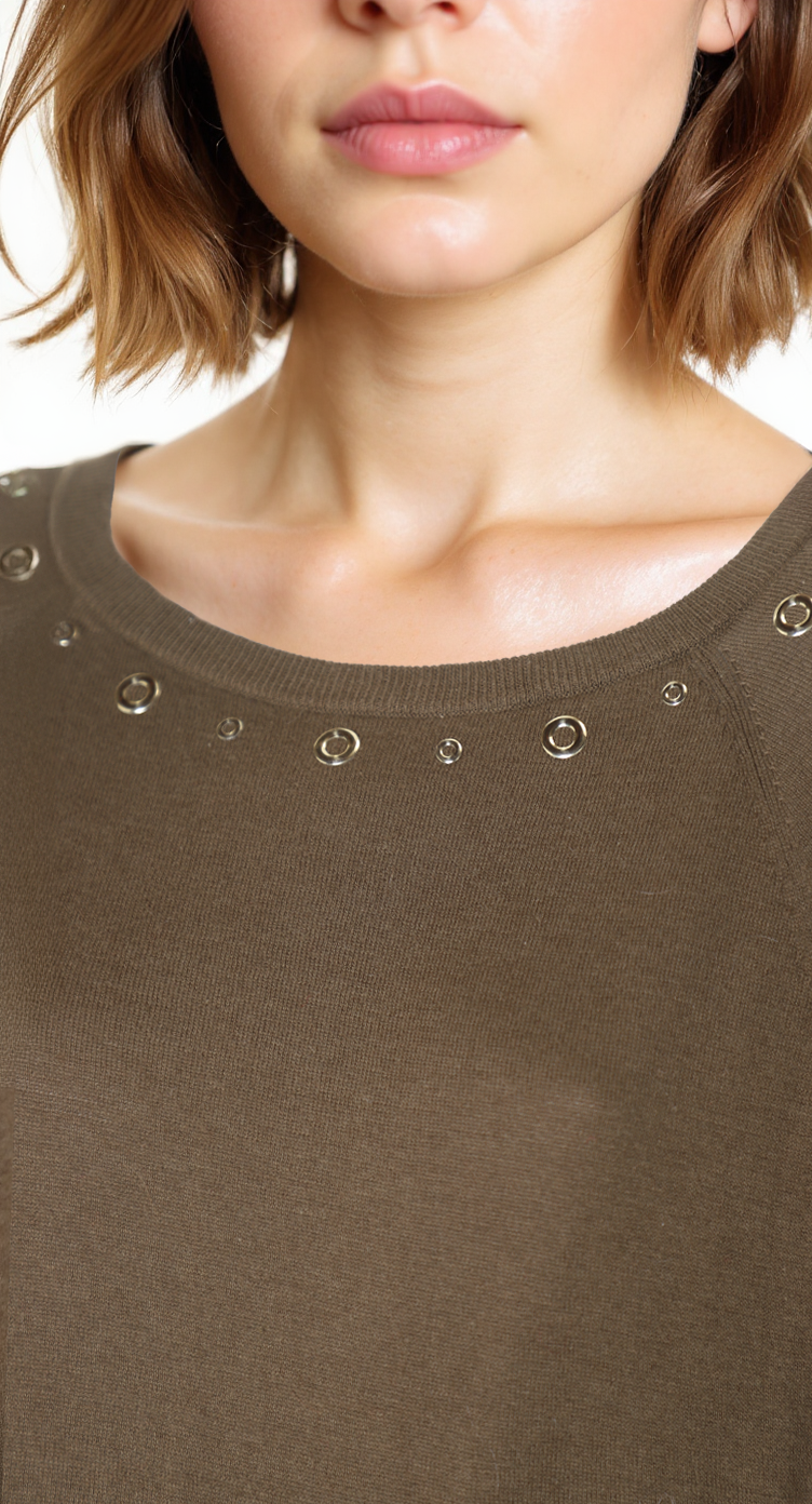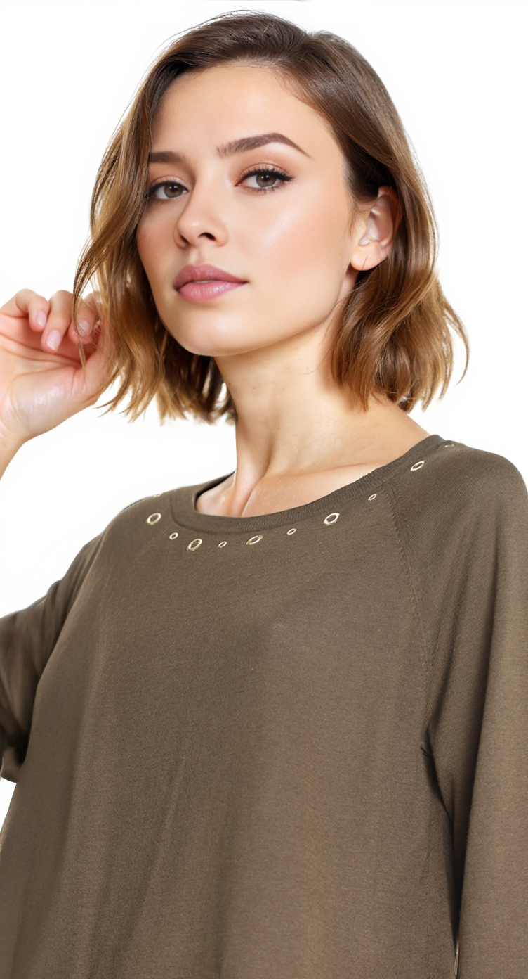 Новый стильный джемпер Michael Kors темно-оливкового цвета. Свободный фасон со скругленной горловиной, декорированной золотыми люверсами, и подвязкой на кантик. Приспущенный рукав длиной 3/4. В составе: 60% хлопок, 40% вискоза — ткань средней плотности, очень мягкая, приятная к телу. Оригинал из США. Состояние — новое, с фирменной биркой Michael Kors.