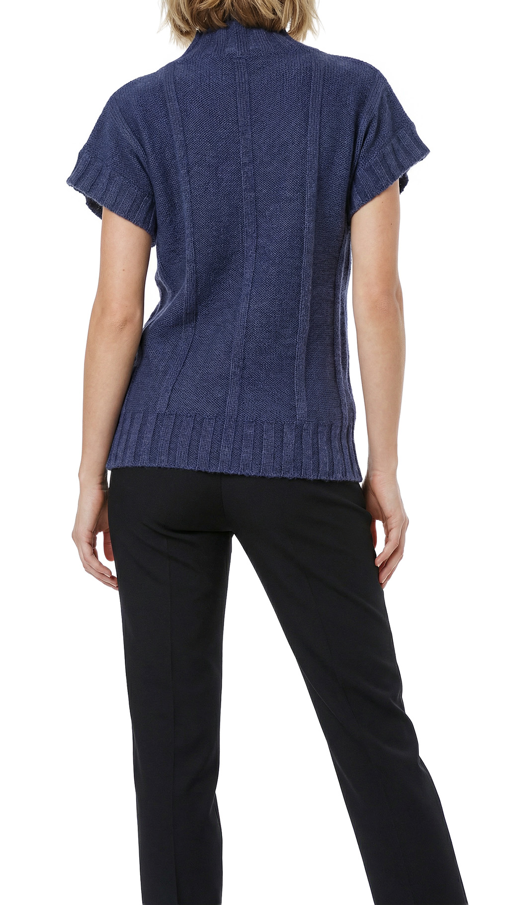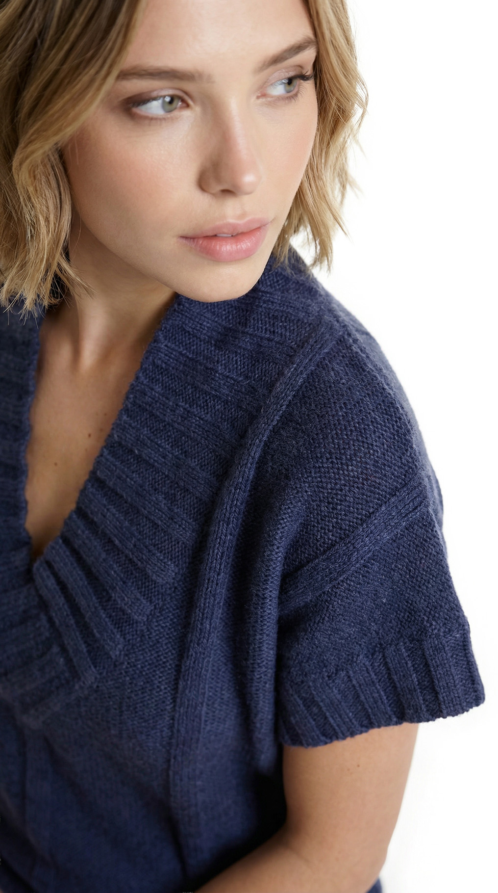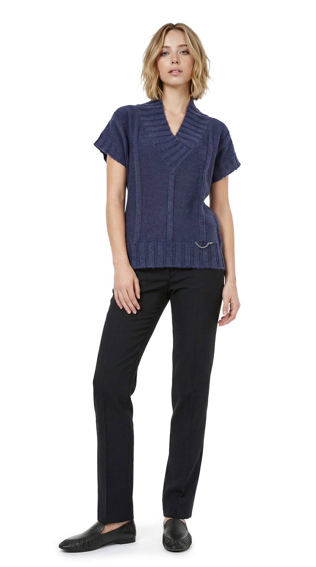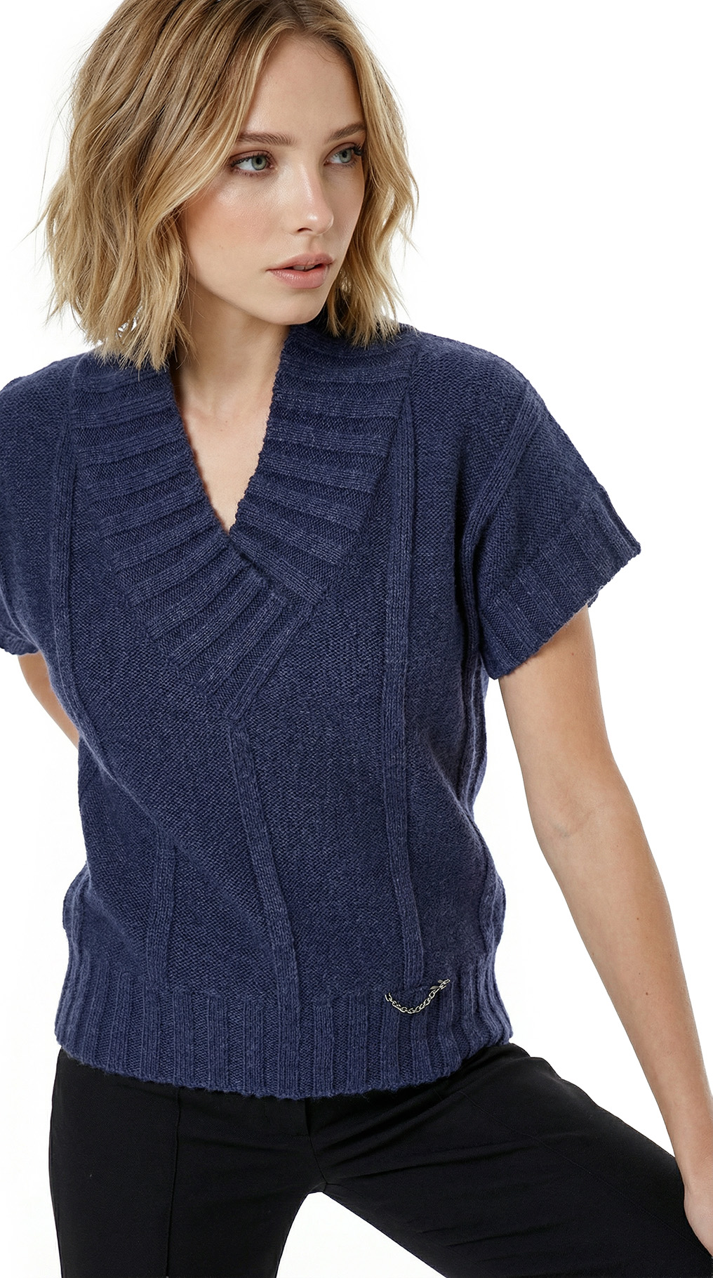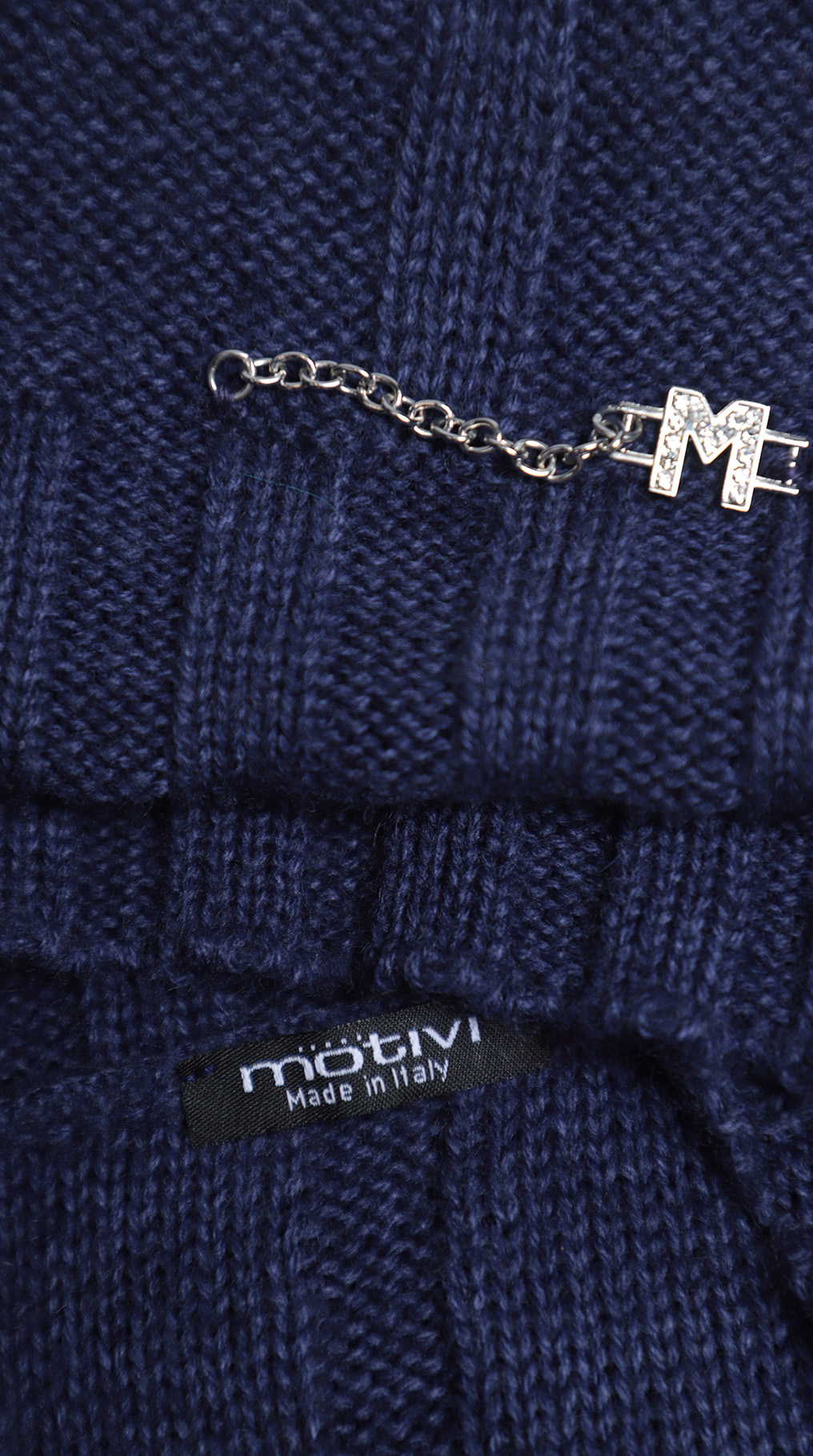 Шерстяной джемпер популярного итальянского бренда Motivi фиолетового цвета с объемным V-образным воротничком, коротким приспущенным рукавом реглан и фирменным серебряным логотипом на цепочке. Широкая резинка по бедрам. В составе 30% мохер, 10% шерсть, 60% акрил — ткань легкая, мягкая, теплая. Состояние — идеальное, как новое.