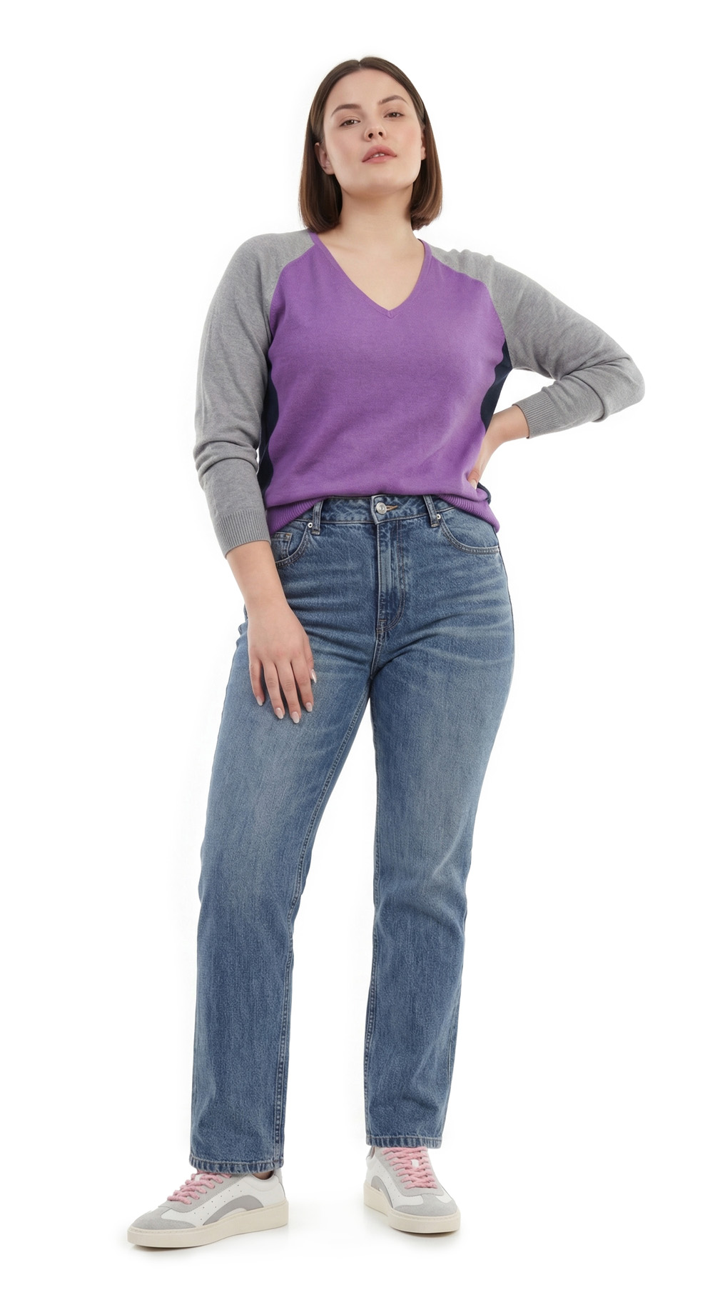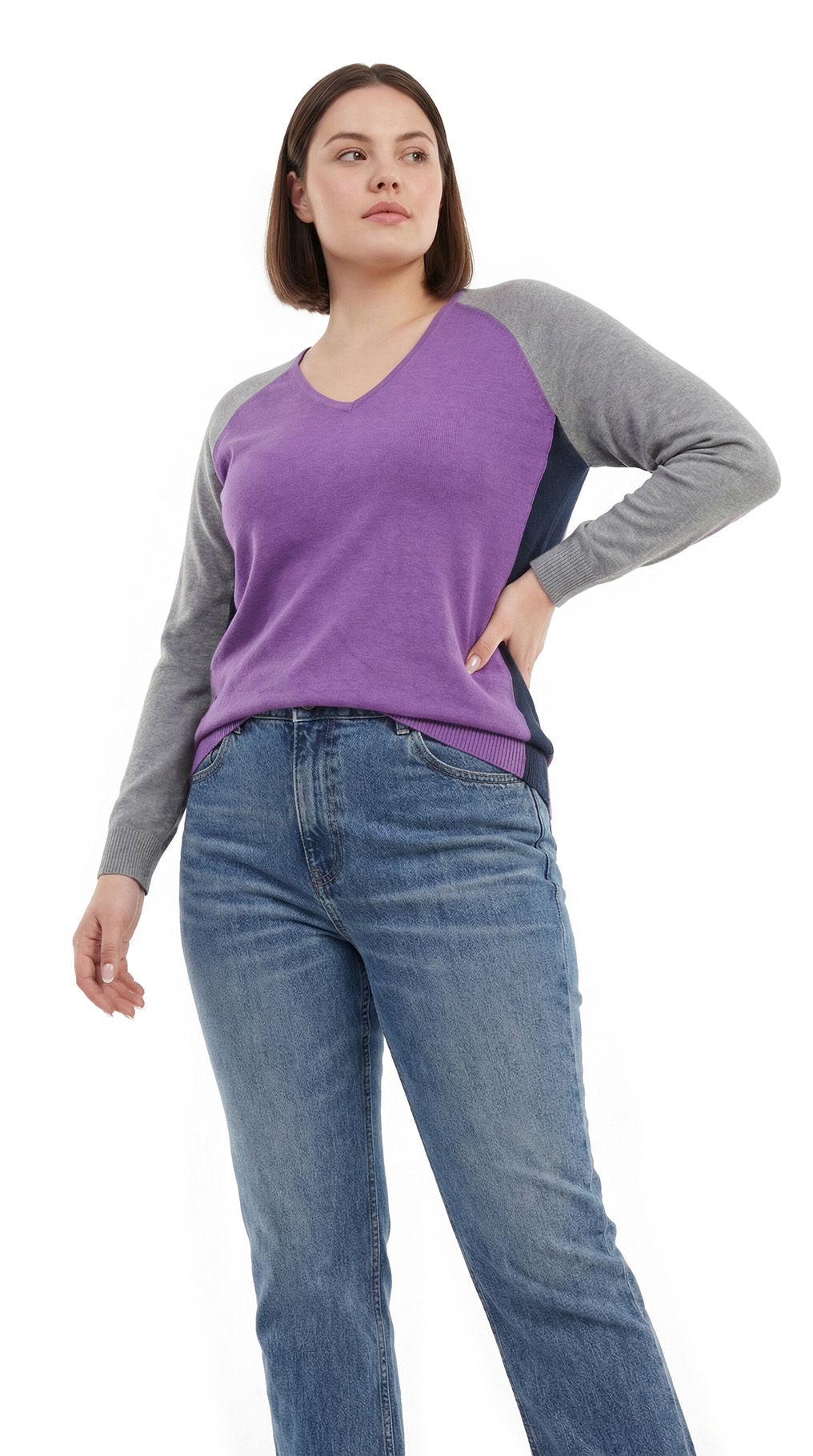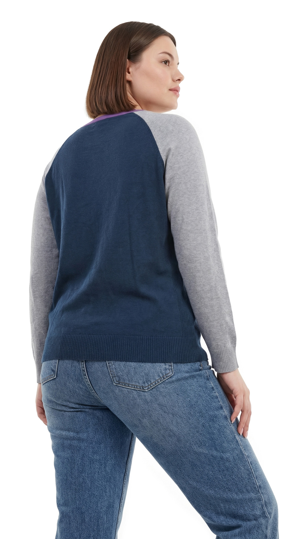Трикотажный джемпер Ralph Lauren (коллекция Chaps) в светло-серых, темно-синих, и сиреневых тонах. Полу-приталенный фасон с длинным приспущенным рукавом реглан и V-образным вырезом горловины. Широкая резинка по бедрам. В составе: 60% хлопок, 40% модал — ткань очень мягкая, приятная к телу. Состояние — идеальное, как новое.