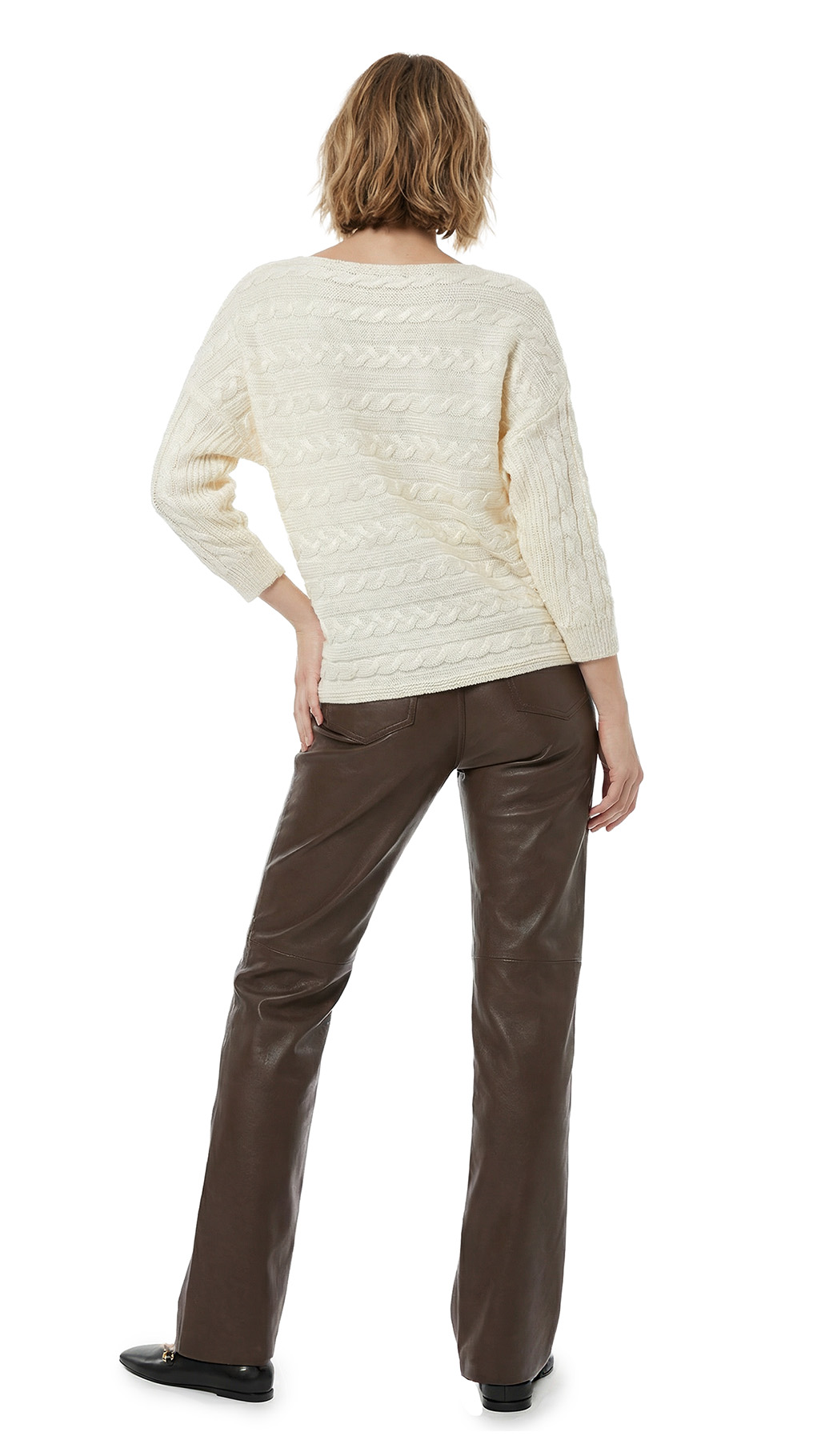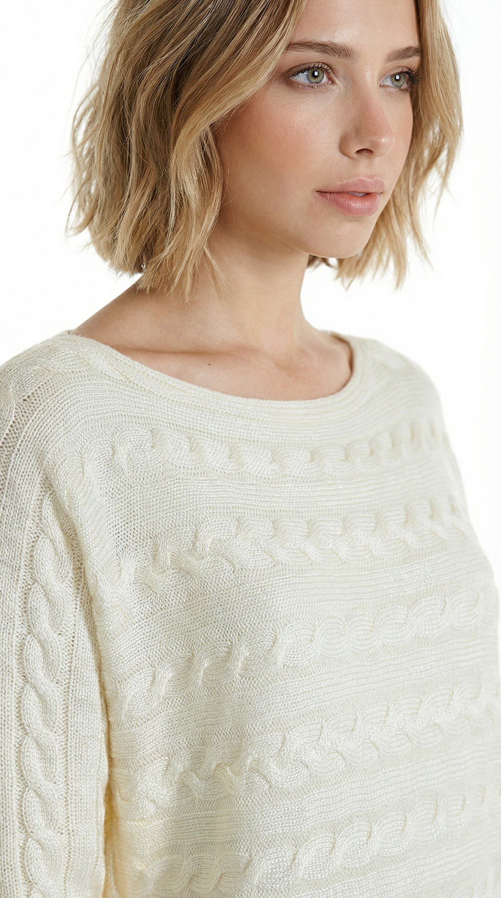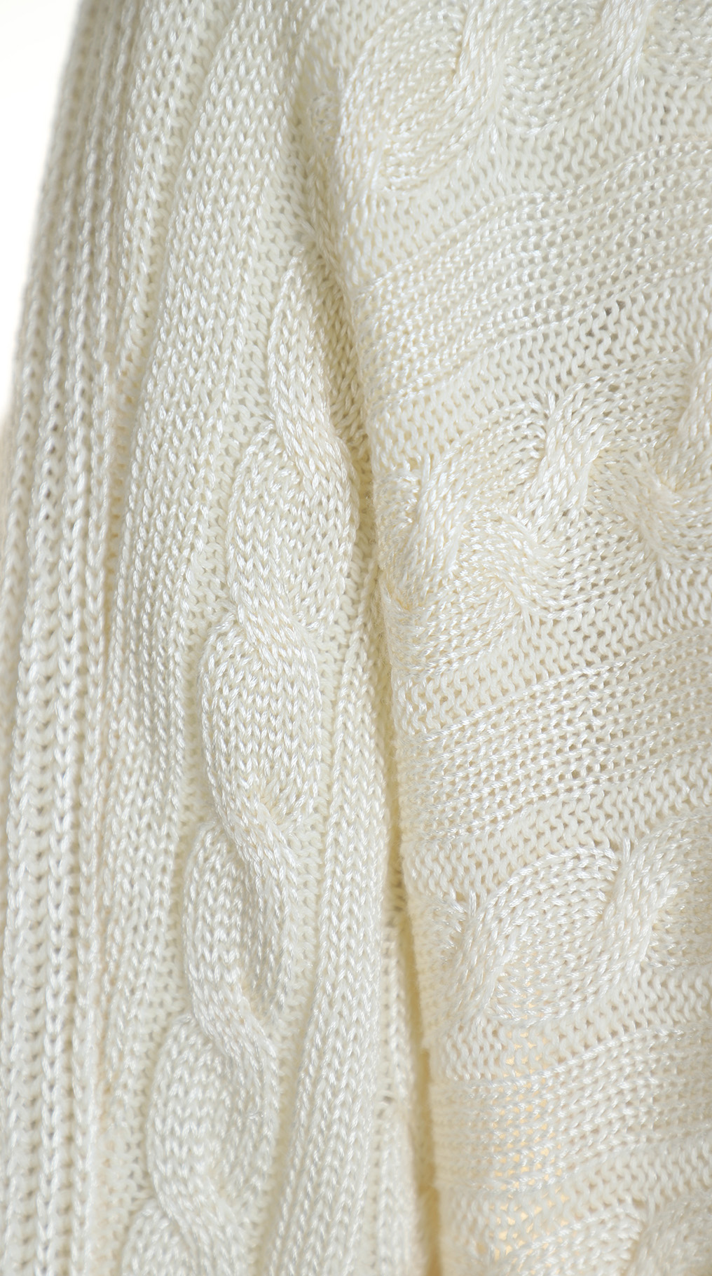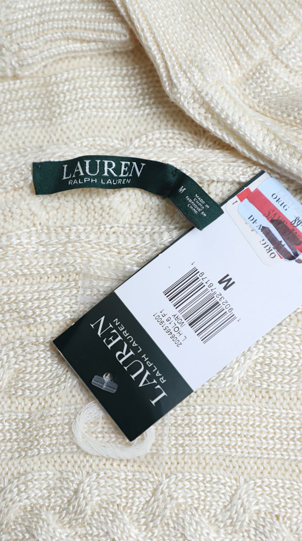 Новый трикотажный джемпер Ralph Lauren кремового цвета фактурной вязкой «косами». Свободный фасон с приспущенным рукавом реглан длиной 3/4 и скругленной горловиной. В составе: 44% вискоза, 56% хлопок — ткань средней плотности, мягкая, хорошо драпируется. Состояние — новое.