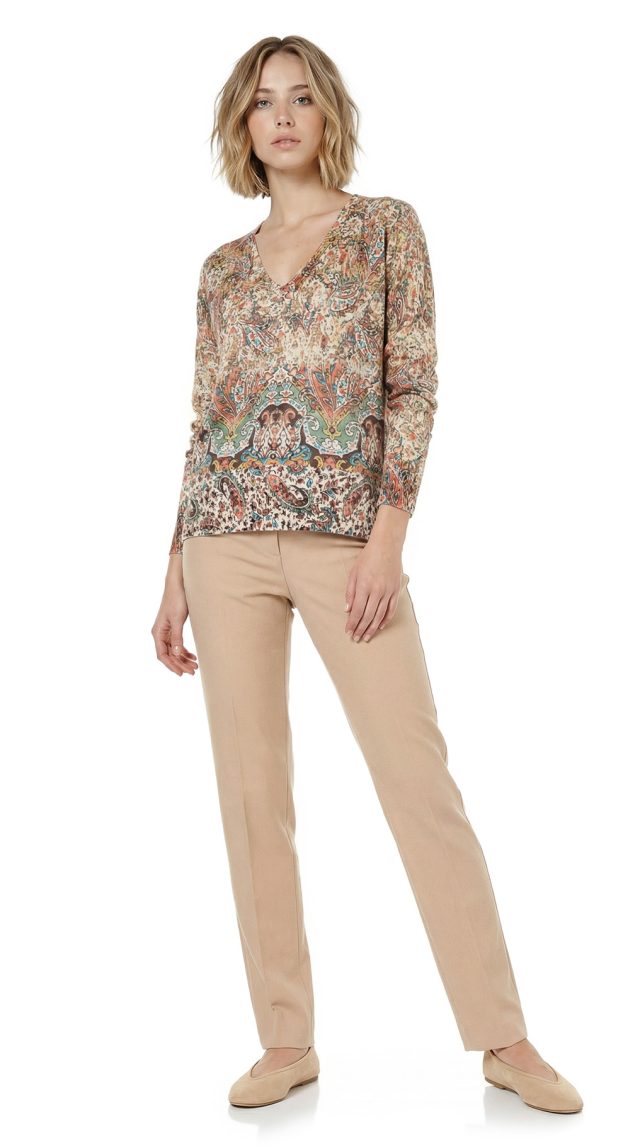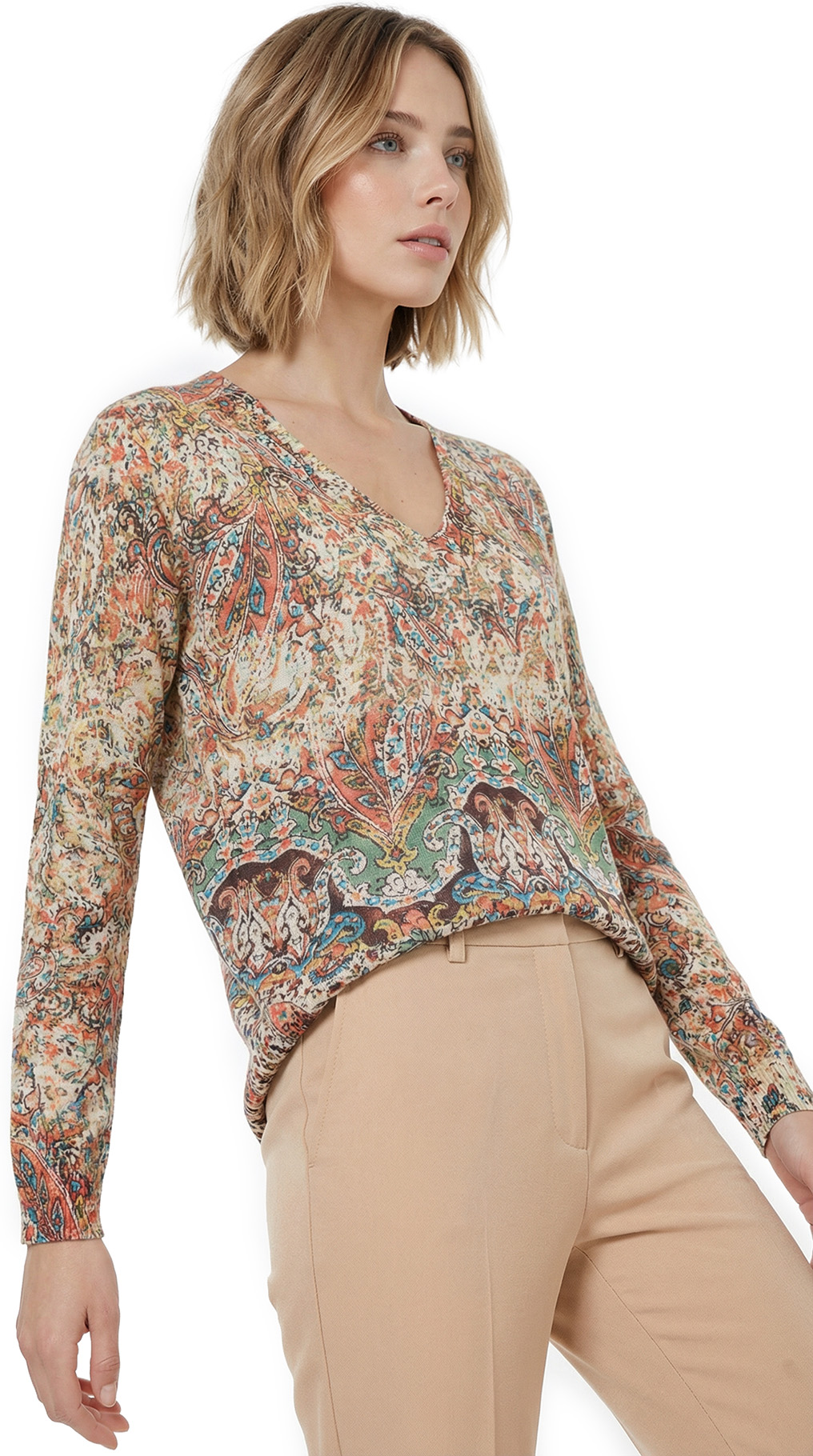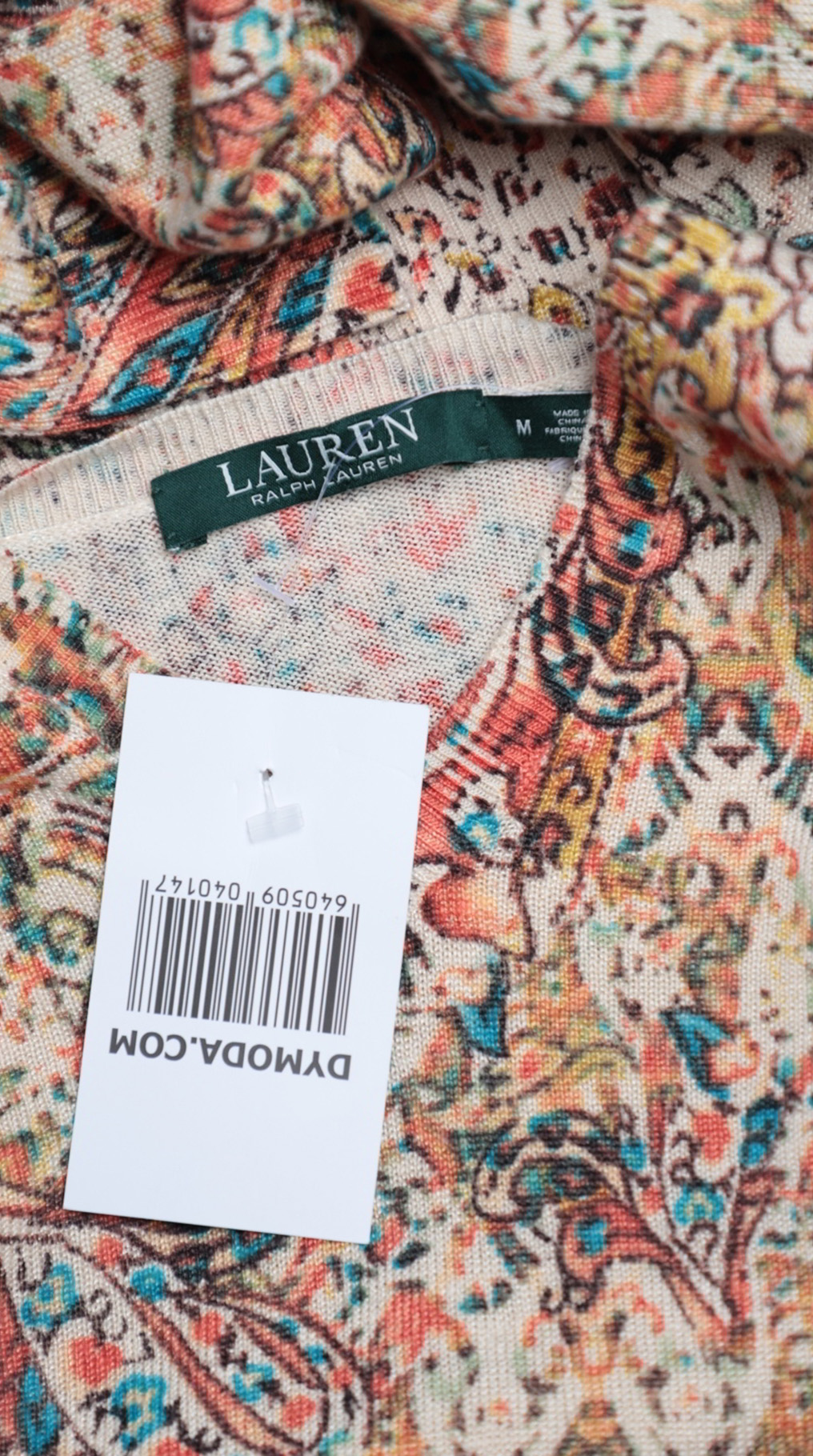 Новый стильный джемпер Ralph Lauren с ярким цветочным принтом в бежевых, рыжих и салатовых тонах. Свободный прямой фасон с широкой резинкой, V-образной горловиной, подчеркивающей декольте, и длинным приспущенным рукавом. В составе: 39% лен, 33% вискоза, 28% хлопок — ткань мягкая, эластичная. Состояние — новое, с биркой.