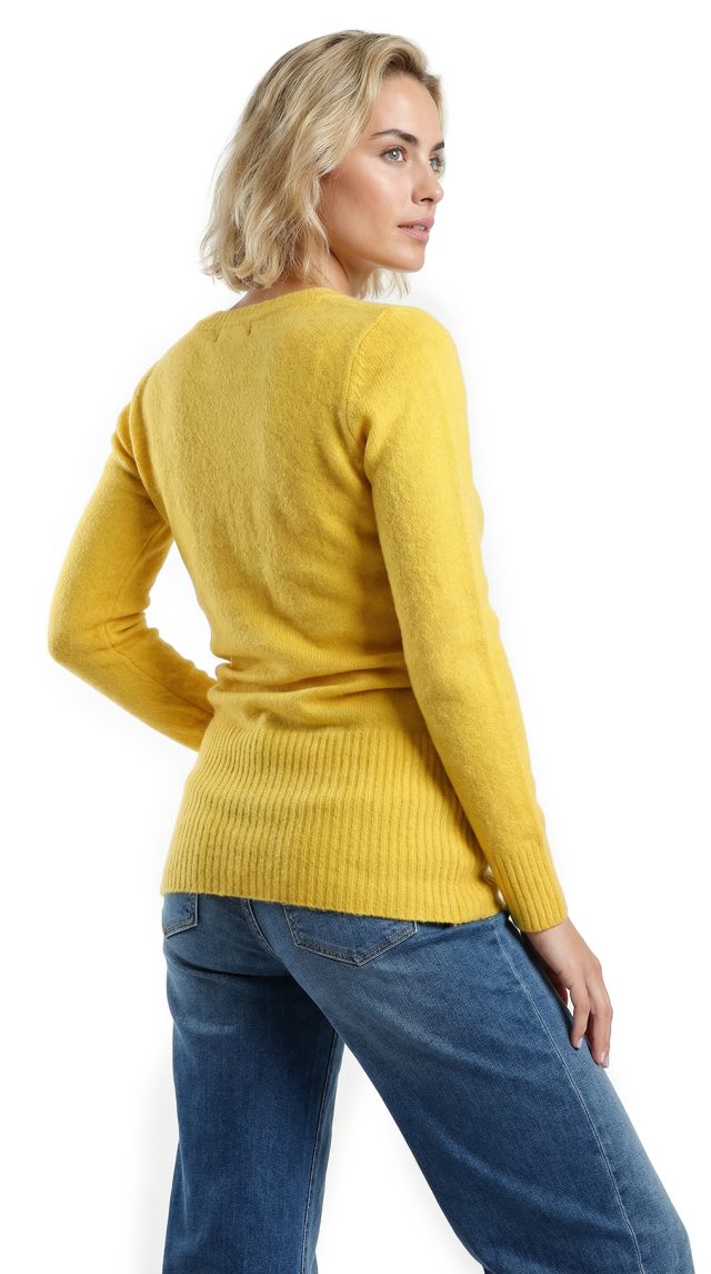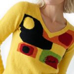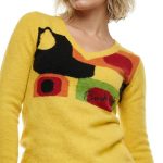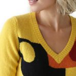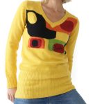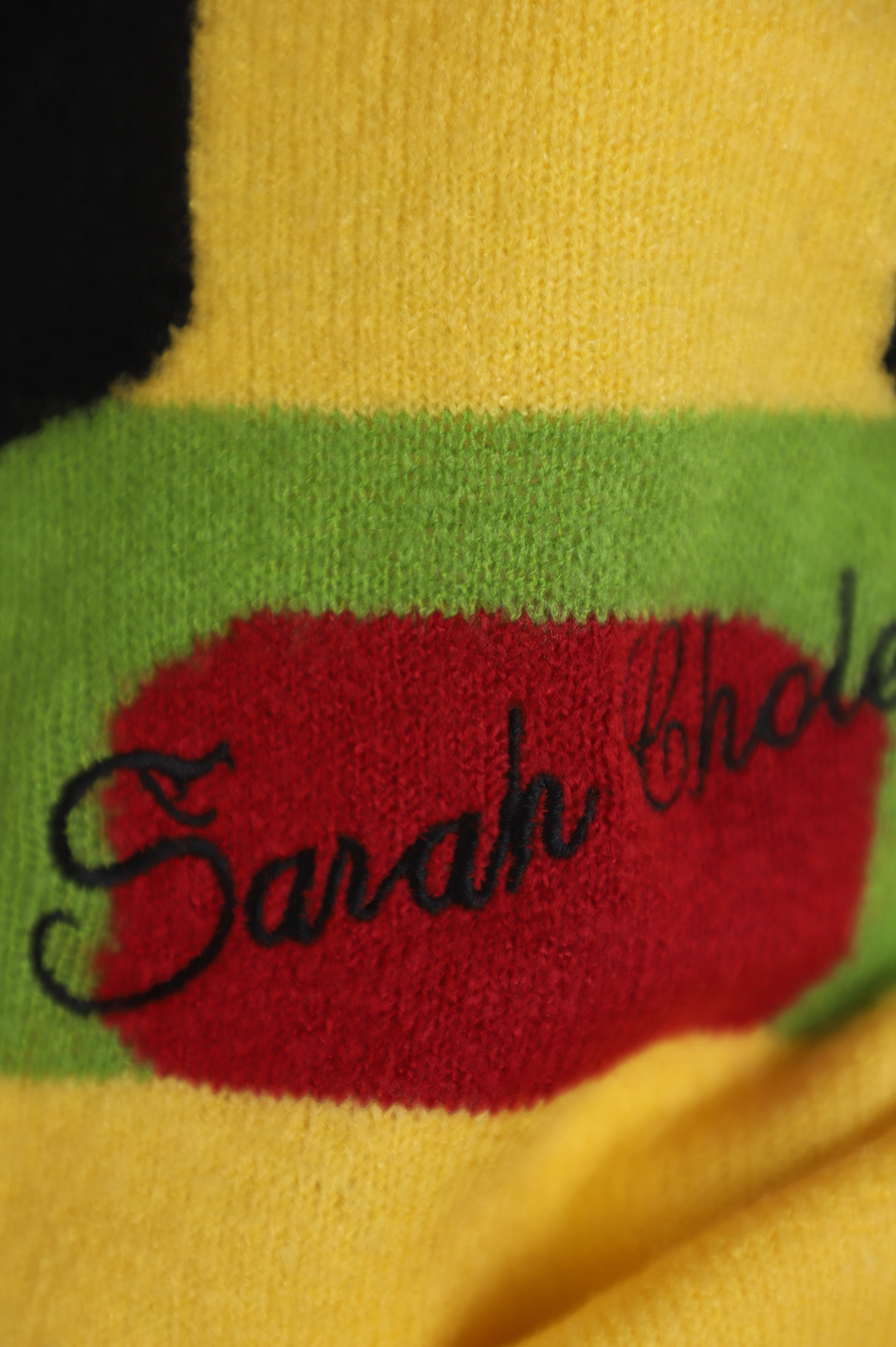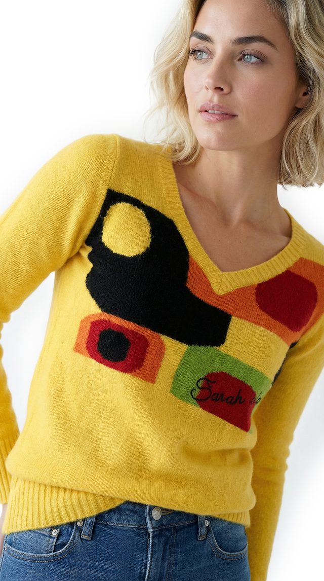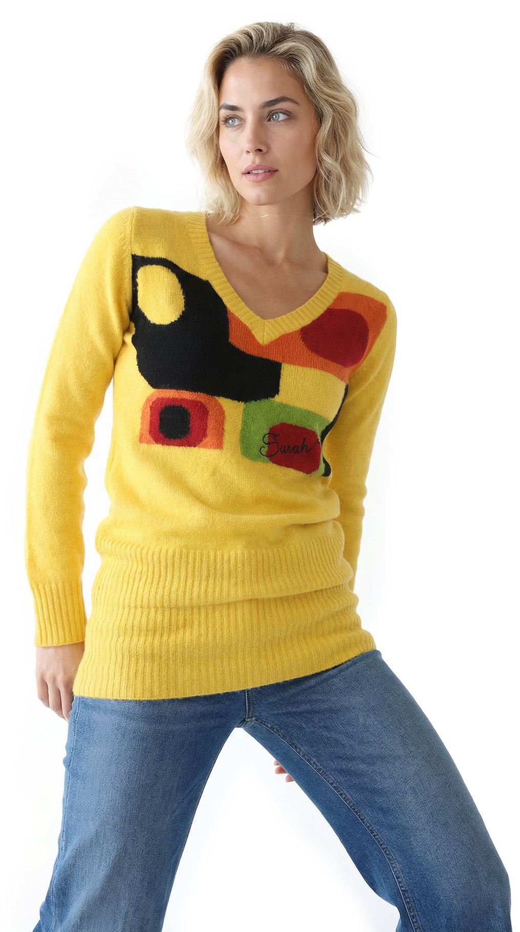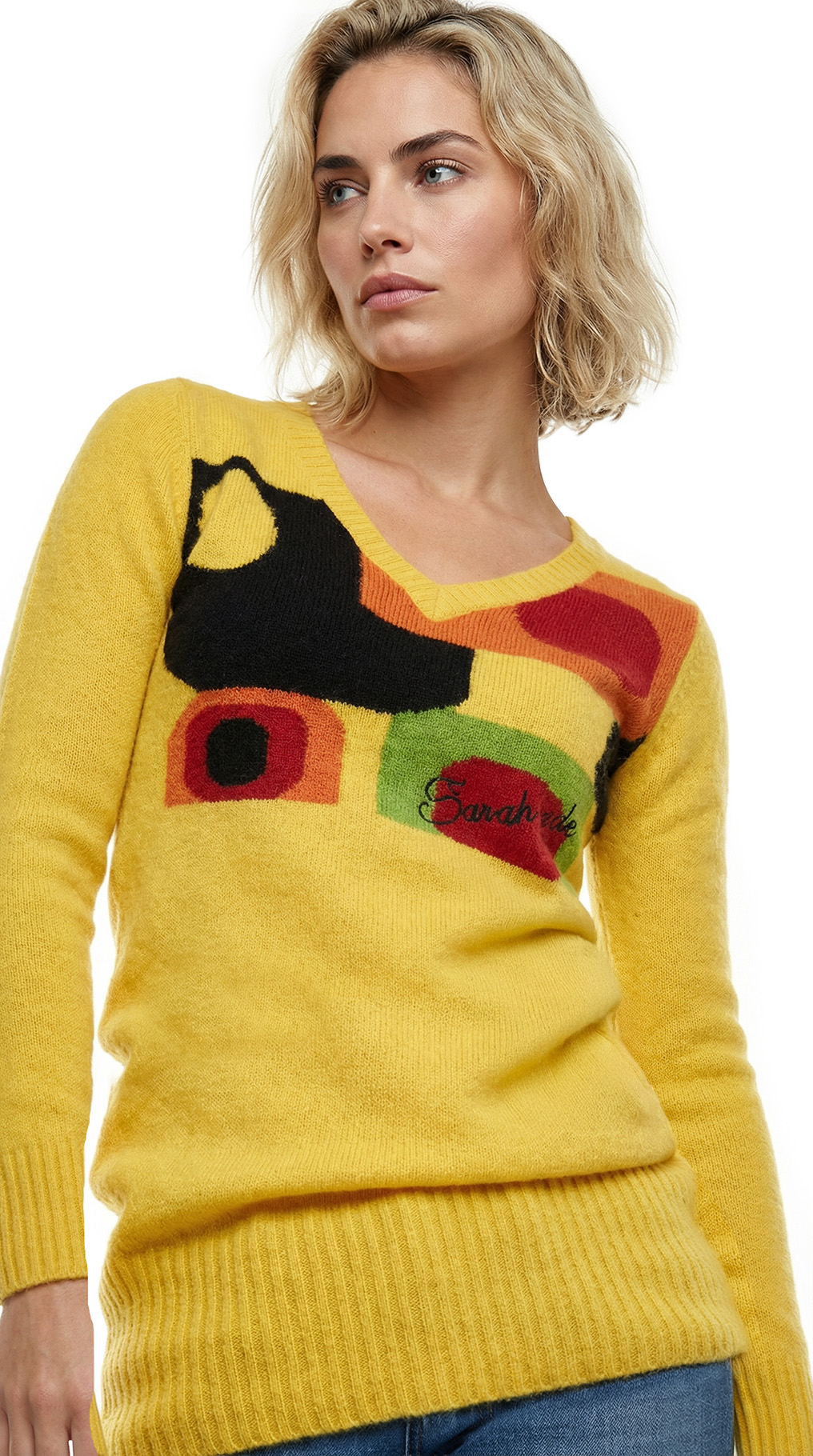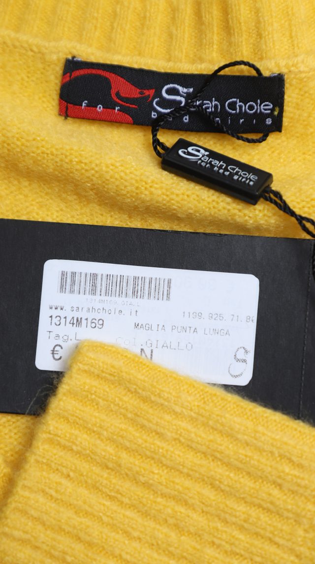 Новый джемпер итальянского бренда Sarah Chole яркого желтого цвета с геометрическим принтом в черно-рыже-бардово-салатовых тонах и фирменной вышивкой. Удлиненный фасон с длинным рукавом, V-образным вырезом горловины и широкой резинкой по бедрам. В составе 74% акрил, 26% полиамид — ткань очень мягкая, «пушистая», приятная к телу, хорошо тянется. Будет отлично смотреться с джинсами или брючками. Состояние — новое, с фирменной биркой Sarah Chole.