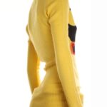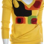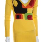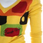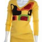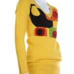 Новый джемпер итальянского бренда Sarah Chole яркого желтого цвета с геометрическим принтом в черно-рыже-бардово-салатовых тонах и фирменной вышивкой. Удлиненный фасон с длинным рукавом, V-образным вырезом горловины и широкой резинкой по бедрам. В составе 74% акрил, 26% полиамид — ткань очень мягкая, «пушистая», приятная к телу, хорошо тянется. Будет отлично смотреться с джинсами или брючками. Состояние — новое, с фирменной биркой Sarah Chole.