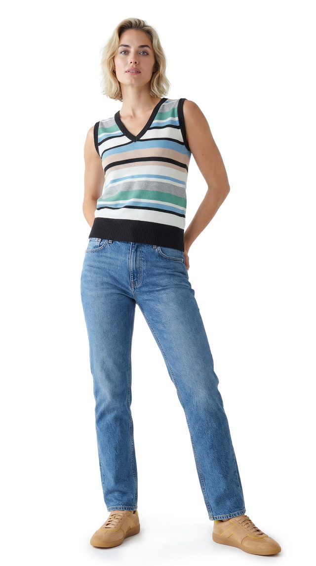 Новый джемпер «безрукавка» итальянского бренда Sarah Chole в полоску бежево-черно-зелено-голубых тонов. Аппликация логотипа бренда по спинке. V-образная горловина. Широкая резинка по бедрам. В составе 97% хлопок, 3% п.э — ткань легкая, мягкая, хорошо тянется. Состояние — новое, с фирменной биркой Sarah Chole.