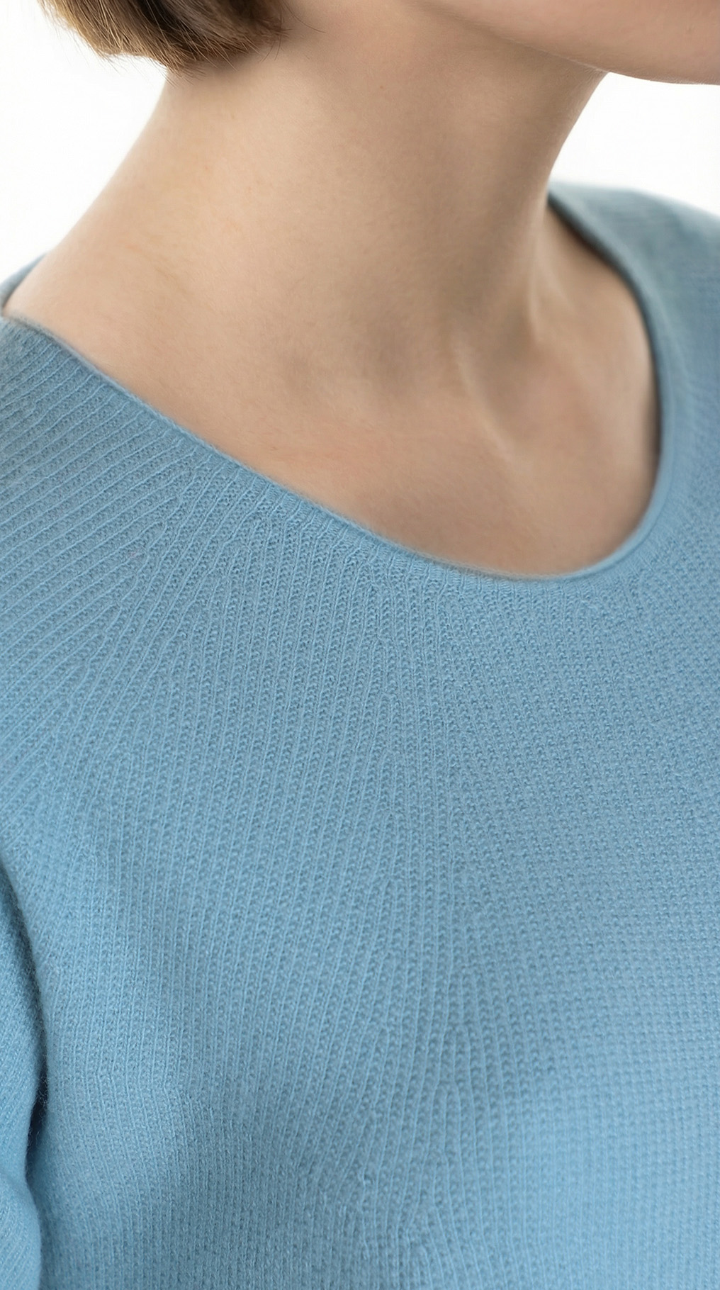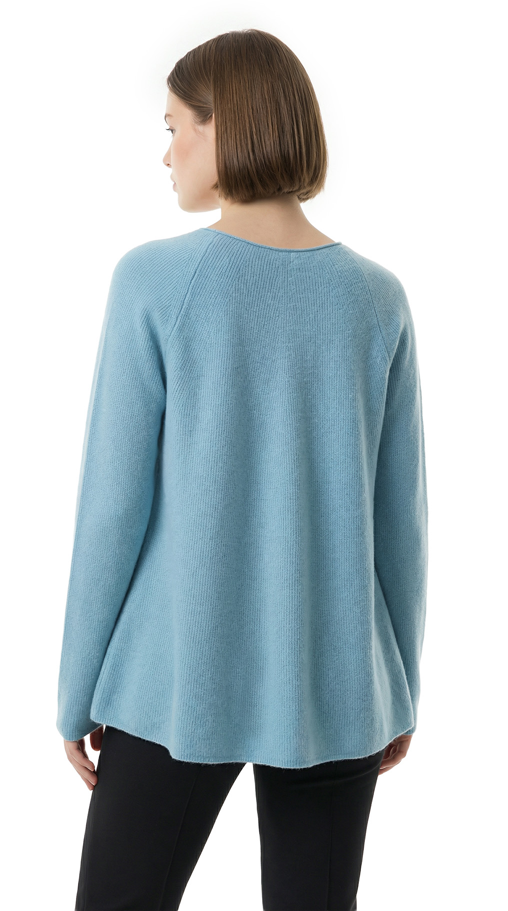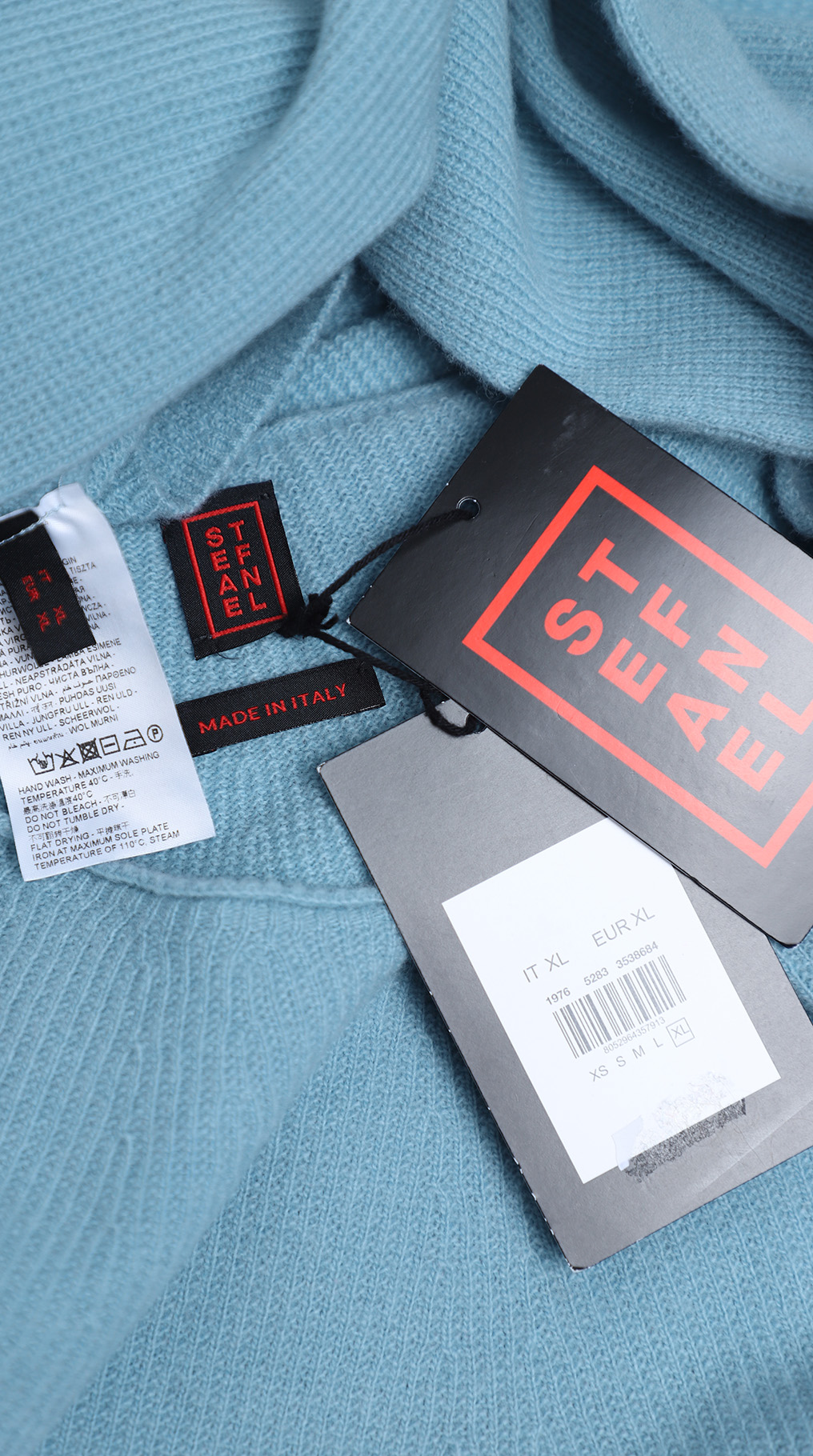 Новый джемпер итальянского премиального бренда Stefanel нежно-голубого цвета из 100% виргинской шерсти (virgin wool) — нежной, мягкой, как облачко, легкой как пушинка и в тоже время теплой. Свободный удлинённый, женственный, фасон «трапеция», свободно ниспадающий волнами от груди — визуально скрывает бедра и подчеркивает грудь. Длинный приспущенный рукав. Скругленная горловина. Состояние — новое, с оригинальной биркой магазина Stefanel.
