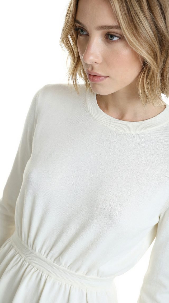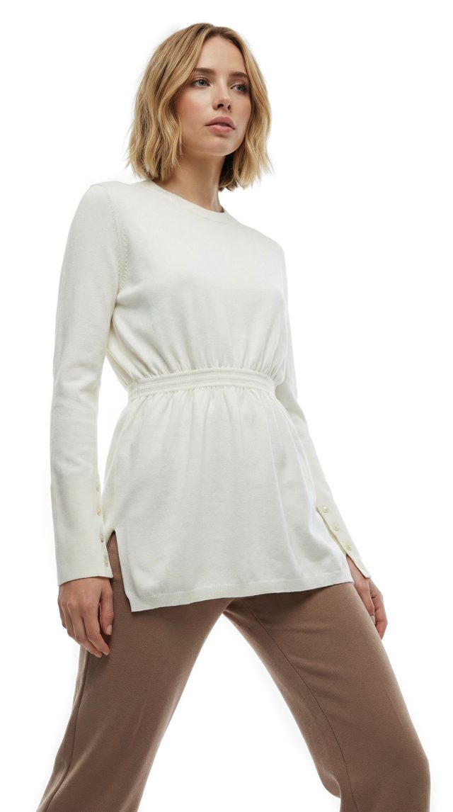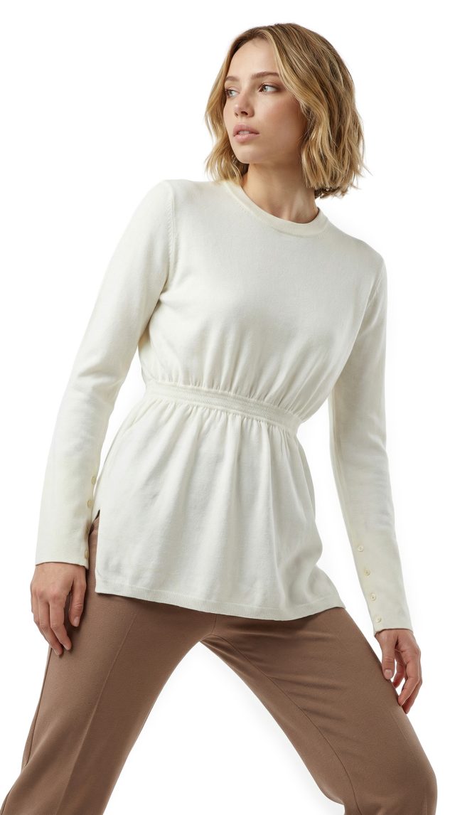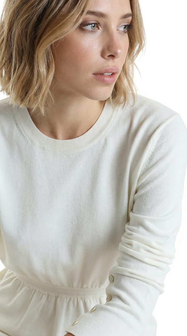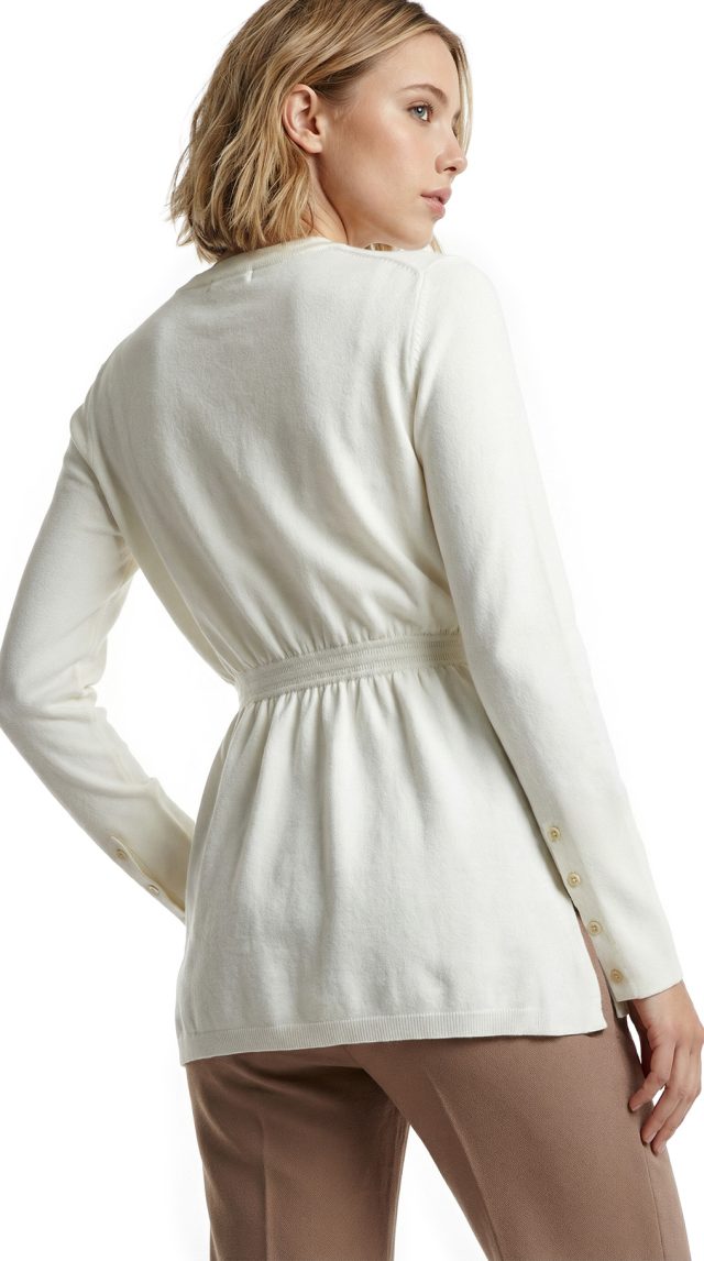 Новый трикотажный джемпер Stefanel молочного цвета. Женственный фасон с длинным рукавом, декорированным перламутровыми пуговками, и резинкой по талии. В составе: 70% вискоза, 30% п.э: ткань экстра качества: очень мягкая, легкая, приятная в носке. Состояние — новое, с оригинальной биркой магазина Stefanel.
