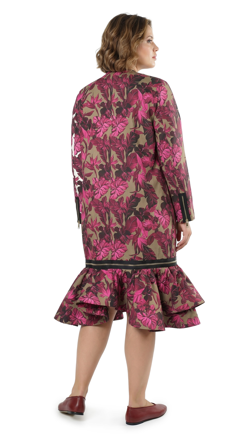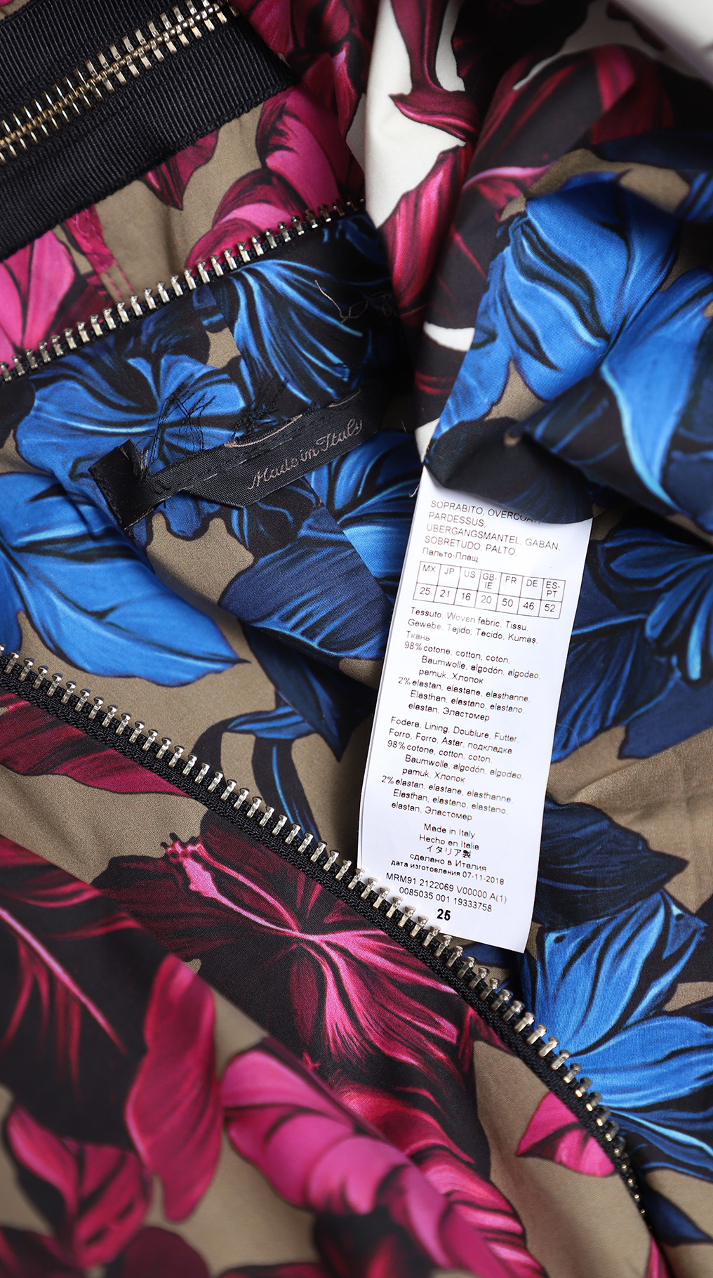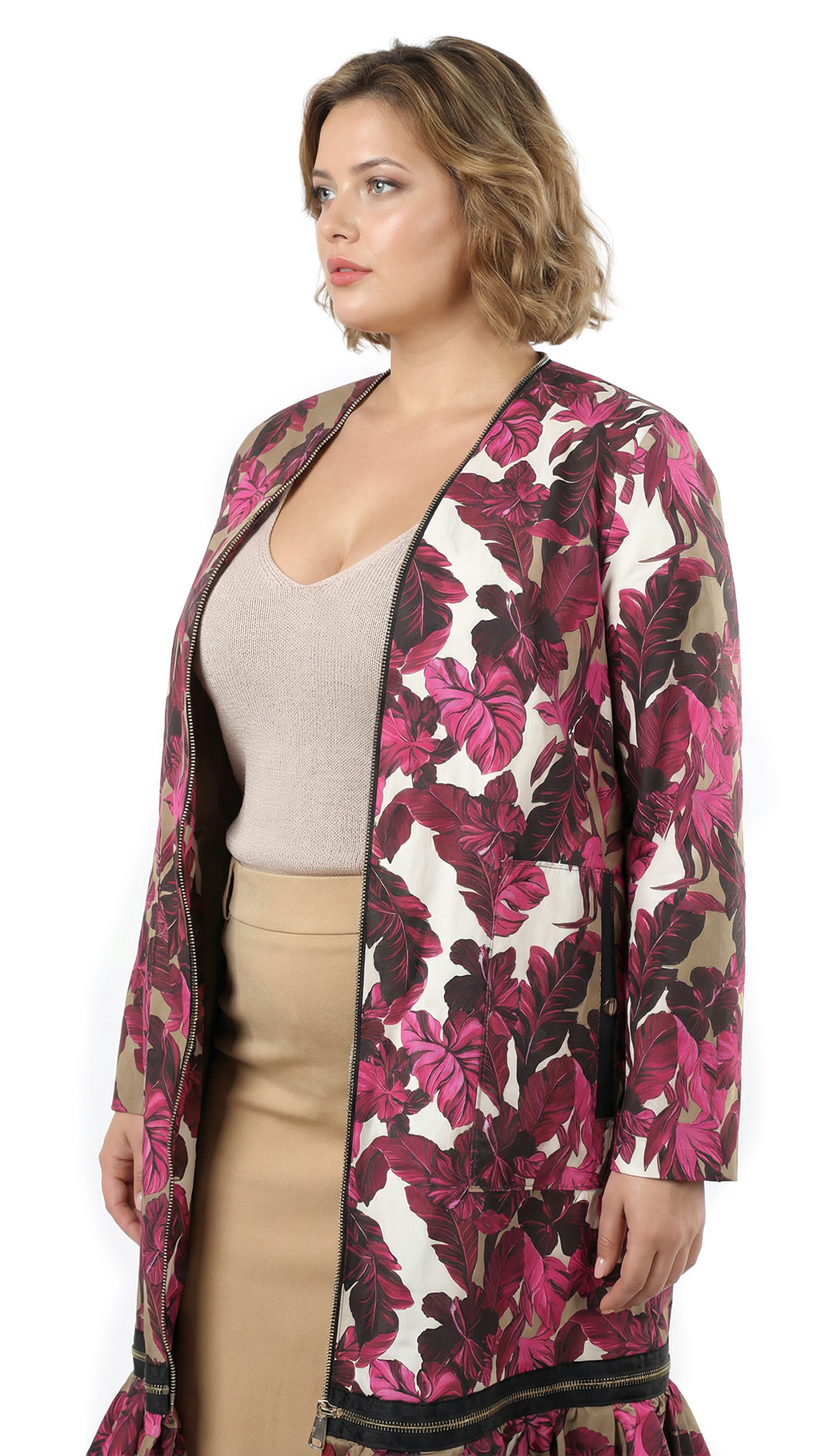Оригинал. Новый эффектный хлопковый кардиган-плащ концерна Max Mara (линия Marina Rinaldi) с ярким цветочным принтом в малиново-бордовых тонах (по лицу) и синих (по изнанке) на белом и светло-оливковом фоне. Прямой удлиненный фасон на запах, без застежки, с пышной кокеткой по низу (не отстегивается). V-образный вырез горловины. Длинный рукав с молнией. Большие накладные кармашки на кнопках. Массивная золотая молния (на кокетке и в отделке проймы). Яркий, стильный, вариант на весну и прохладное лето. В составе: 98% хлопок, 2% эластан (по лицу и изнанке) — ткань экстра качества: плотная, мягкая на ощупь. Пошив — Италия. Состояние — новое, из аутлета концерна MaxMara (ярлык бренда надрезан — это политика аутлета).