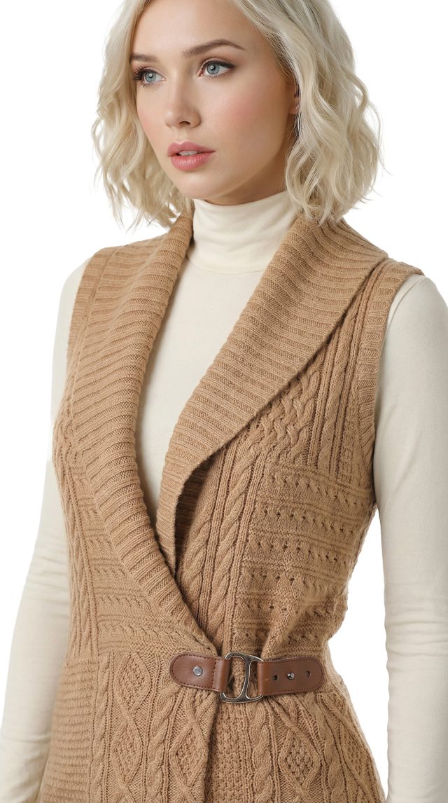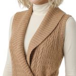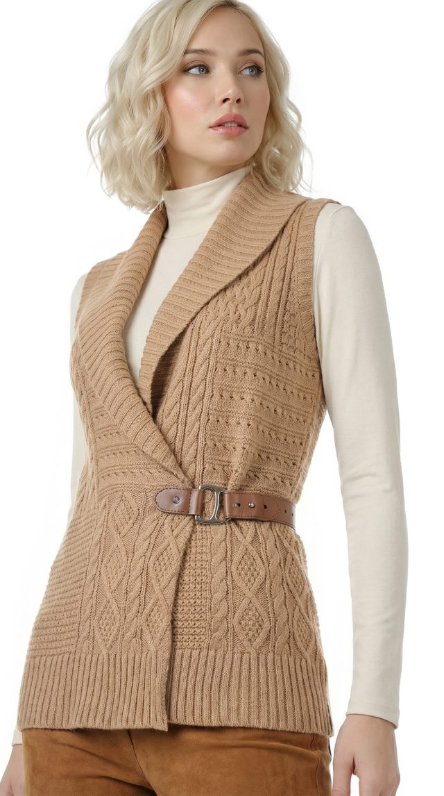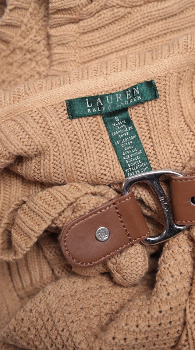 Вязаный кардиган Ralph Lauren бежевого цвета красивой вязкой «косами», «ромбами» и «шашечками», застежкой на пряжку с гравировкой RLR и объемным воротником «шалька». Женственный приталенный удлиненный фасон «безрукавка». В составе: 60% хлопок, 40% акрил: ткань мягкая, хорошо облегает фигурку. Состояние — отличное.