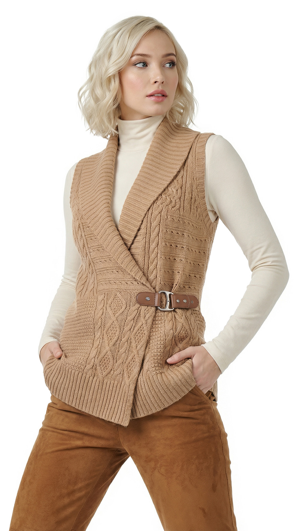 Вязаный кардиган Ralph Lauren бежевого цвета красивой вязкой «косами», «ромбами» и «шашечками», застежкой на пряжку с гравировкой RLR и объемным воротником «шалька». Женственный приталенный удлиненный фасон «безрукавка». В составе: 60% хлопок, 40% акрил: ткань мягкая, хорошо облегает фигурку. Состояние — отличное.