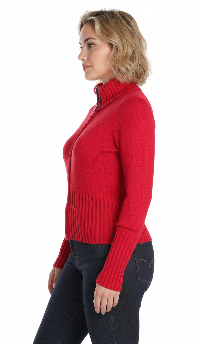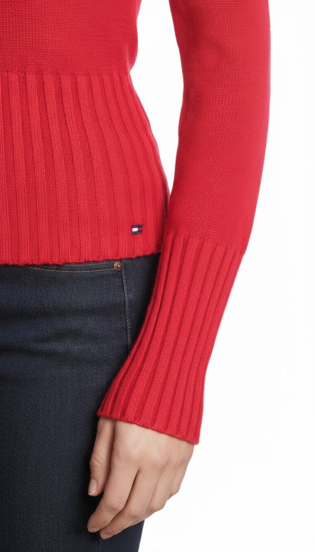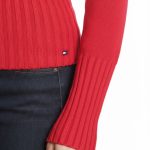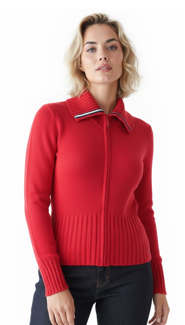 Трикотажный кардиган Tommy Hilfiger яркого красного цвета. Стильный приталенный фасон. Объемный воротничок «хомут с фирменными полосами. Застежка на молнию. Длинный рукав с широкой манжетой. Широкая резинка по талии. Вышивка логотипа. В составе: 100% хлопок — ткань плотная, эластичная, вязкой резинка (хорошо тянется и облегает фигурку). Состояние — отличное.