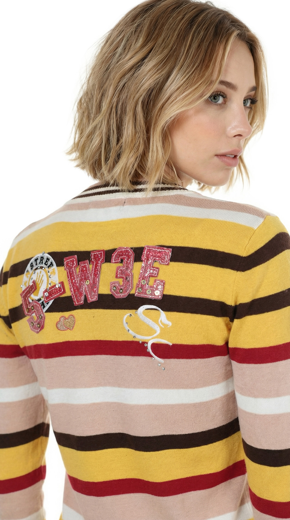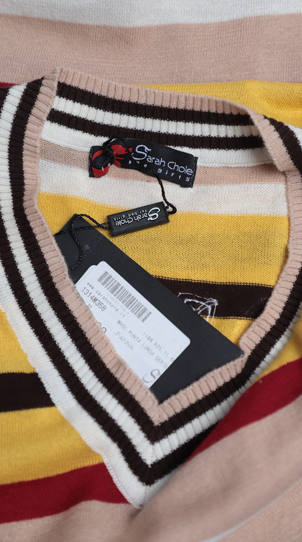 Новое яркое трикотажное платье свитер итальянского бренда Sarah Chole в разноцветную полоску. Приталенный фасон с длинным рукавом и v-образным вырезом горловины. Широкая резинка по низу. Накладные кармашки. Аппликация и стразы по спинке. В составе 97% хлопок, 3% п.э — ткань легкая, мягкая, хорошо тянется. Состояние — новое, с фирменной биркой Sarah Chole.