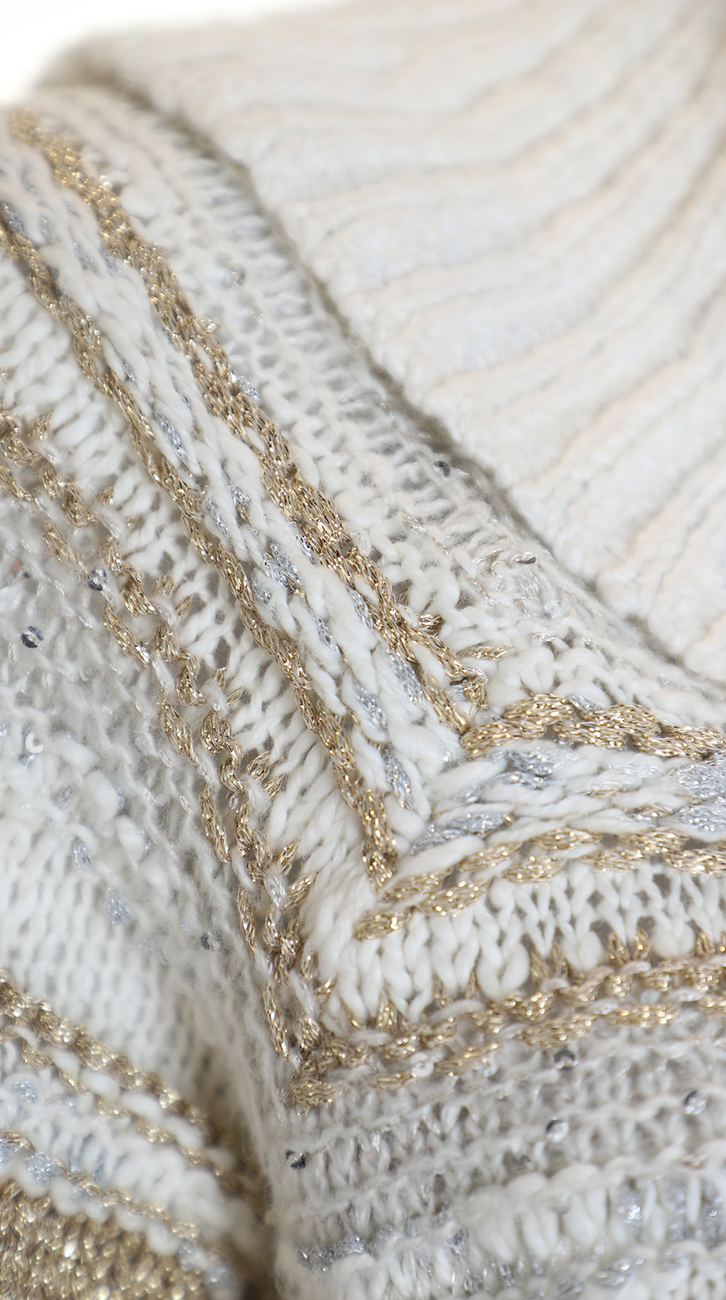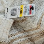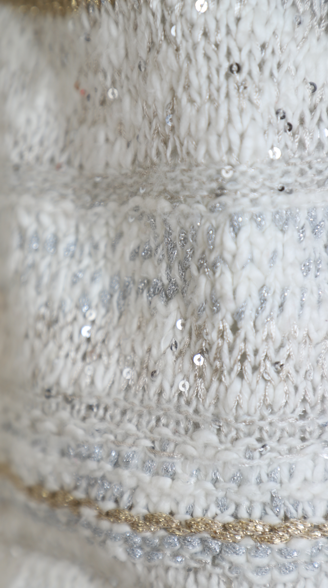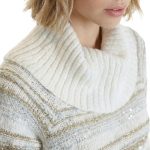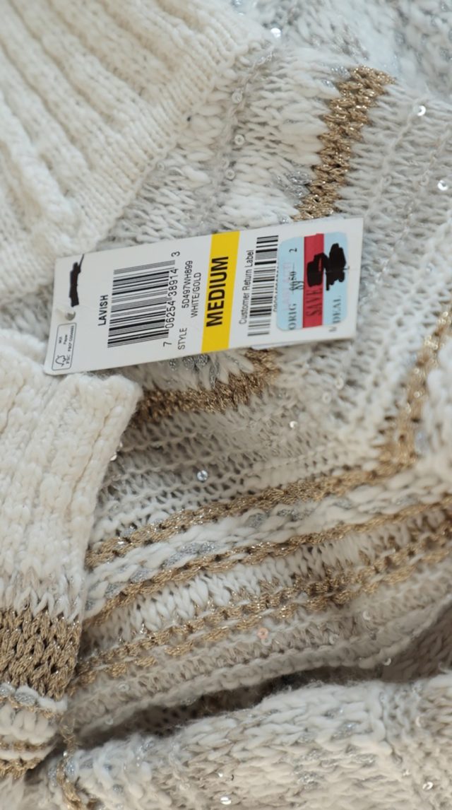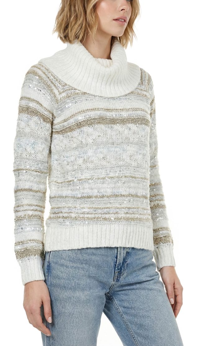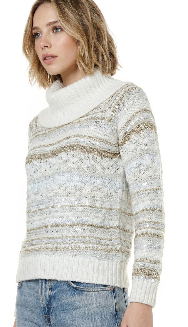 Новый трикотажный хлопковый свитер американского бренда Inc молочно-белого цвета с золотыми и серебряными нитями и вшитыми пайетками. Объемный воротник «хомут». Длинный рукав. Широкая резинка по бедрам. В составе: 73% хлопок, 14% п.э, 5% нейлон, 8% др — полотно плотной вязки, объемное. Состояние — новое, с фирменной биркой INC. Цена на бирке — 89.5$.