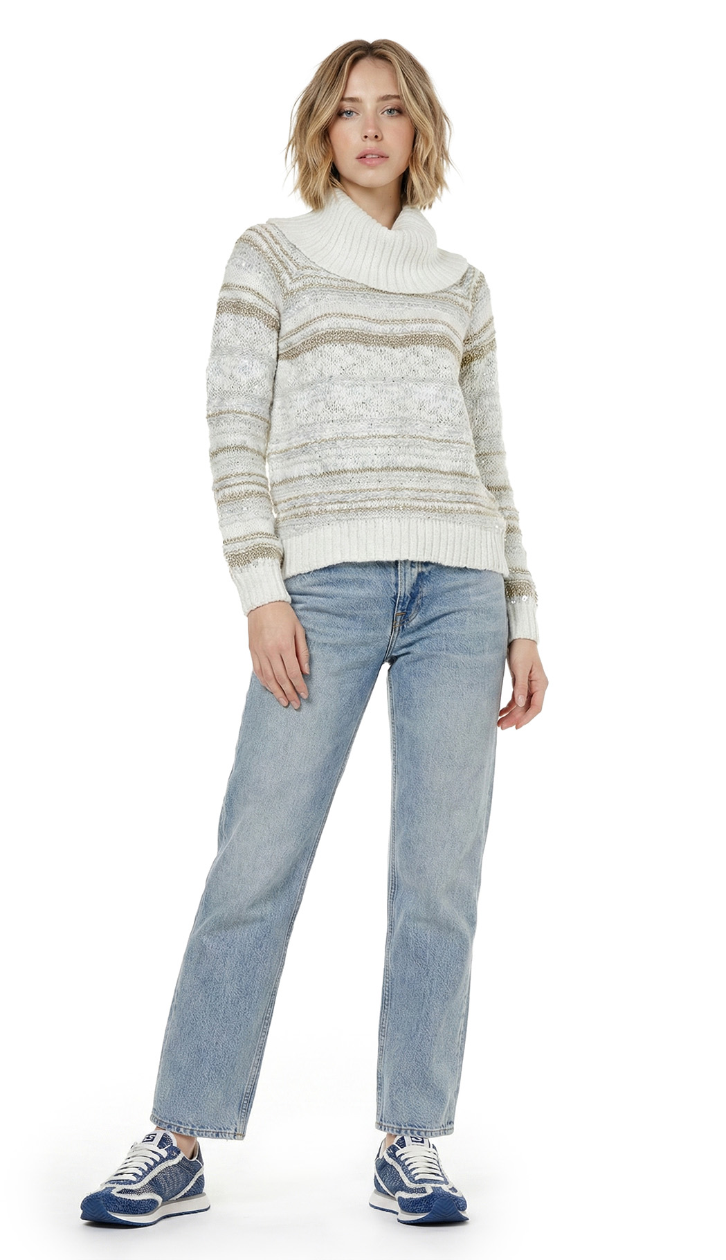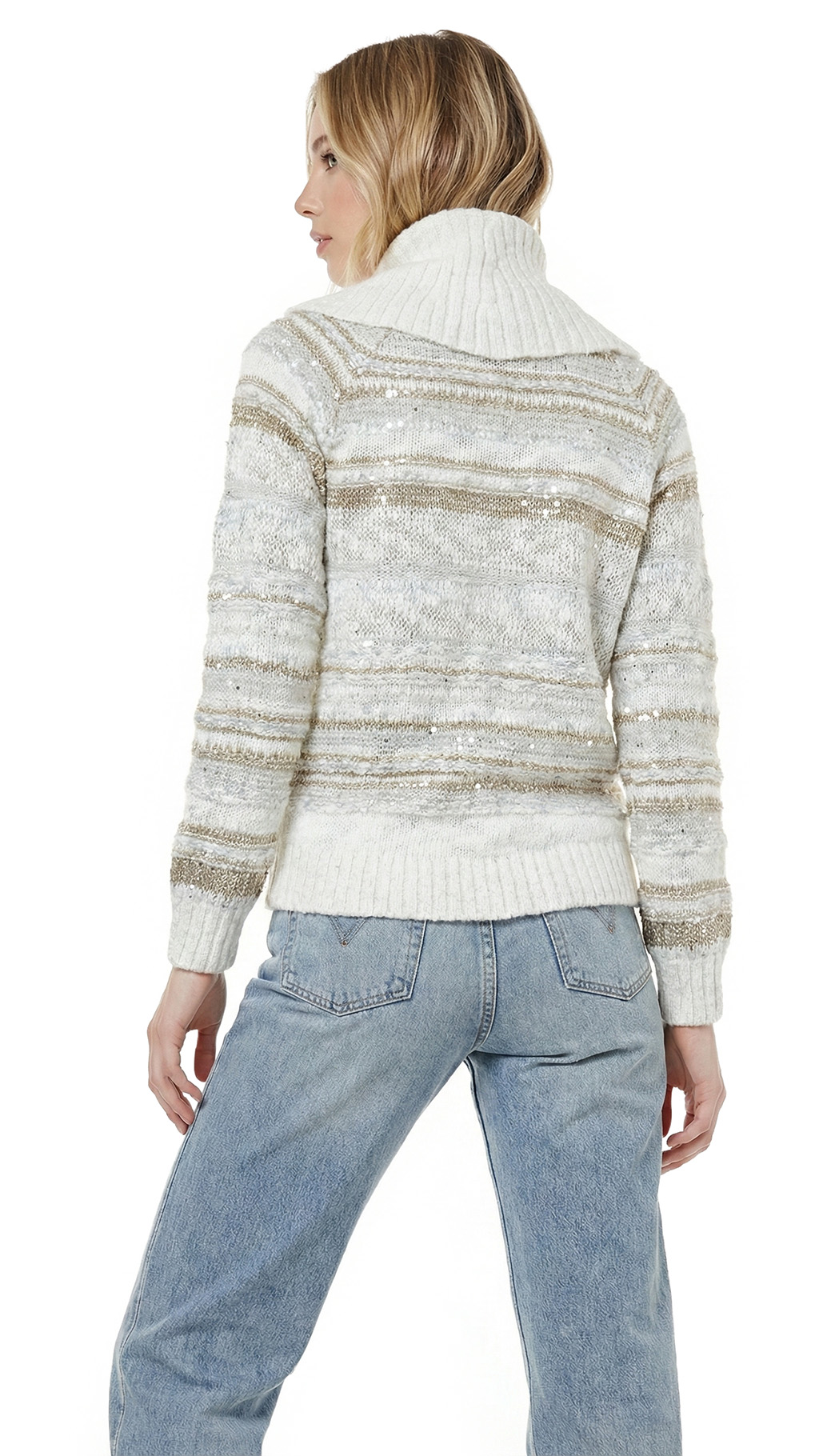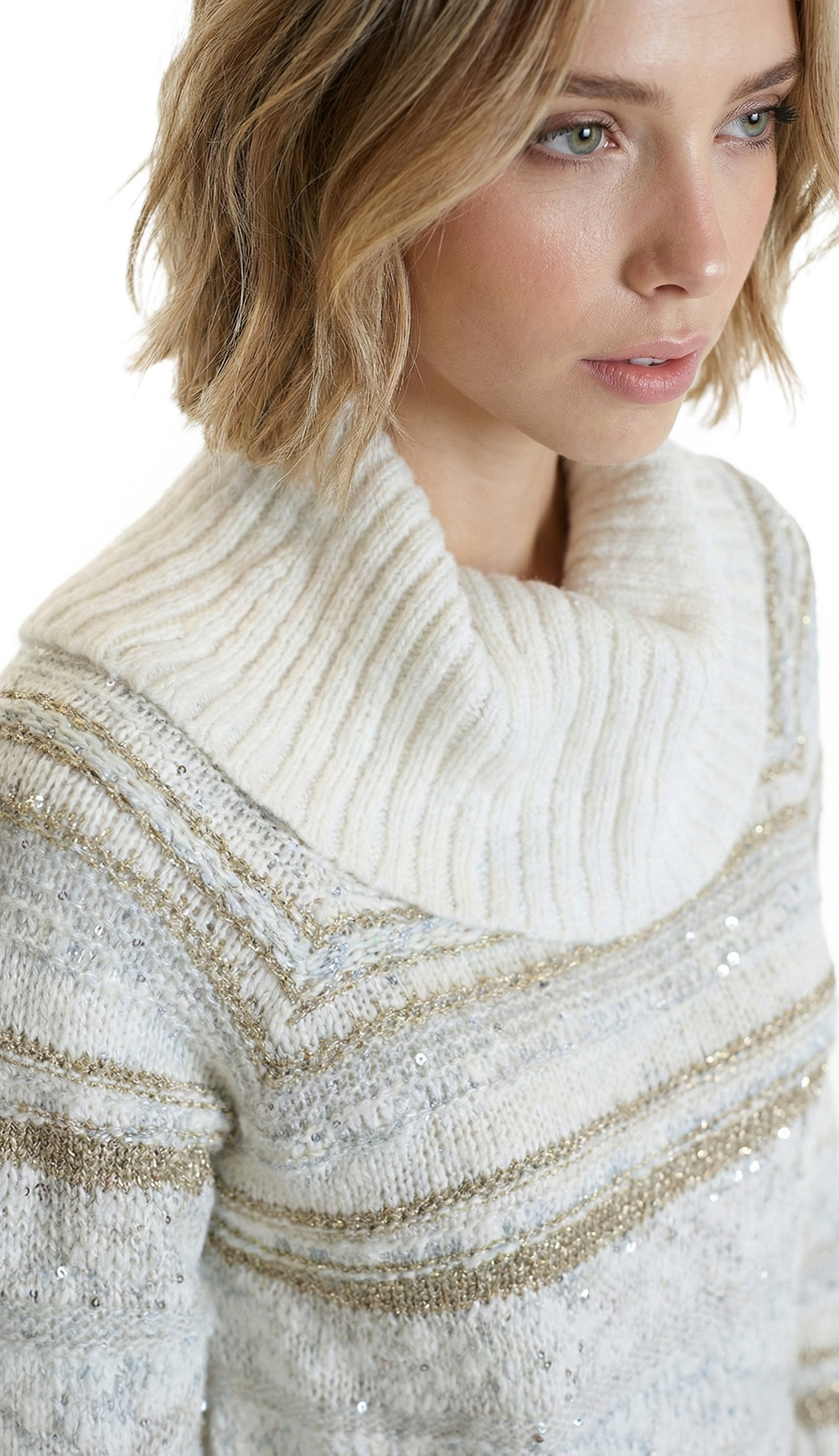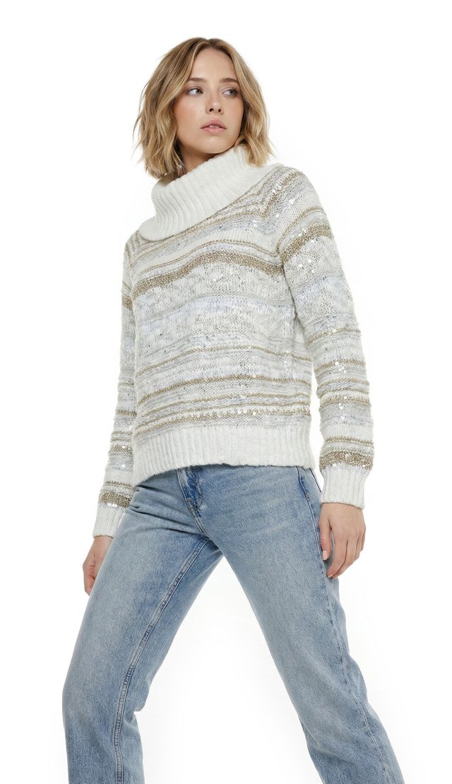 Новый трикотажный хлопковый свитер американского бренда Inc молочно-белого цвета с золотыми и серебряными нитями и вшитыми пайетками. Объемный воротник «хомут». Длинный рукав. Широкая резинка по бедрам. В составе: 73% хлопок, 14% п.э, 5% нейлон, 8% др — полотно плотной вязки, объемное. Состояние — новое, с фирменной биркой INC. Цена на бирке — 89.5$.