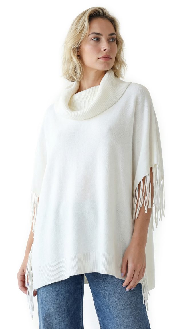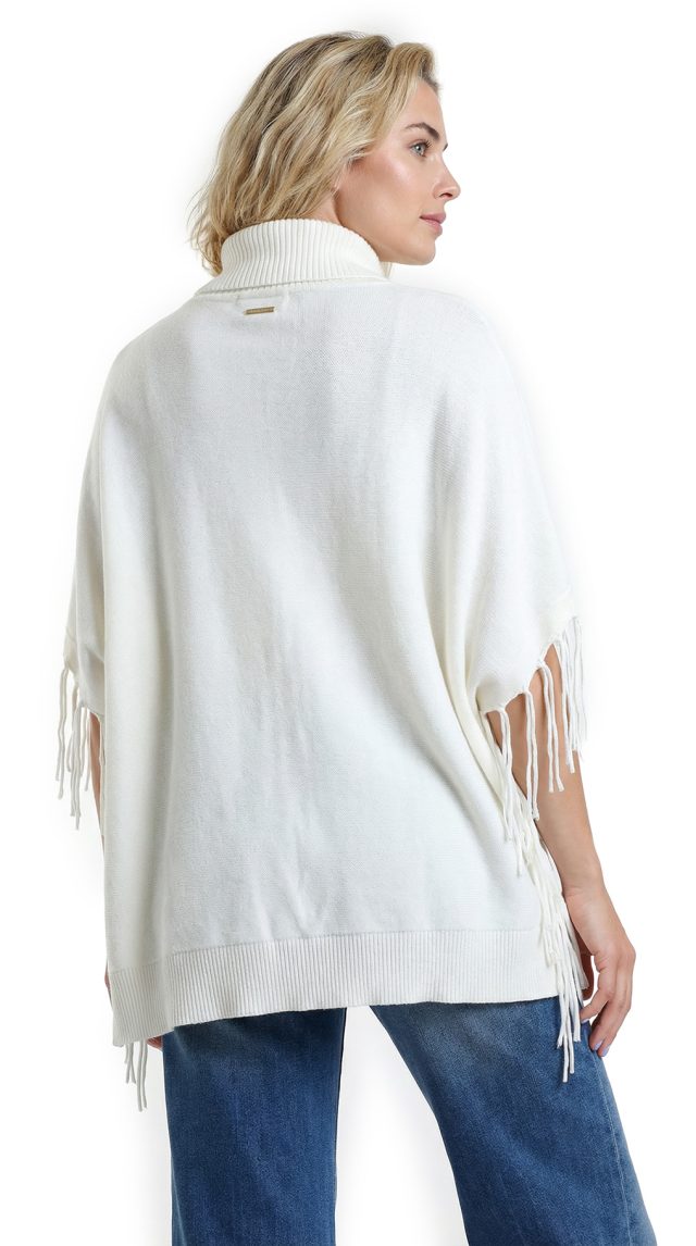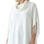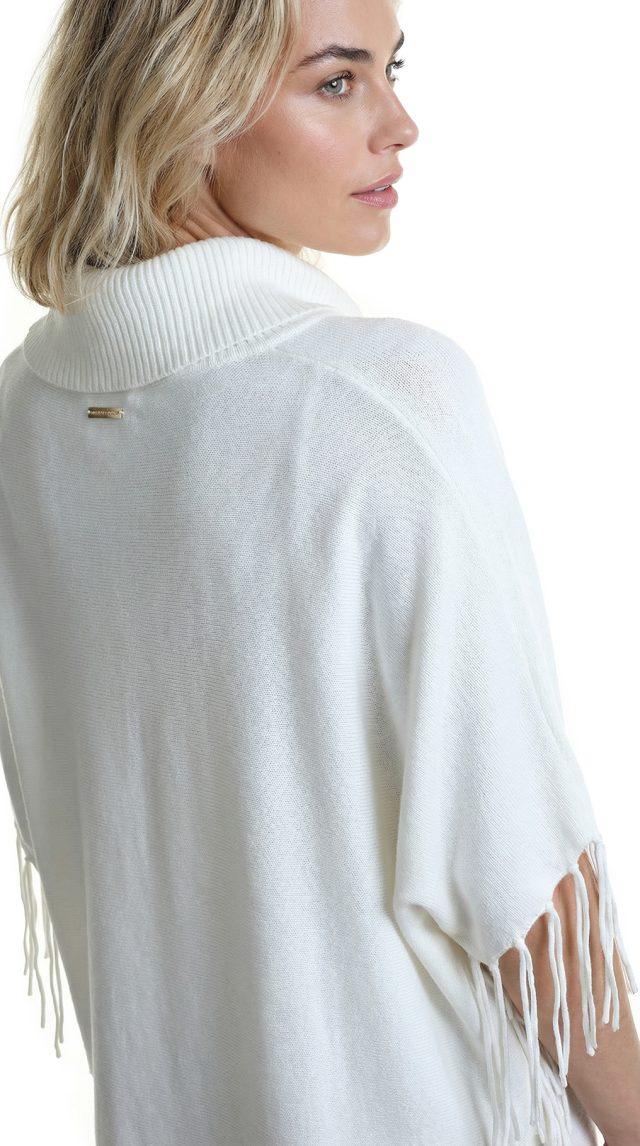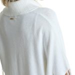 Новый трикотажный свитер Michael Kors теплого молочного цвета. Свободный прямой удлиненный фасон с объемным воротничком-хомут и приспущенным рукавом длиной 1/2, декорированным бахромой. Фирменная золотая плашка Michael Kors по спинке. В составе: 51% хлопок, 41% вискоза, 8% нейлон — ткань мягкая, приятная к телу. Состояние — новое, без бирки.