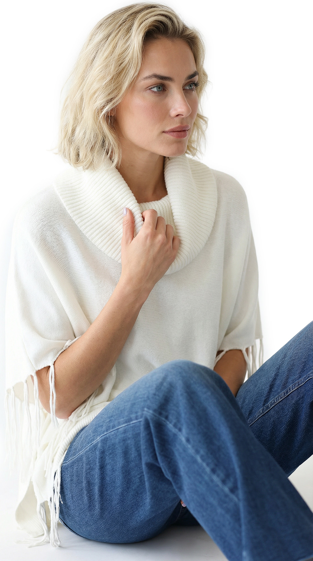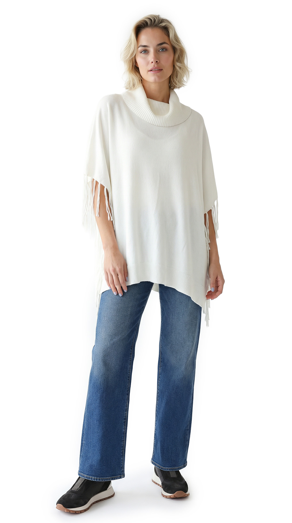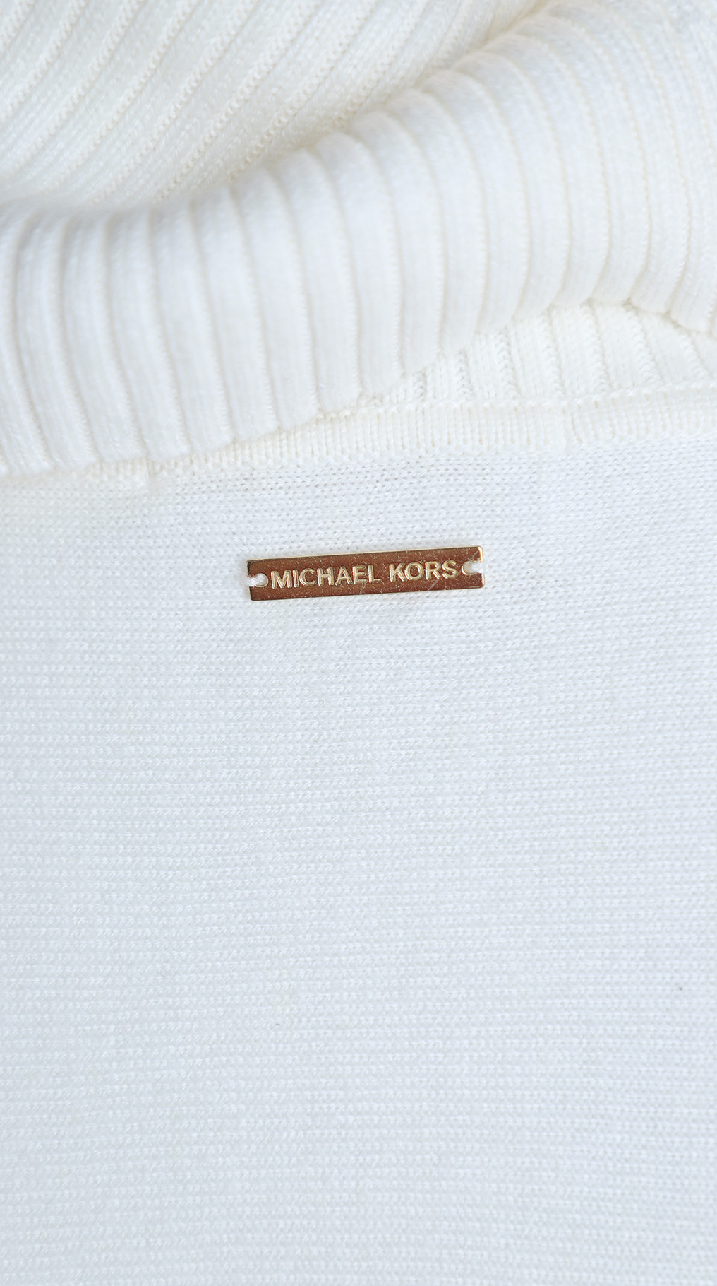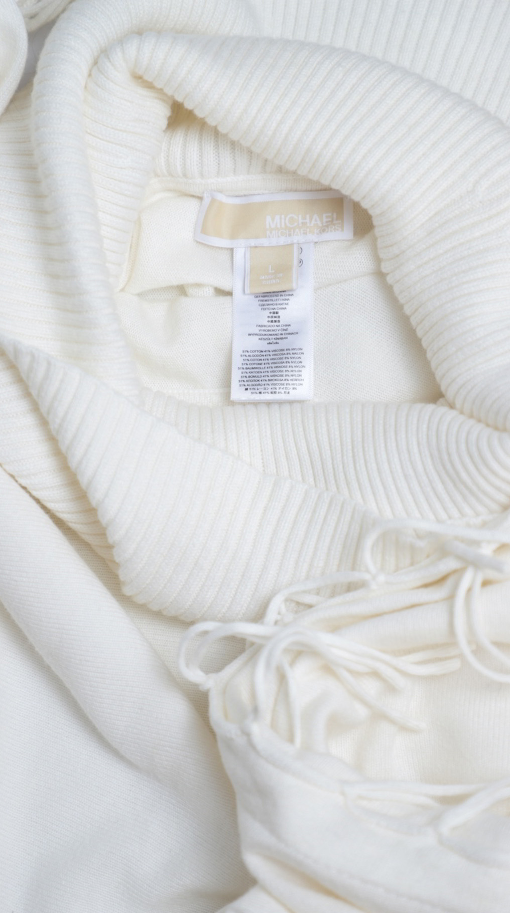 Новый трикотажный свитер Michael Kors теплого молочного цвета. Свободный прямой удлиненный фасон с объемным воротничком-хомут и приспущенным рукавом длиной 1/2, декорированным бахромой. Фирменная золотая плашка Michael Kors по спинке. В составе: 51% хлопок, 41% вискоза, 8% нейлон — ткань мягкая, приятная к телу. Состояние — новое, без бирки.