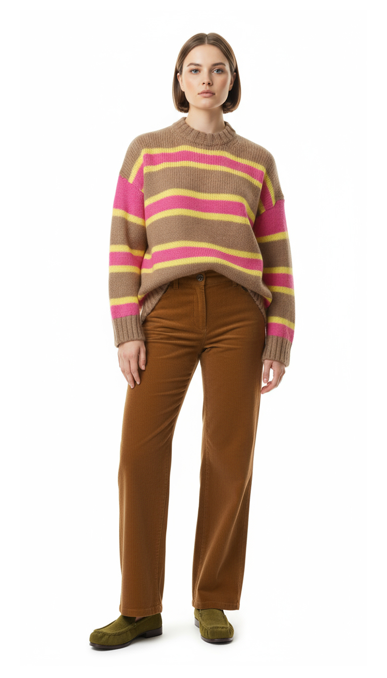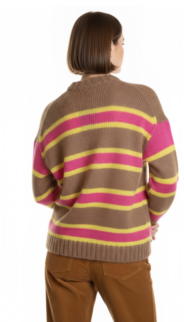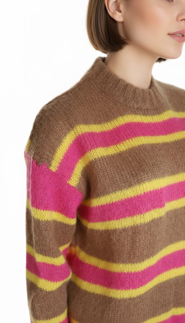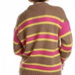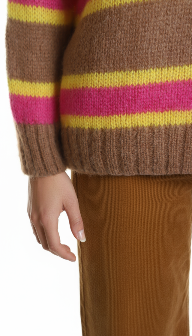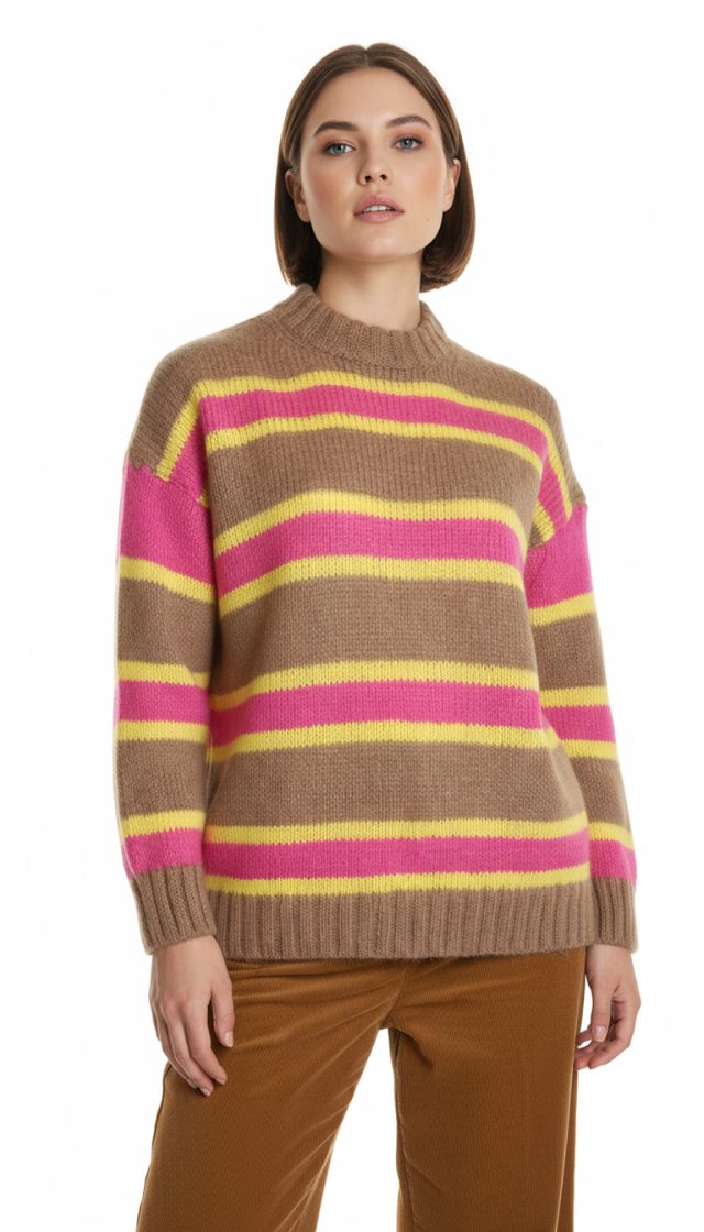 Оригинал из Италии. Новый яркий шерстяной свитер итальянского премиального бренда Stefanel в бежево-розово-желтую полосу. Свободный фасон с воротничком стойкой, длинным приспущенным рукавом и широкой резинкой по бедрам. В составе: 33% натуральный мохер, 32% альпака, 35% полиамид — ткань легкая, очень мягкая, пуховая. Состояние — новое, с оригинальной биркой магазина Stefanel.