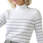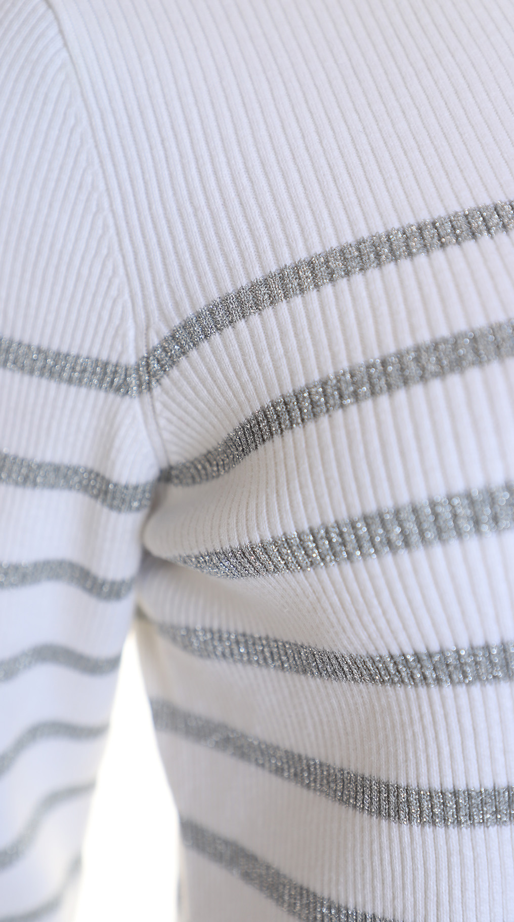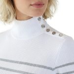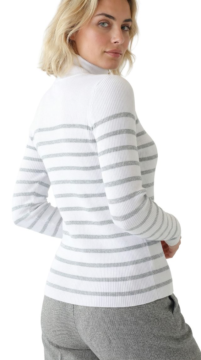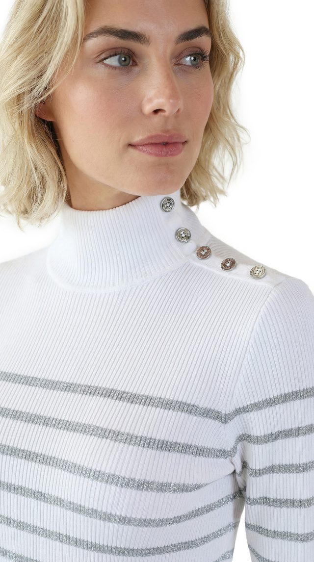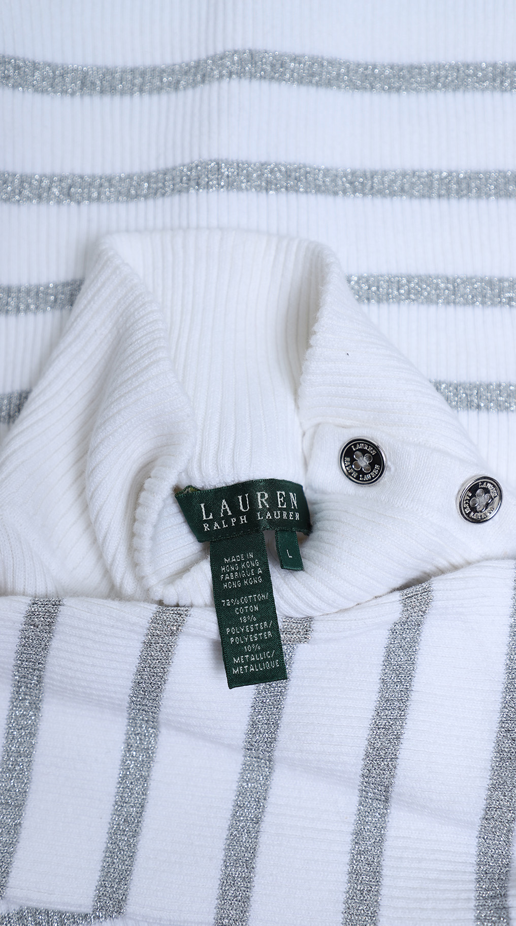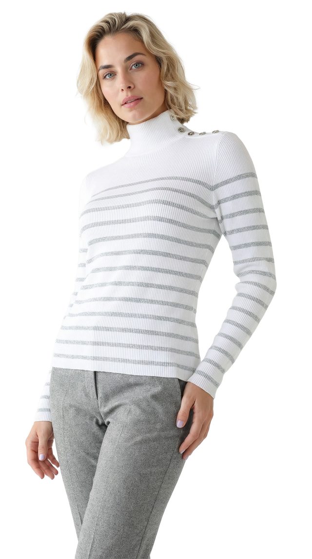 Трикотажная водолазка американского премиального бренда Ralph Lauren белого цвета с серебристыми полосами люрекса. Женственный фасон с длинным рукавом и горловиной стойка, декорированной фирменными пуговками с гравировкой бренда. Вязка резинкой — хорошо тянется и садится по фигурке. В составе: 72% хлопок, 18% п.э, 10% люрекс: ткань плотная, эластичная. Состояние — отличное.