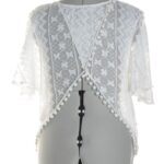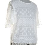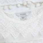 Ажурная хлопковая блуза Guess молочно-белого цвета. Свободный фасон с игривой спинкой, коротким рукавом и помпонами по низу. Смотрится мега-секси. Без застежки. В составе: 76% хлопок, 24% нейлон, перед на подкладе из п.э. Состояние — хорошее.