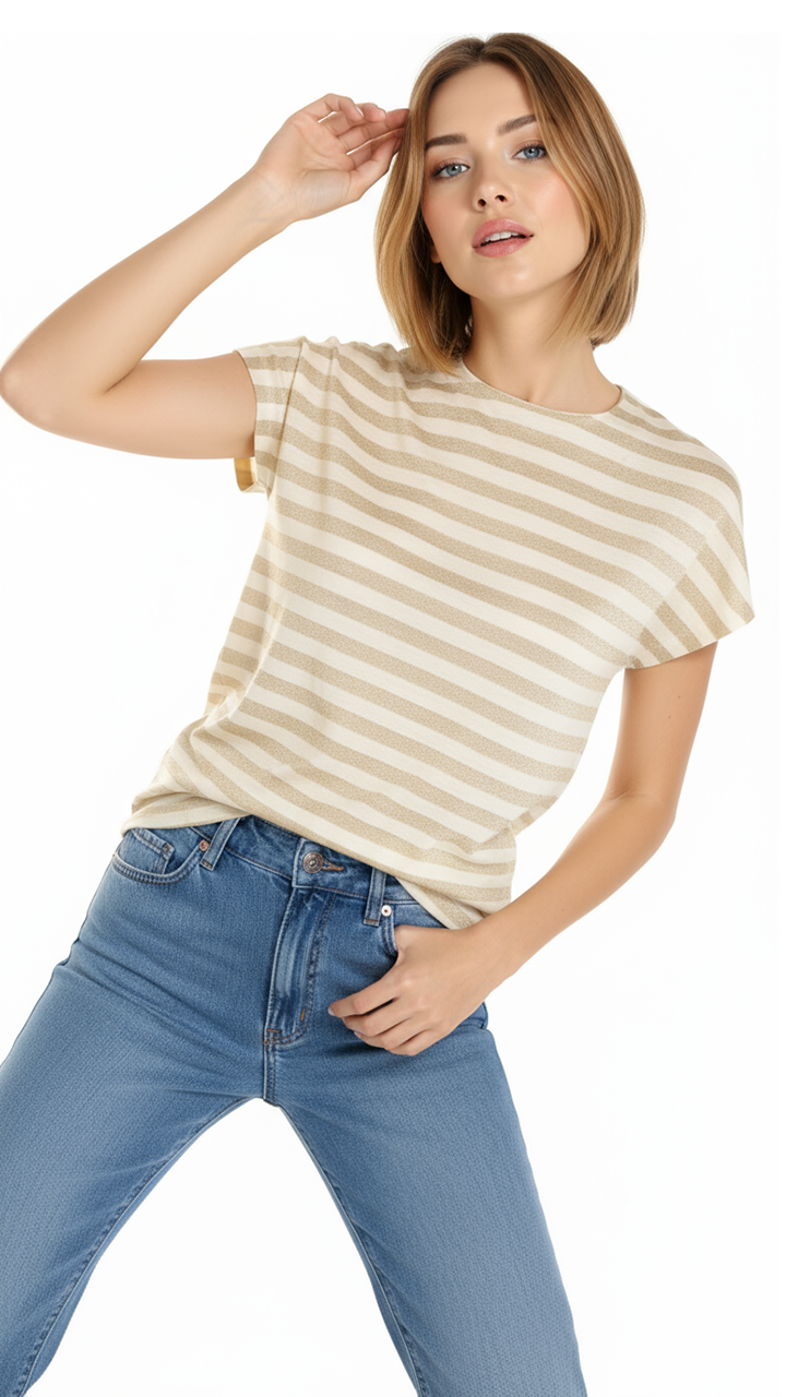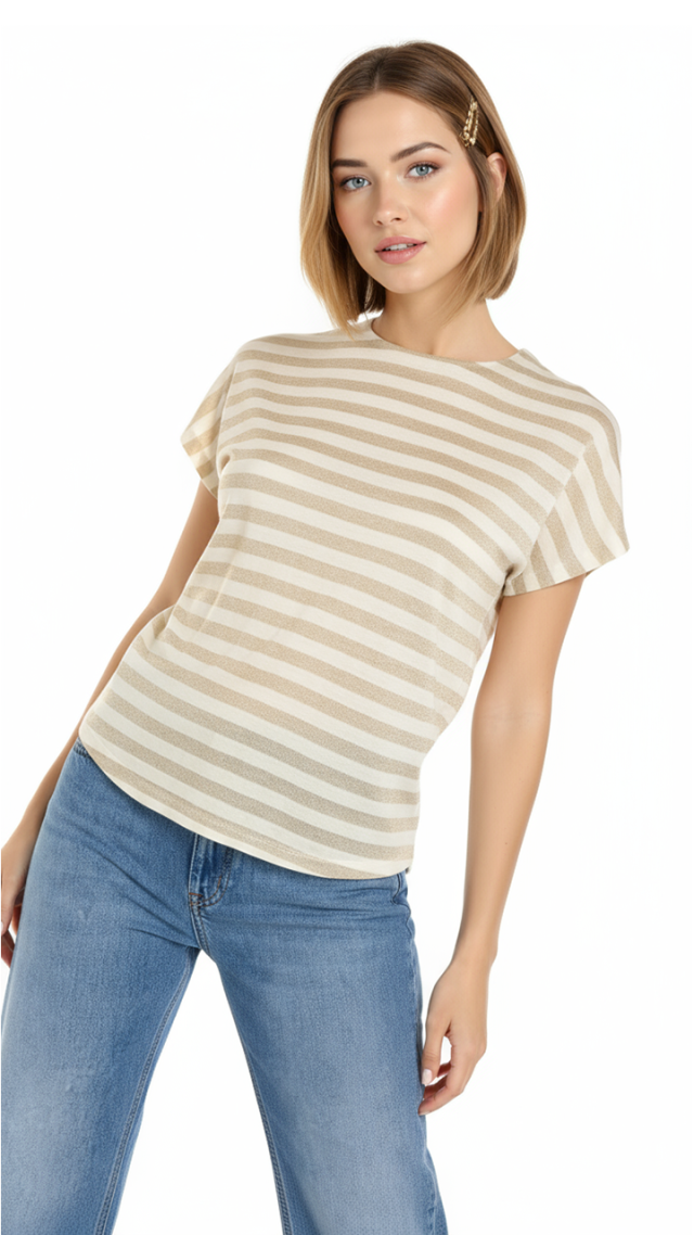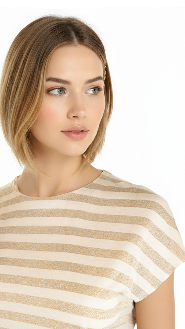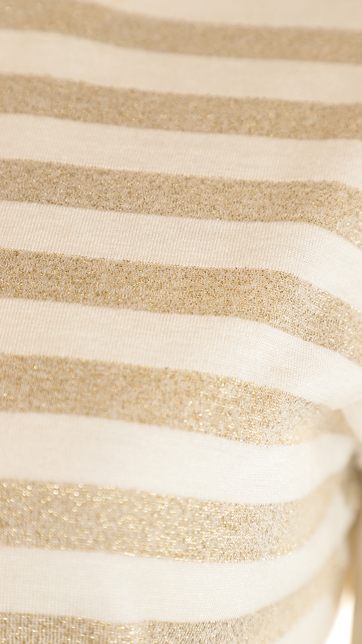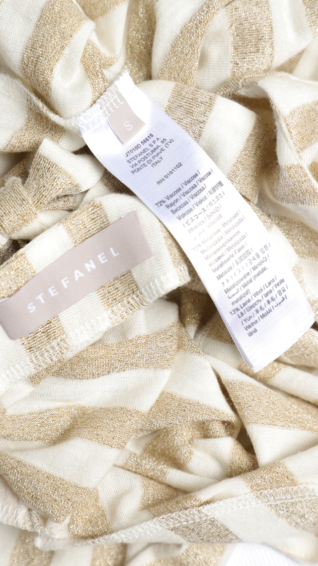Яркий джемпер итальянского бренда Stefanel свободного фасона в золотую и молочно-белую полоску с коротким приспущенным рукавом и вырезом треугольничек с завязкой на бантик по спинке. В составе 72% вискоза, 13% шерсть, 15% металлик: ткань экстра качества: мягкая, легкая, приятная в носке. Состояние — идеальное, как новое.