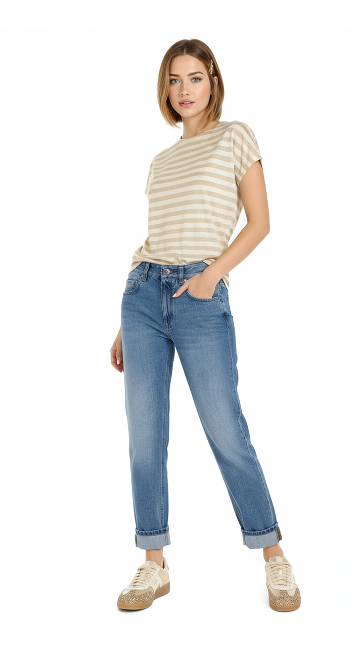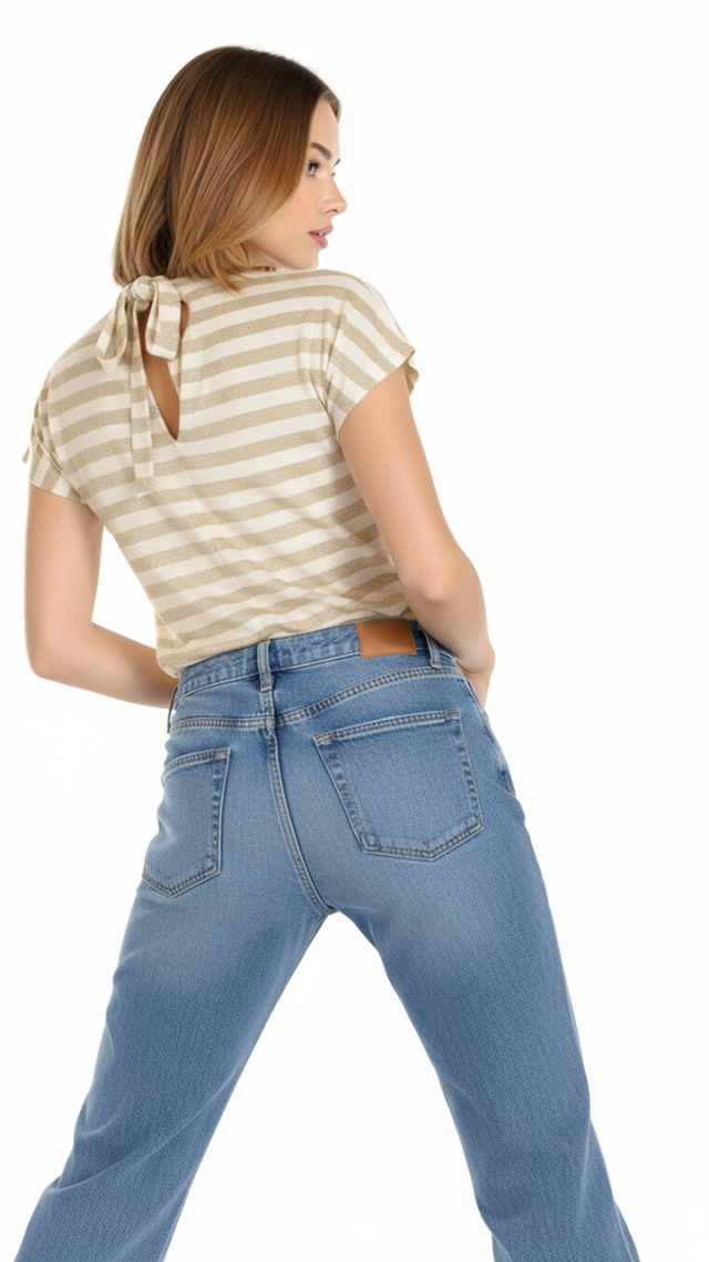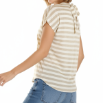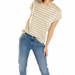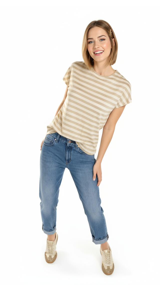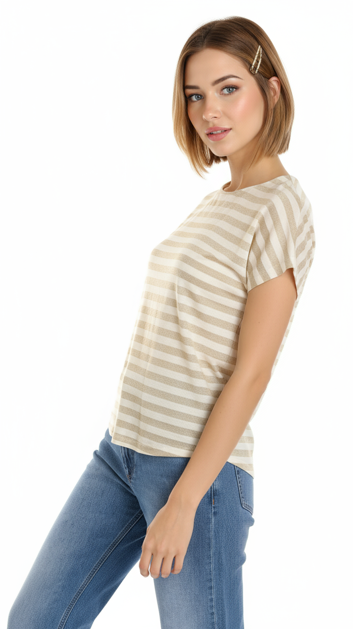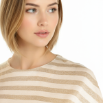 Яркий джемпер итальянского бренда Stefanel свободного фасона в золотую и молочно-белую полоску с коротким приспущенным рукавом и вырезом треугольничек с завязкой на бантик по спинке. В составе 72% вискоза, 13% шерсть, 15% металлик: ткань экстра качества: мягкая, легкая, приятная в носке. Состояние — идеальное, как новое.