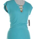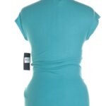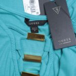 Новая трикотажная футболка американского бренда Guess цвета морской волны с вырезом на груди, декорированным золотыми плашками, и коротким рукавом. В составе: 97% вискоза, 3% спандекс: ткань легкая, очень мягкая, хорошо тянется. Состояние — новое, с оригинальной биркой Guess.