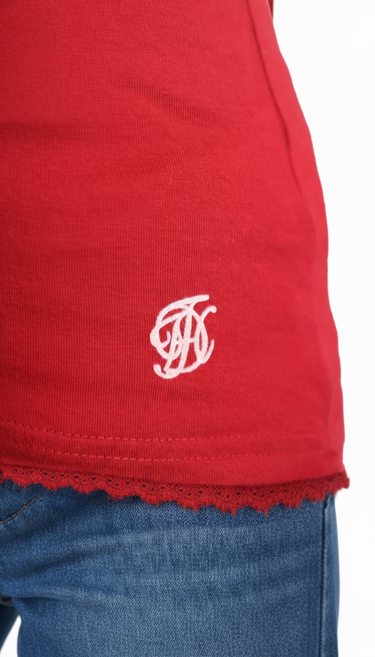 Новая футболка Tommy Hilfiger темно-красного цвета. Удлиненный приталенный фасон с коротким рукавом на резинке и глубоким V-вырезом горловины. Классический отложной воротничок. Фирменная вышивка TH и флаг на рукаве. Подол, декорированный кружевом. Застежка на бронзовые брендированные пуговки по горловине. В составе: 60% хлопок, 40% модал — ткань мягкая, бархатистая, хорошо тянется. Состояние — новое, с фирменной биркой Tommy Hilfiger.