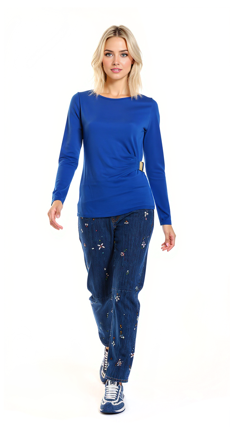 Новый трикотажный лонгслив Michael Kors яркого синего цвета ультрамарин. Приталенный фасон с драпировкой и золотой пряжкой по талии с гравировкой бренда. Скругленный вырез горловины и длинный рукав. Застежка по спинке на молнию. В составе: 95% п/э, 5% эластан — ткань легкая, прекрасно тянется, имеет бархатистую текстуру и комфортная к телу. Оригинал из США. Состояние — новое, с фирменной биркой магазина Michael Kors.