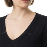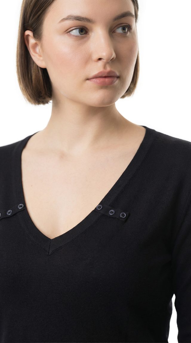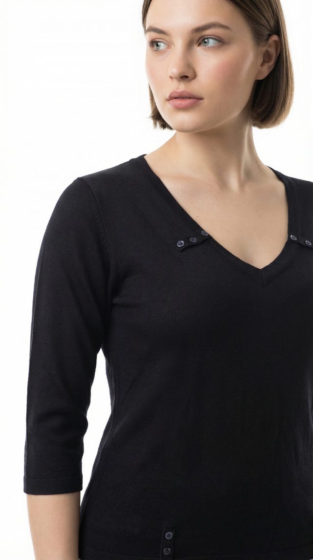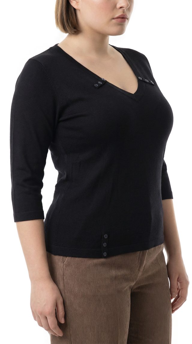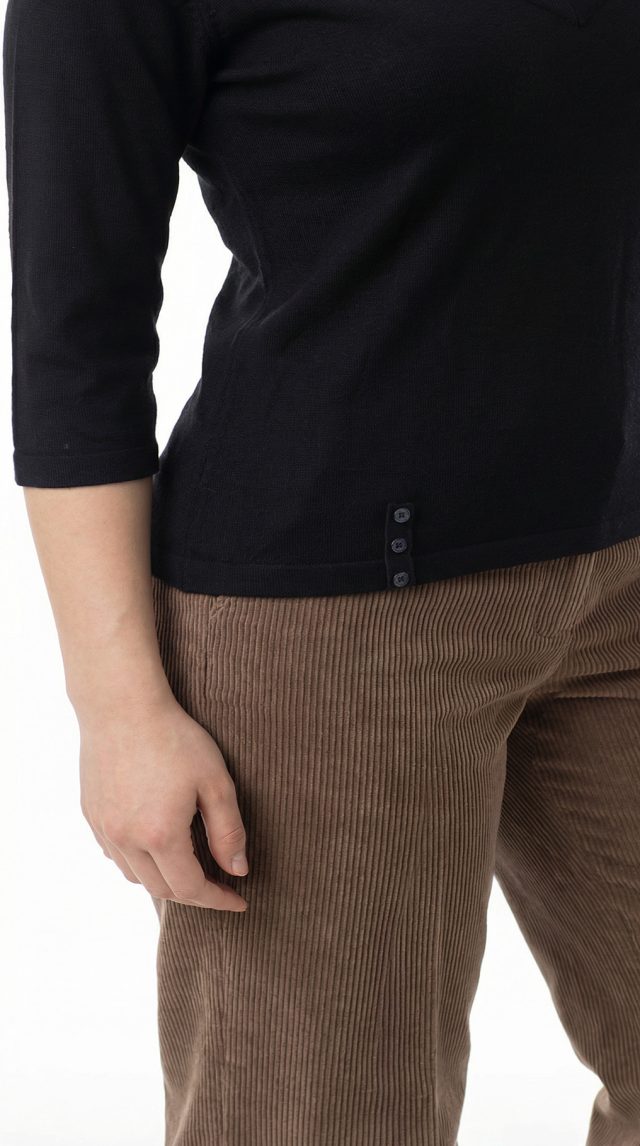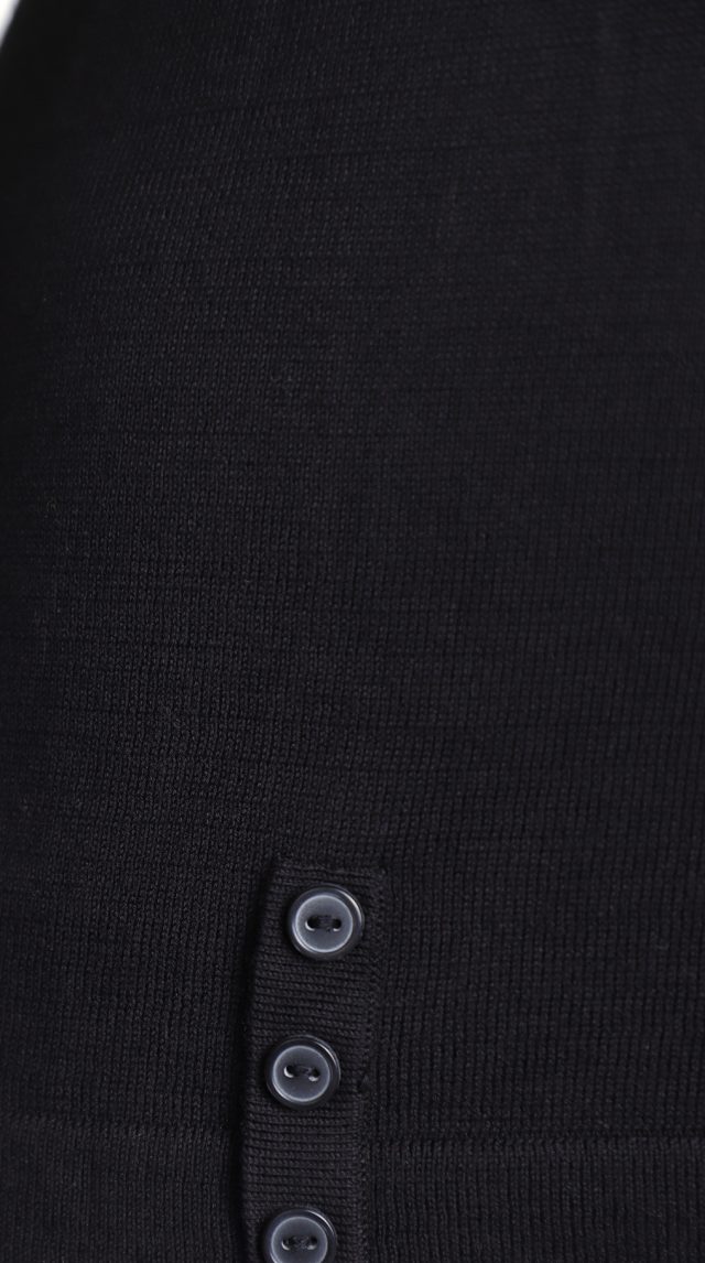 Новый трикотажный лонгслив французского бренда класса «люкс» Zapa Paris черного цвета. Приталенный фасон с рукавом 3/4 и V-образной горловиной, декоративной плашками с пуговками. Премиальное качество пошива и материалов. В составе 100% экстра хлопок: легкий, мягкий, с шелковистым отливом. Состояние — новое, с оригинальной биркой Zapa Paris.