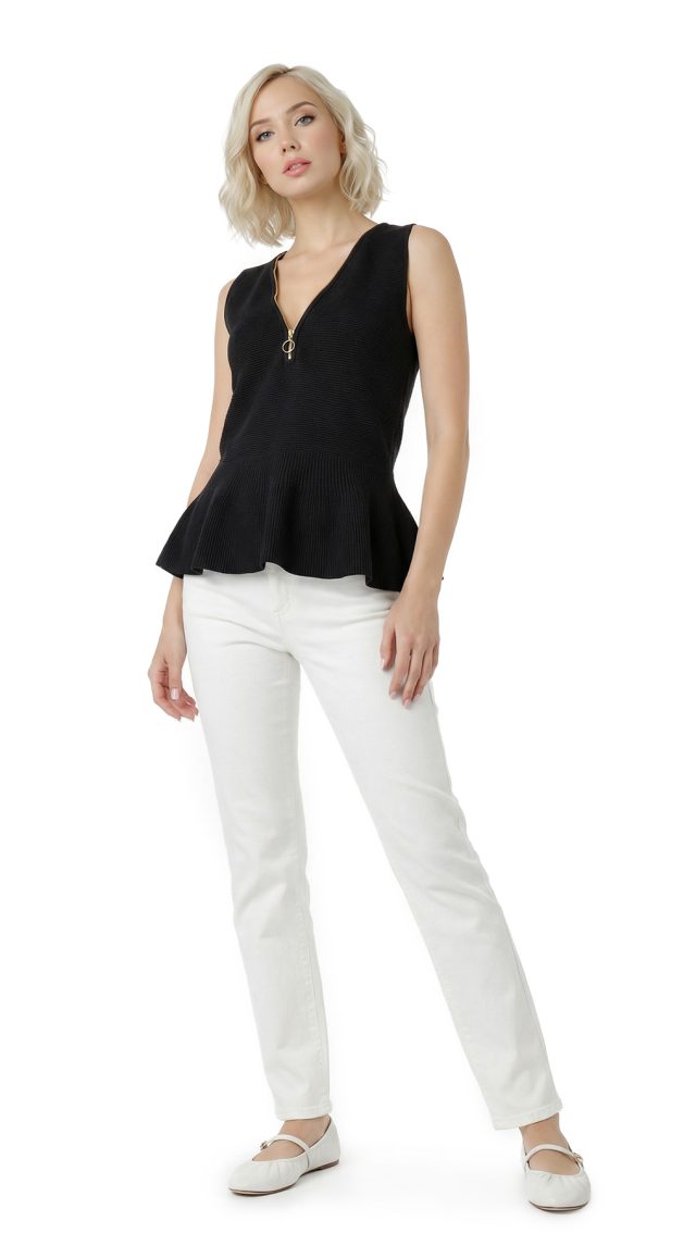 Новый трикотажный топ американского бренда Inc International Concepts черного цвета. Женственный приталенный фасон «безрукавка» со стильной золотой молнией и баской по талии. В составе: 65% вискоза, 35% нейлон — ткань средней плотности, эластичная, по фактуре в мелкий рубчик. Состояние — новое, с фирменной биркой INC. Цена на бирке 79.5$.