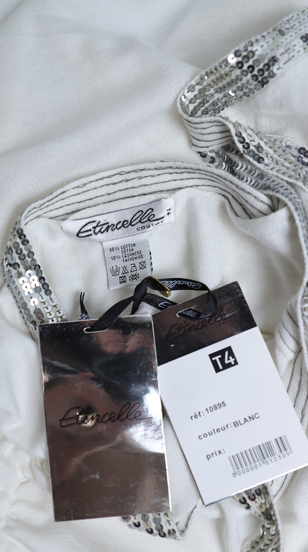 Новый трикотажный топ французского бренда «прет-а-порте» L’Etincelle de Paris молочно-белого цвета с серебристыми пайетками. Женственный фасон с вырезом «петелька» и открытой спинкой. Красивая драпировка по бокам и переду — визуально стройнит фигурку и скрывает животик. В составе 85% хлопок, 15% кашемир — ткань легкая, очень мягкая, приятная к телу. Состояние — новое, с фирменной биркой L’Etincelle de Paris.