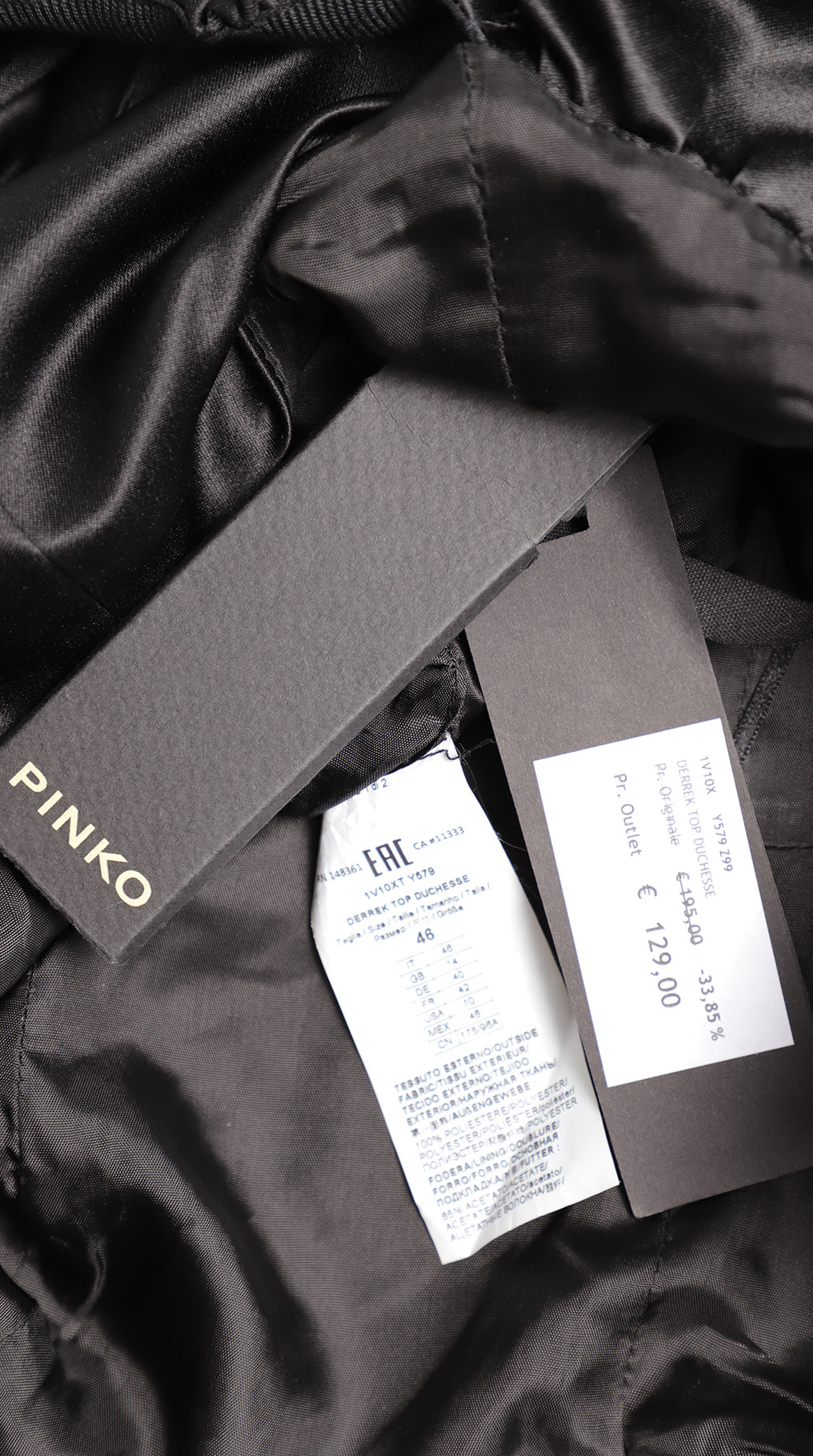 Новый дизайнерский топ итальянского бренда Pinko черного цвета. Укороченный приталенный фасон с глубоким декольте в форме сердечка и короткими рукавами-крылышками на потайной резинке — можно приспустить и оголить линию плеч. Вертикальные рельефные швы обеспечивают идеальную посадку по фигурке и имитируют структуру корсета. Застежка сбоку на молнию. Пошив — Тунис. В составе: 65% шелковый ацетат, 35% вискоза (подклад), 100% п.э — верх — ткань экстра качества: средней плотности, приятная к телу, хорошо держит форму. Состояние — новое, с оригинальной биркой Pinko. Первоначальная цена на бирке — 195 евро.