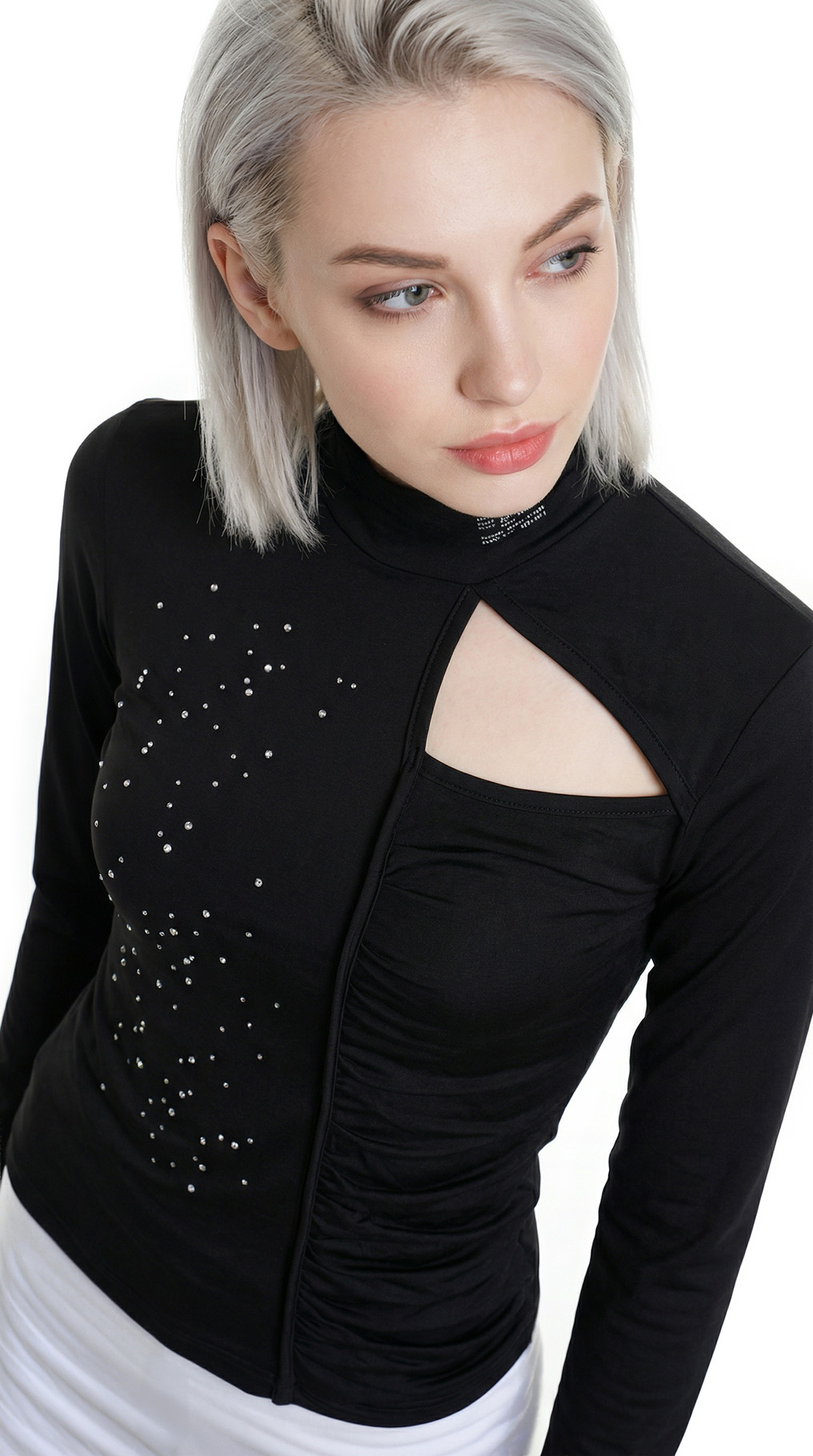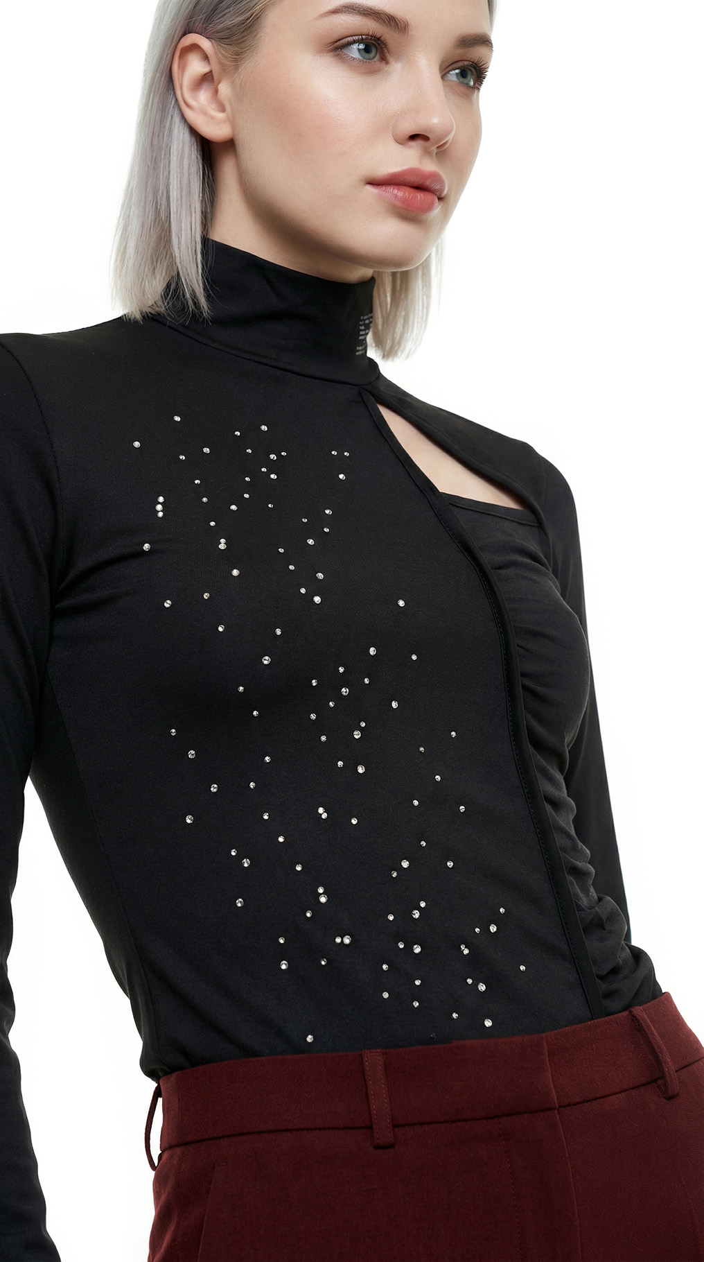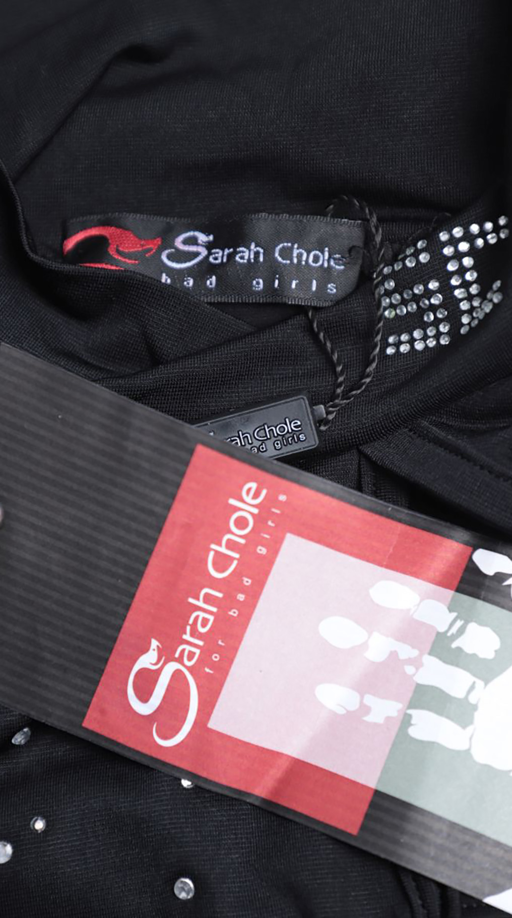 Новая трикотажная водолазка итальянского бренда Sarah Chole черного цвета со стразами. Драпировка и игривый вырез по переду. Длинный рукав. Фирменная аппликация логотипа бренда на воротничке. В составе 96% п.э, 4% спандекс — ткань легкая, шелковистая, хорошо тянется. Состояние — новое, с фирменной биркой Sarah Chole.