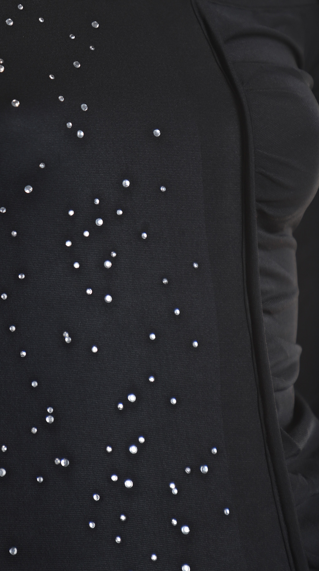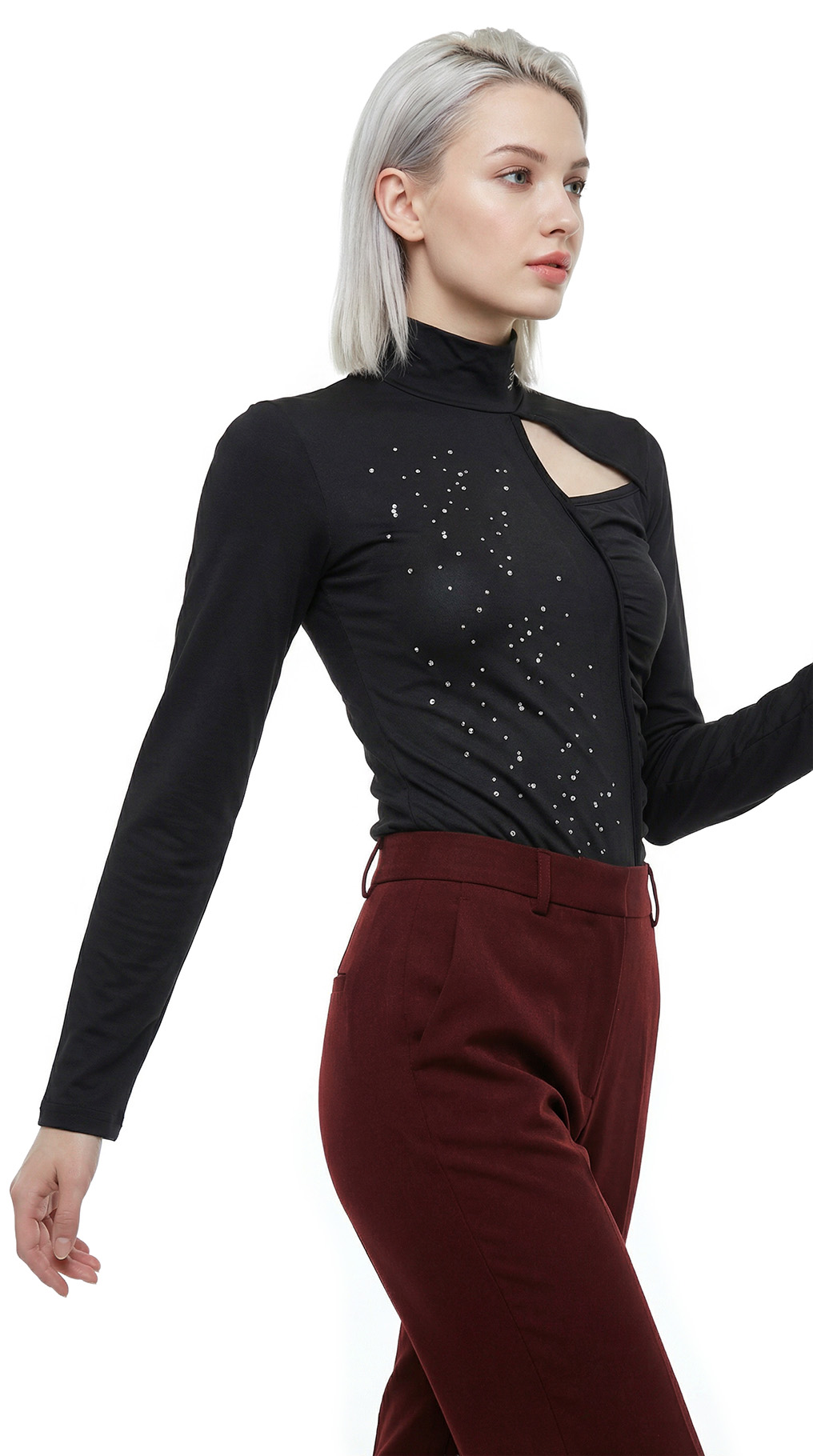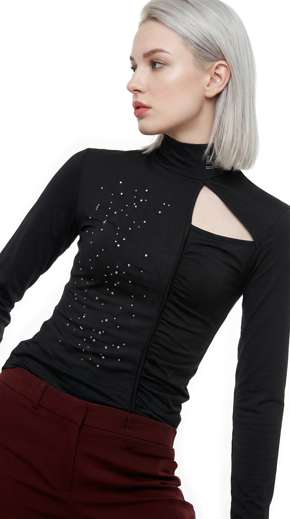 Новая трикотажная водолазка итальянского бренда Sarah Chole черного цвета со стразами. Драпировка и игривый вырез по переду. Длинный рукав. Фирменная аппликация логотипа бренда на воротничке. В составе 96% п.э, 4% спандекс — ткань легкая, шелковистая, хорошо тянется. Состояние — новое, с фирменной биркой Sarah Chole.