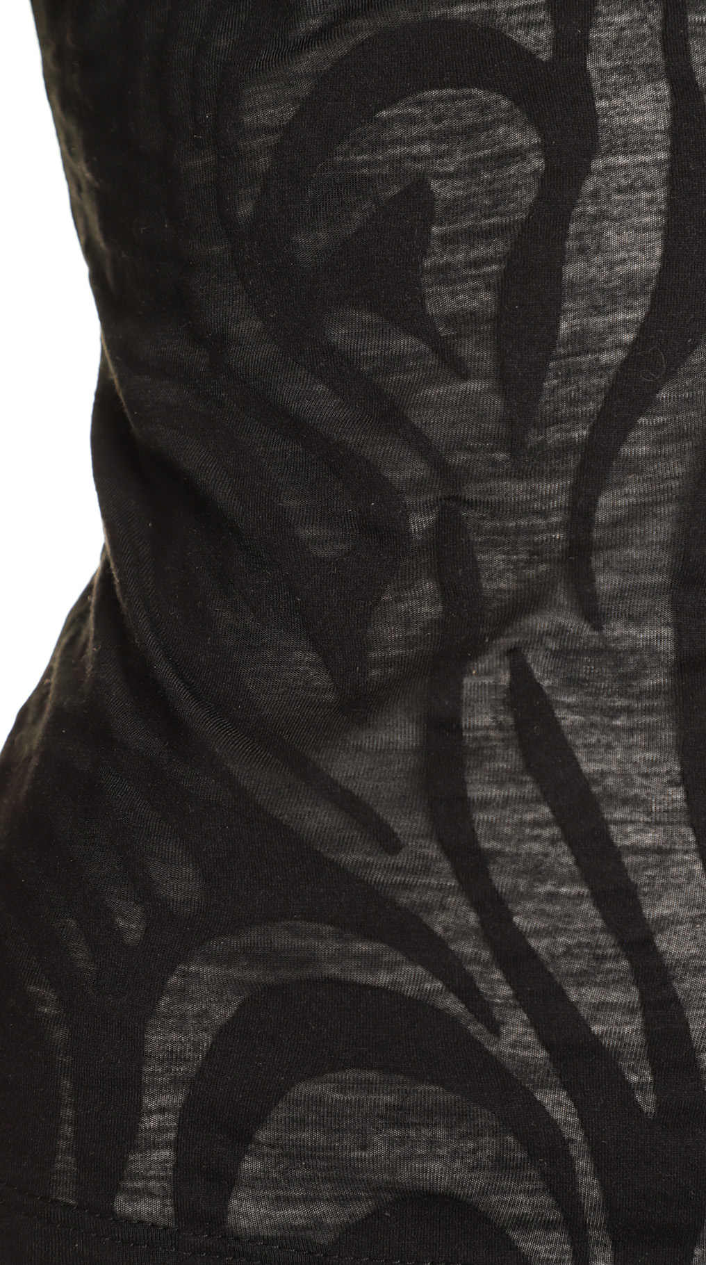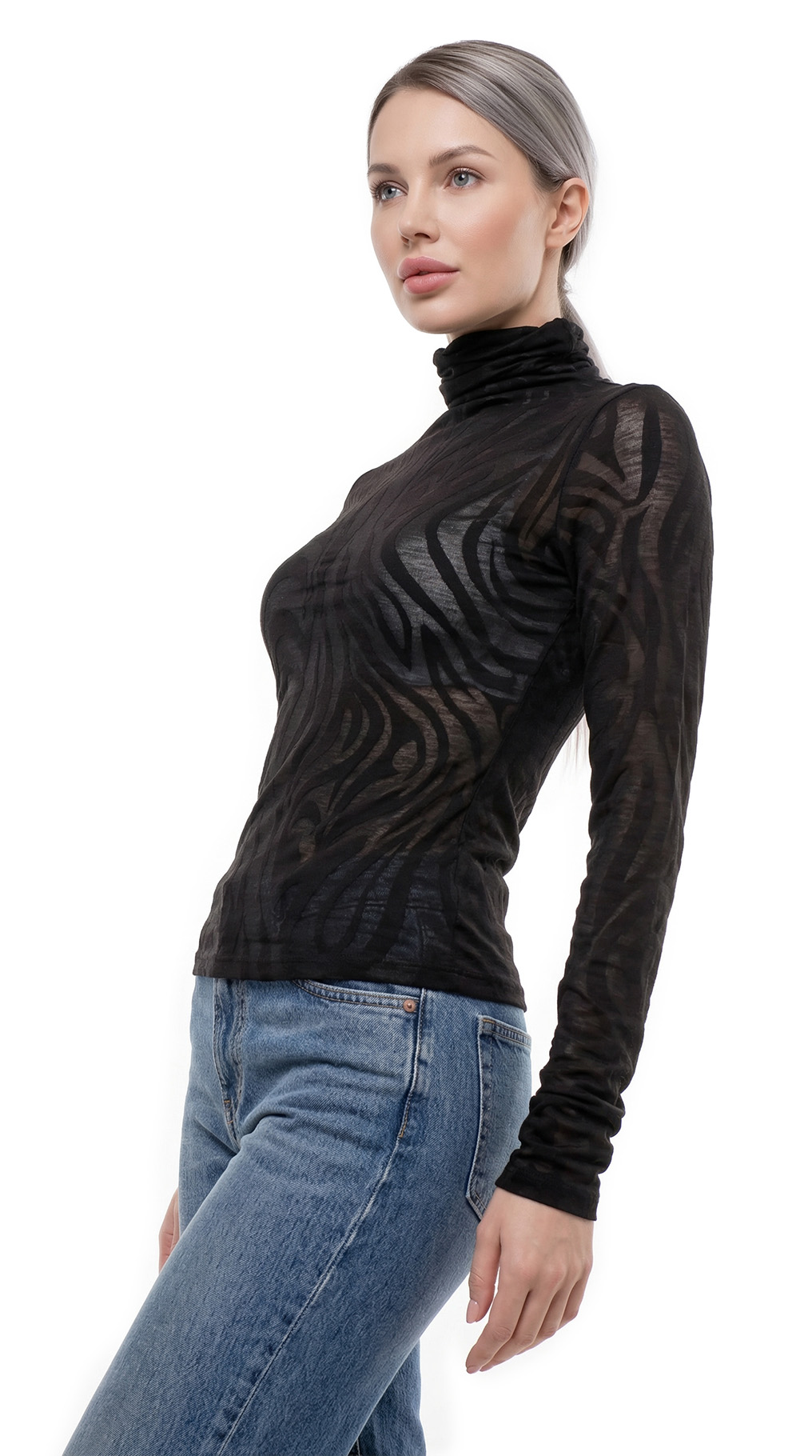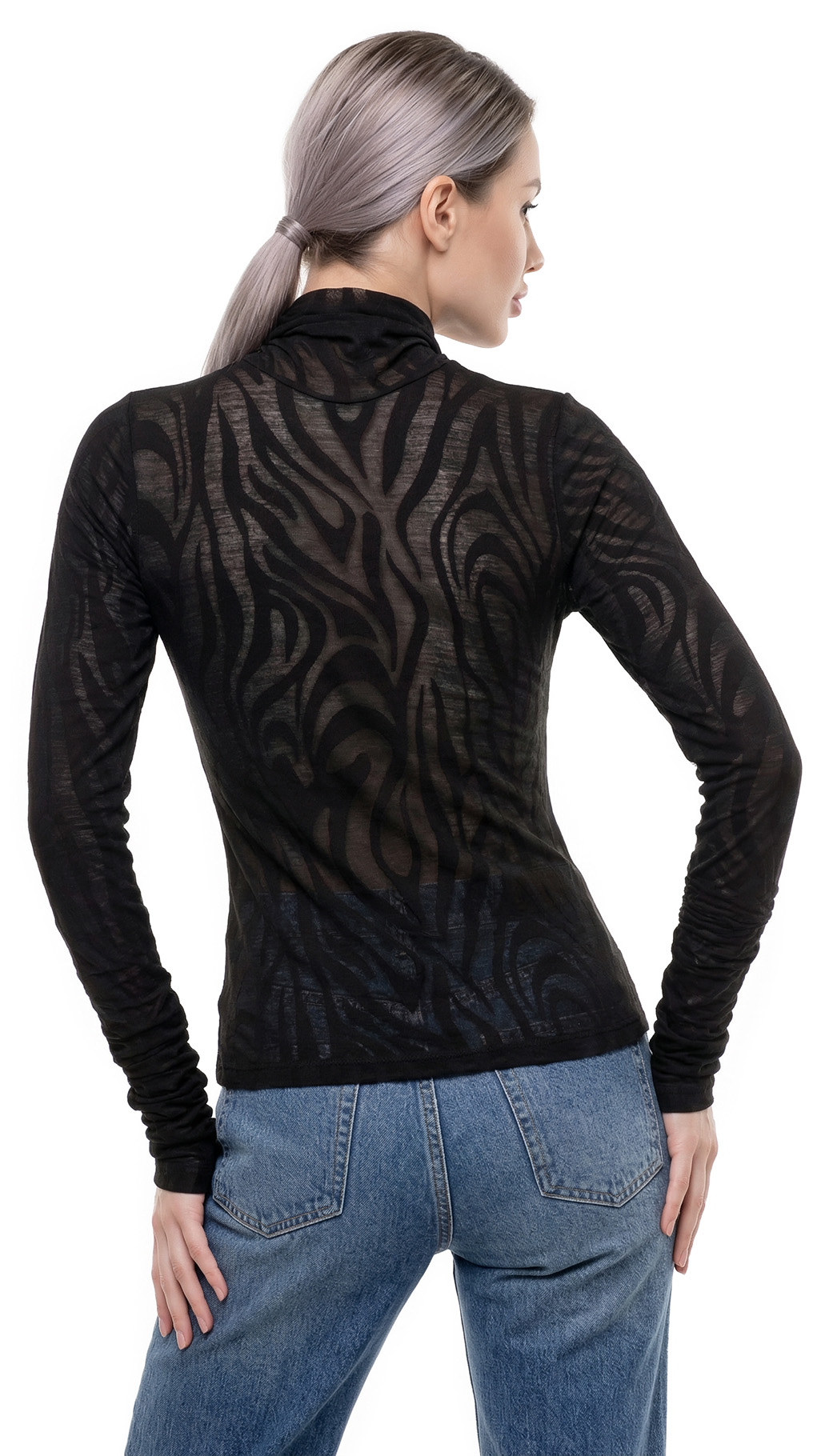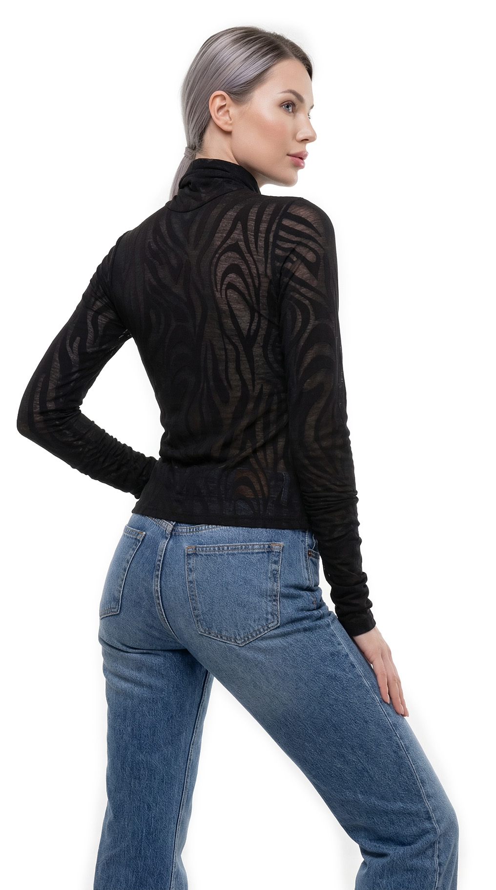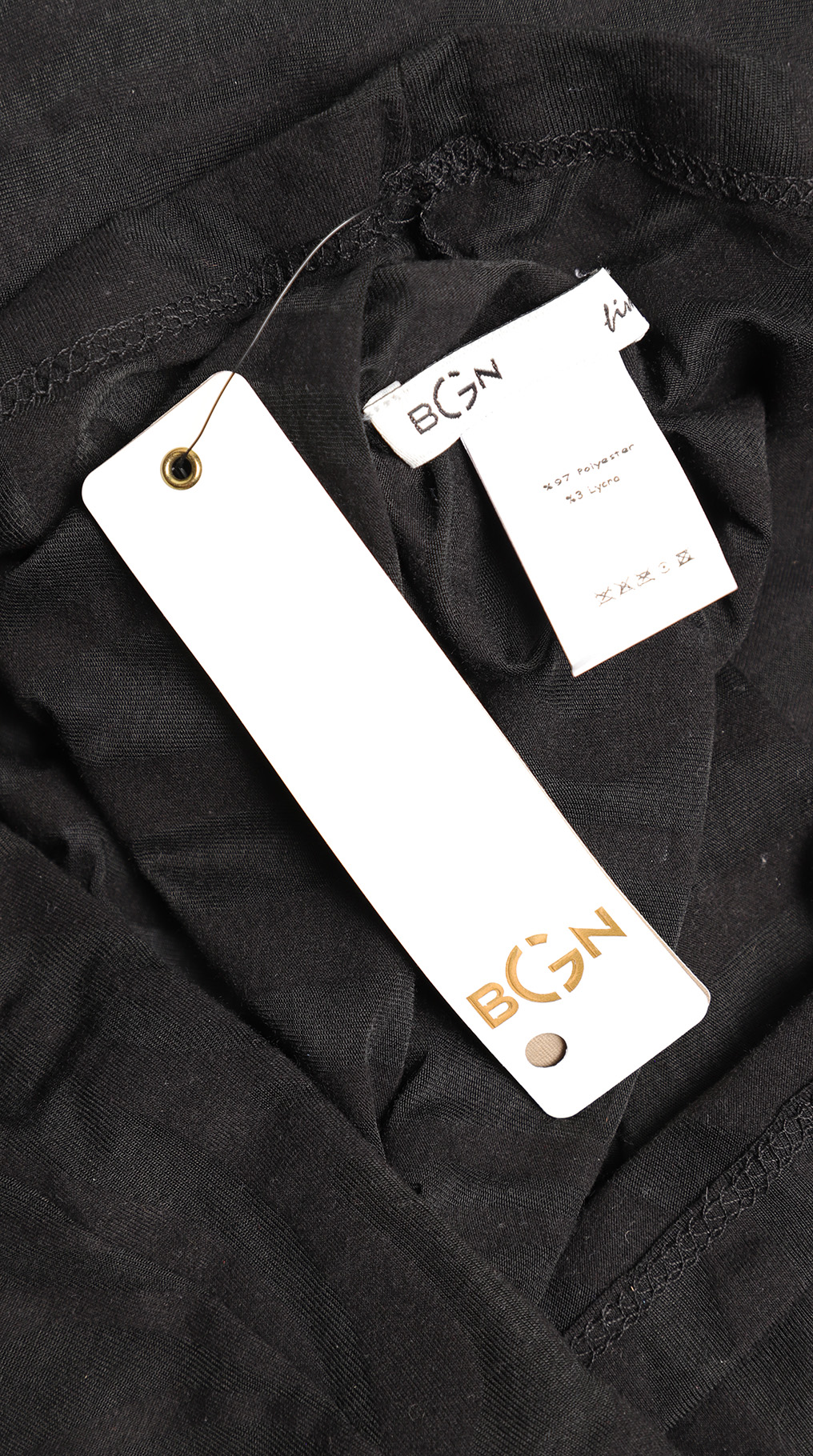 Новый трикотажный секси лонгслив французского бренда BGN черного цвета. Оригинальный дизайн с витиеватым набивным принтом на полупрорачной основе. Высокий воротнчок стойка, длинный присборенный рукав. В составе — 97% п.э, 3% лайкра — ткань легкая, мягкая, эластичная. Состояние — новое, с орининальной биркой BGN.