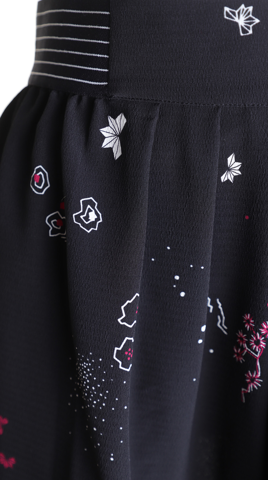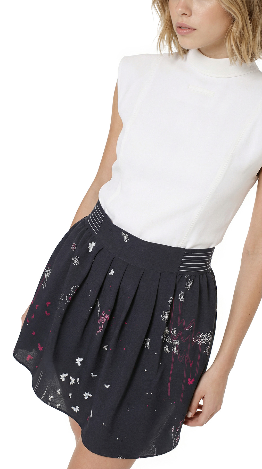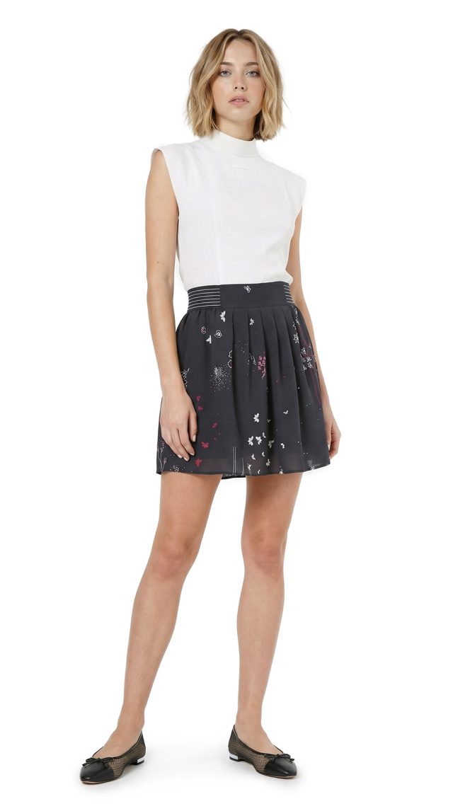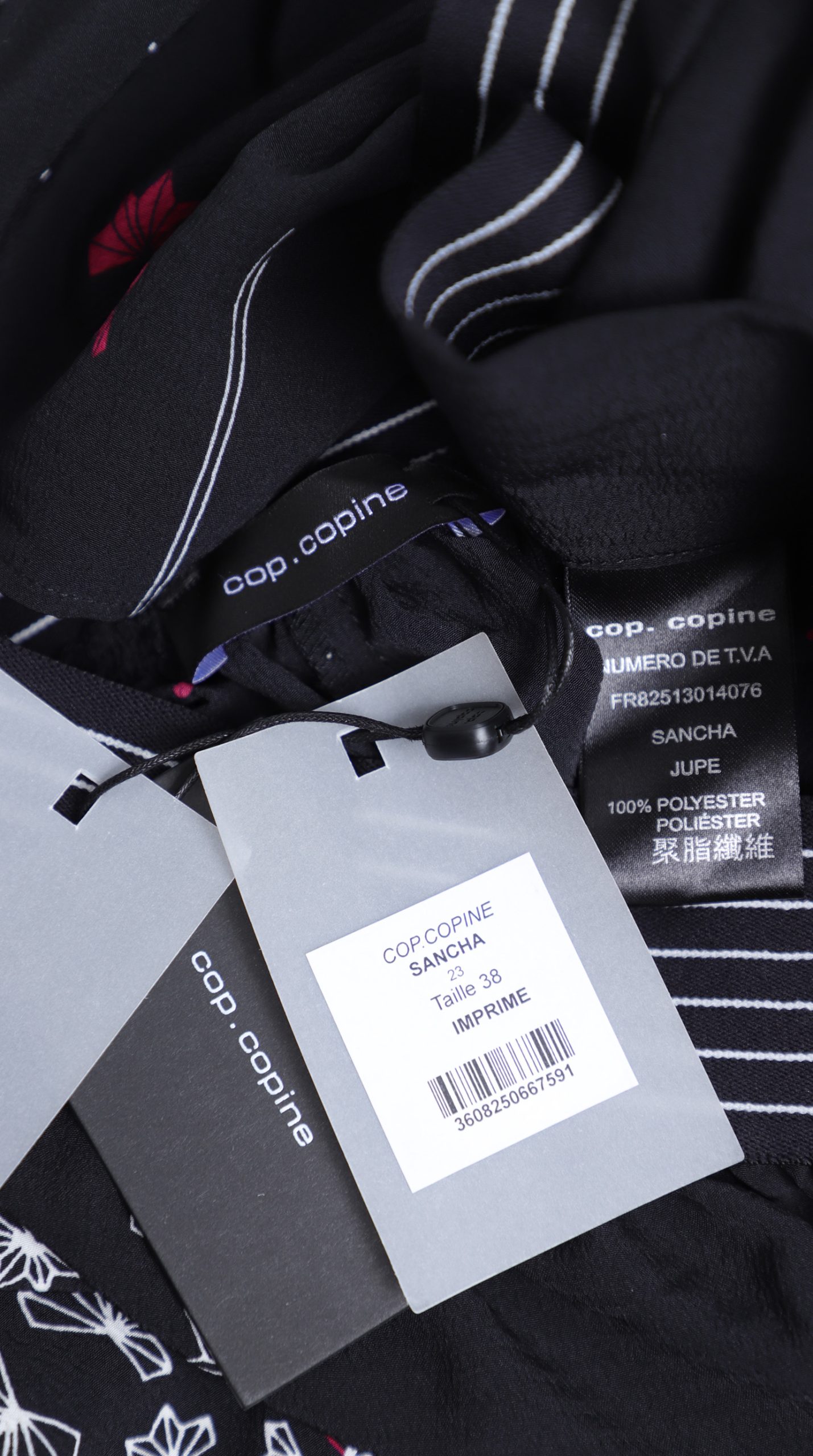 Новая юбка легендарного французского бренда Cop Copine черного цвета с нежным цветочным принтом в японском стиле. Широкий пояс с контрастными белыми полосами на резинке. Без застежки. Пошив — Португалия. В составе: 100% п.э, без подклада: ткань легкая, бархатистая. Состояние — новое, с оригинальной запломбированной биркой Cop Copine.