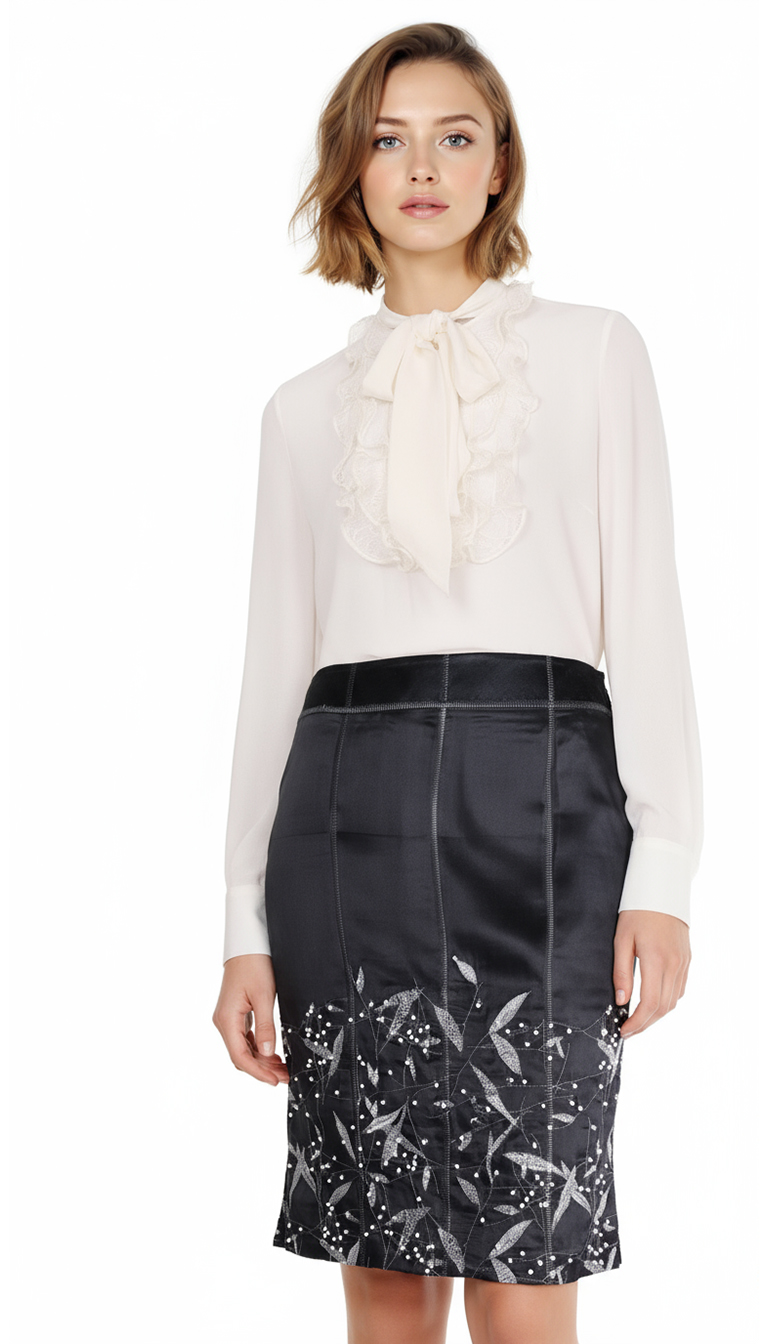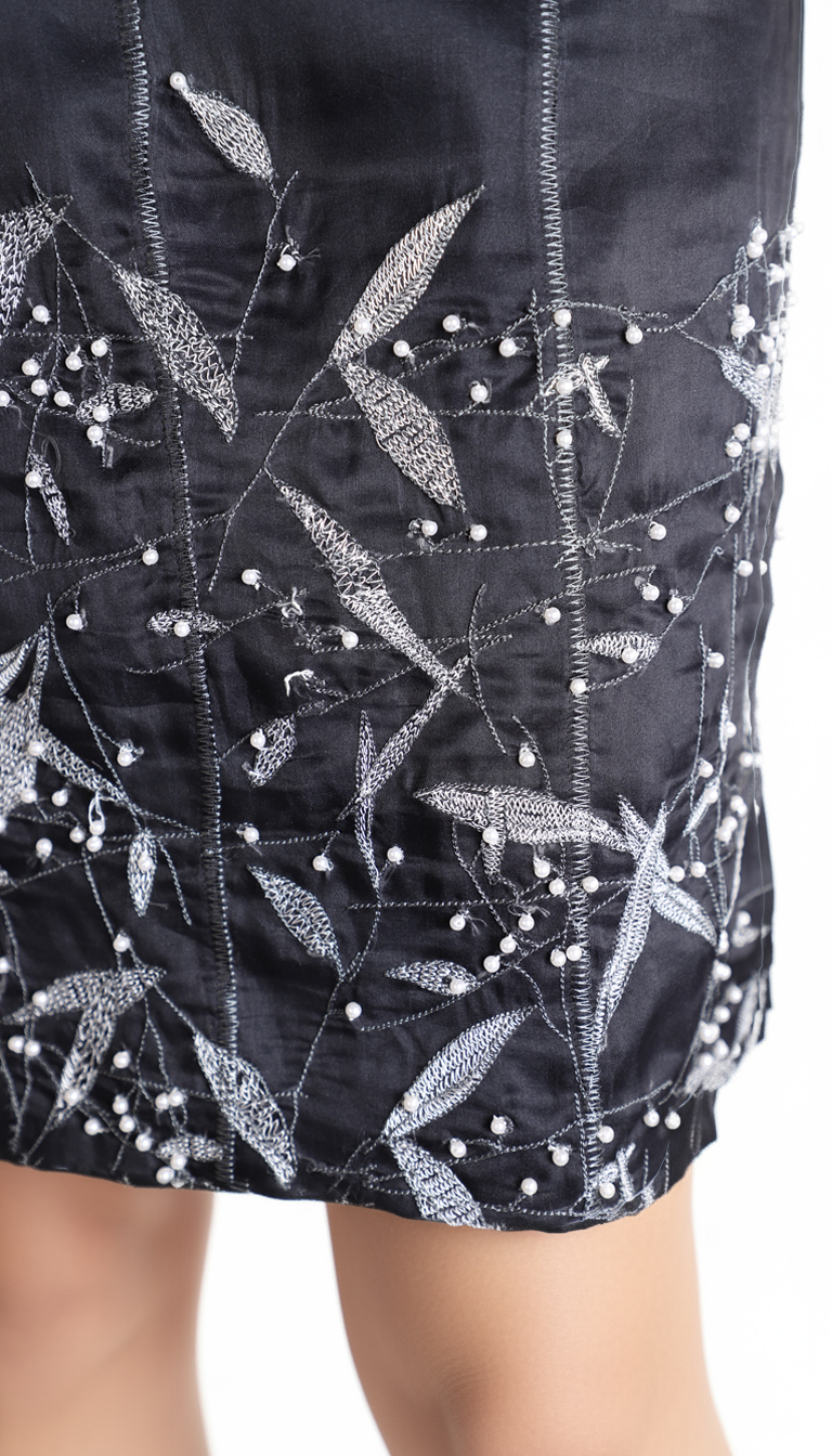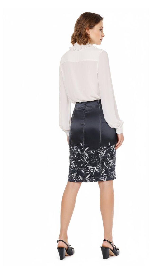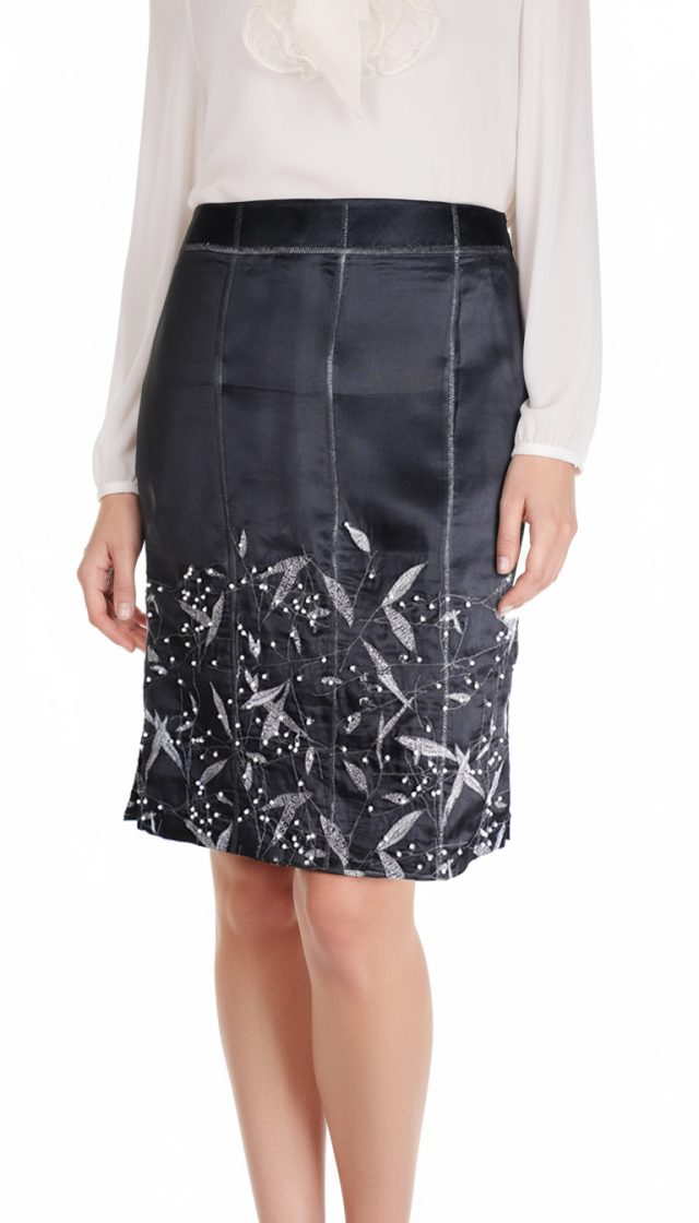 Дизайнерская юбка премиального американского бренда Magashoni черного цвета. Женственный фасон с вышивкой серебряными нитями, «жемчужным» декором и контрастной отстрочкой швов. Вырезы по бокам для комфорта в движении. Боковая застежка на молнию и потайную клипсу. Эксклюзив — в единственном экземпляре в России. В составе: 89% натуральный шелк, 11 % шерсть — ткань легкая, практически невесомая, с характерным блеском шелка. Состояние — идеальное, как новое.