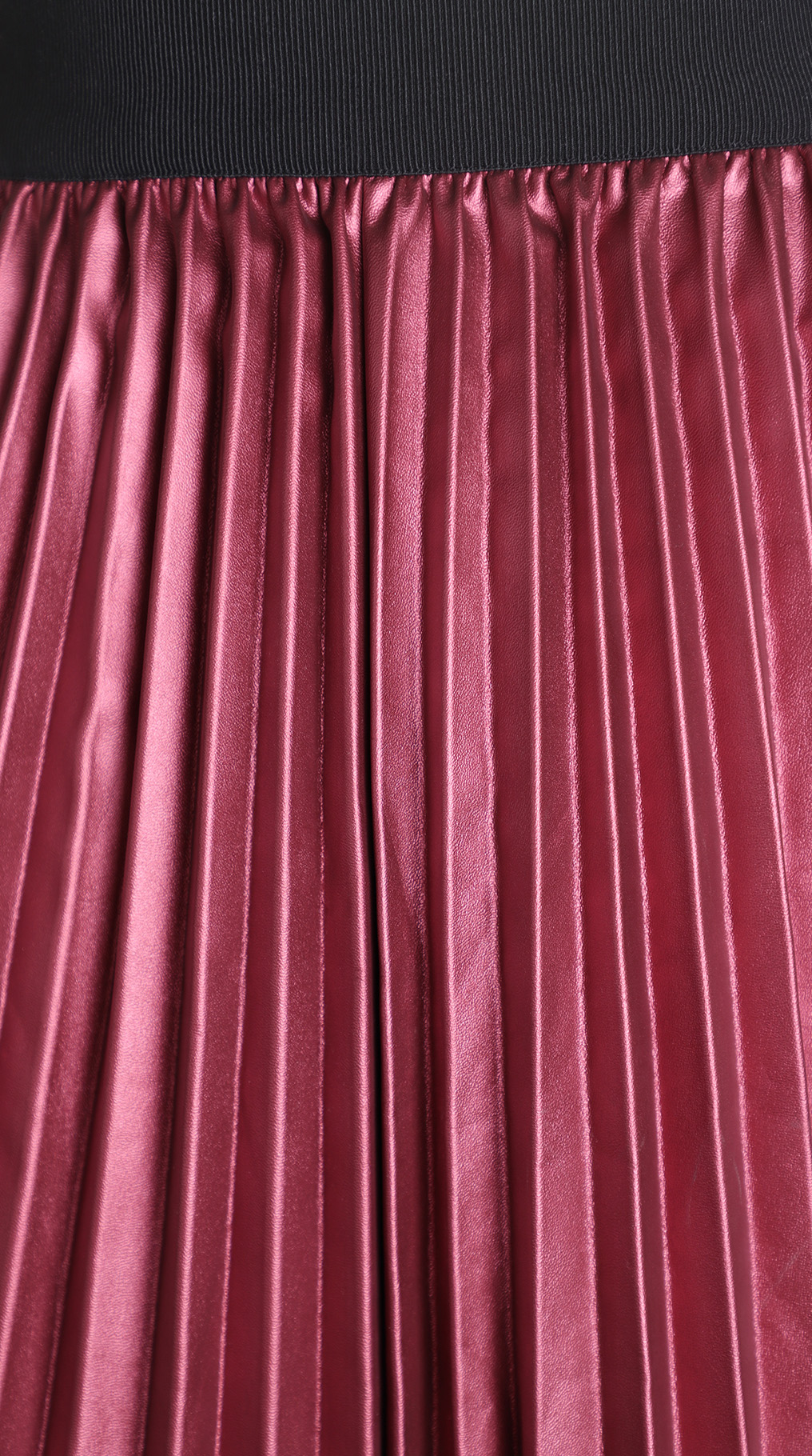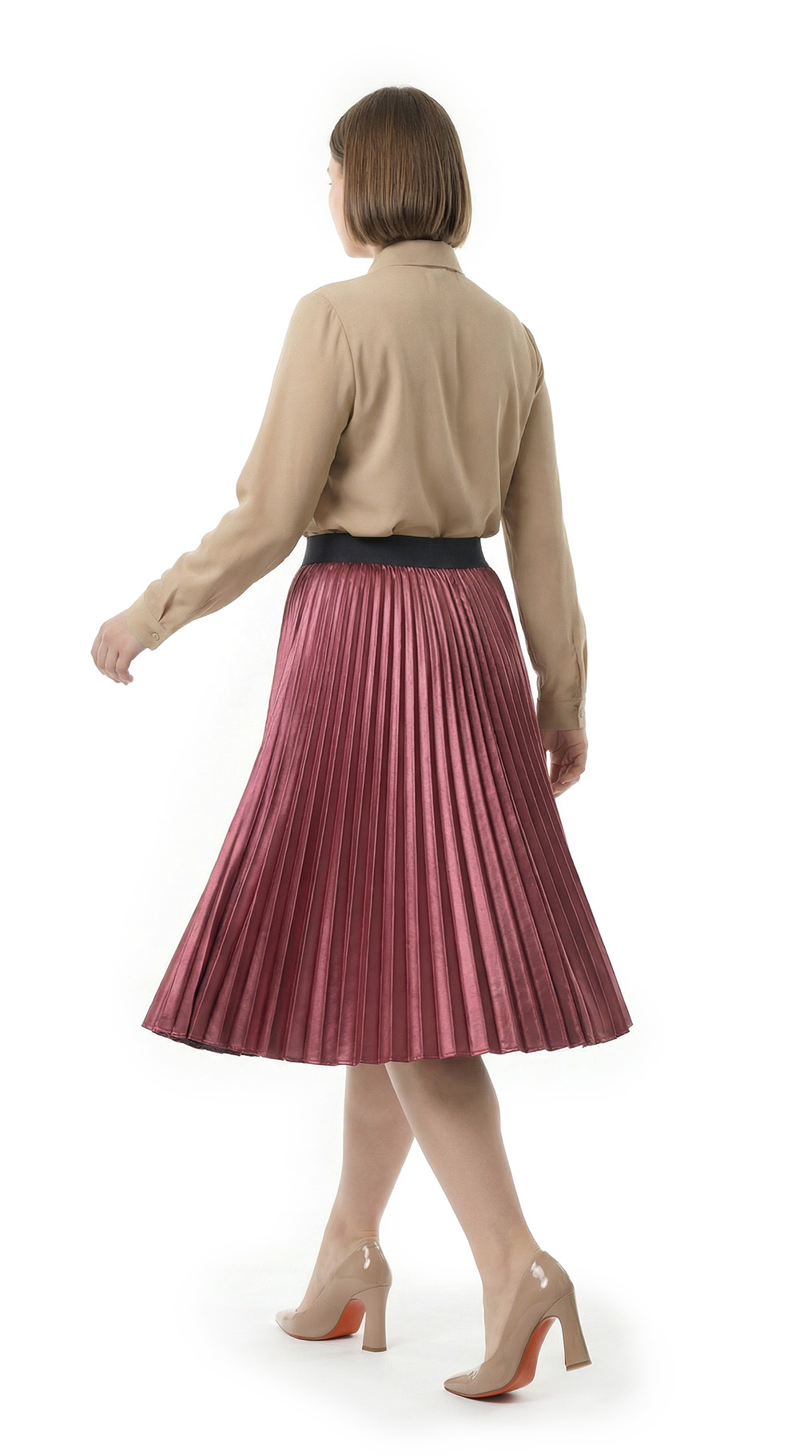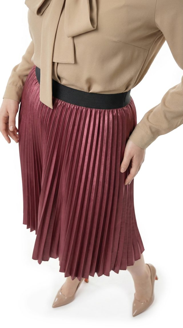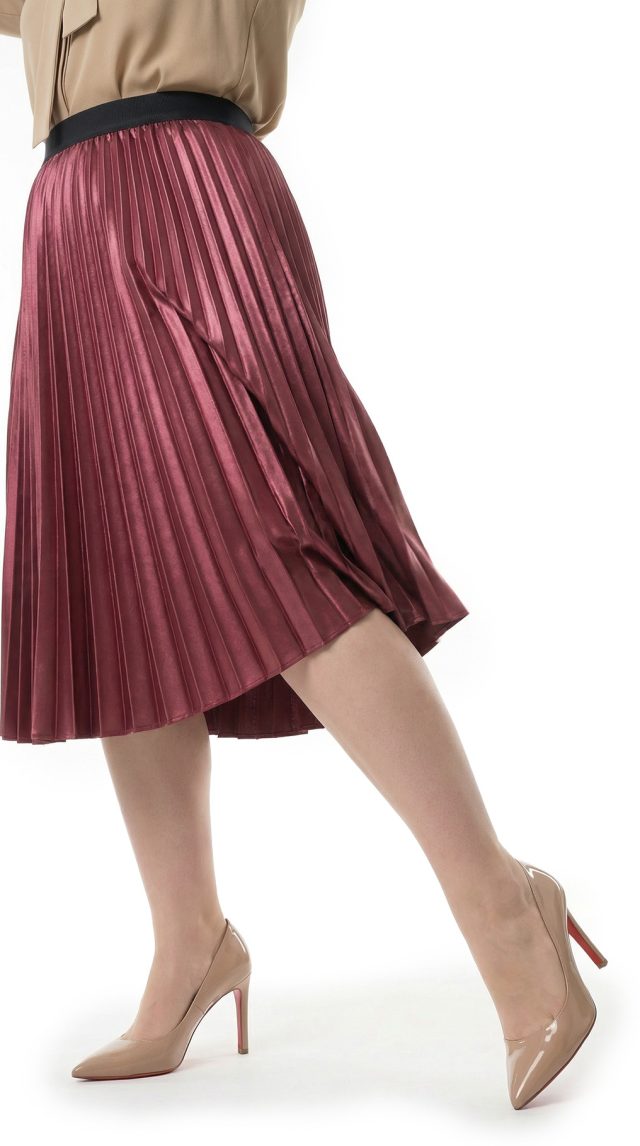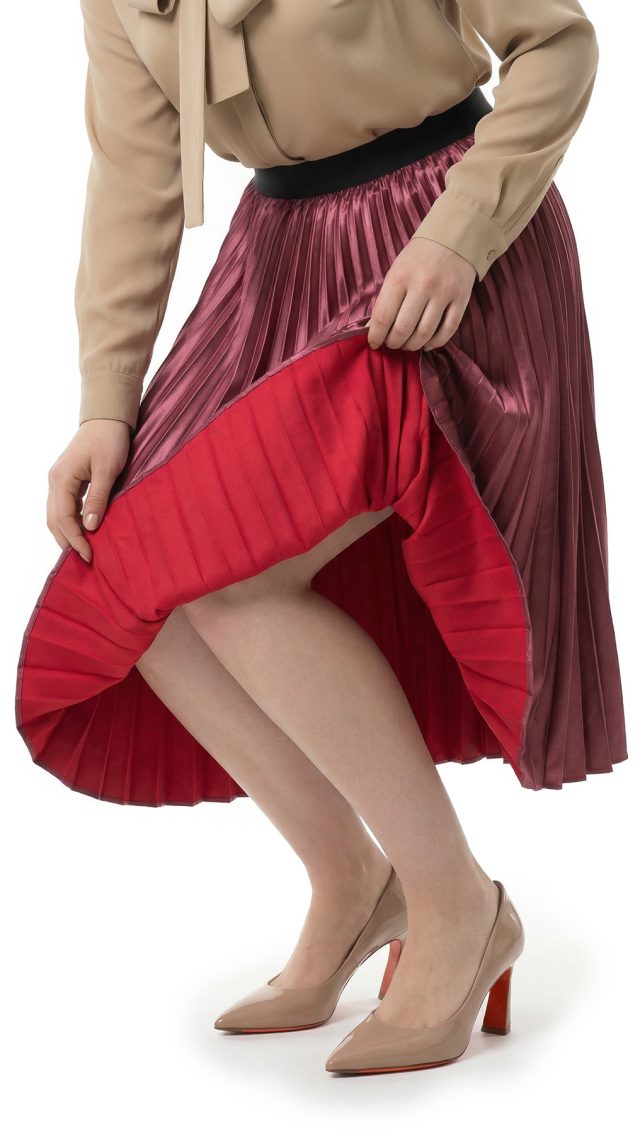 Новая юбка концерна Max Mara редкого амарантового цвета с бронзовым отливом и контрастной красной изнанкой. Фасон полу-солнце в мелкую складку. Комфортный пояс на резинке. Без застежки. В составе: 90% п.э, 10% эластан — ткань плотная, смотрится стильно и дорого. Состояние — новое, из аутлета концерна MaxMara (ярлык бренда надрезан — это политика аутлета).
