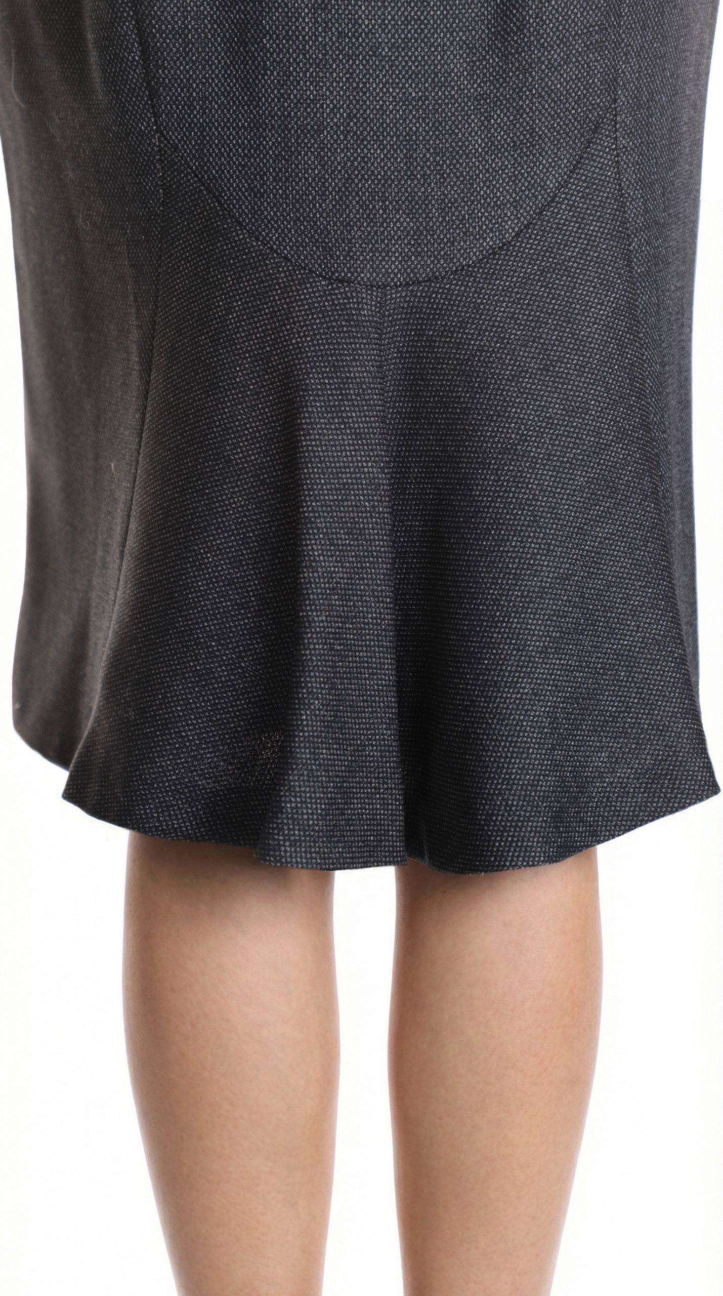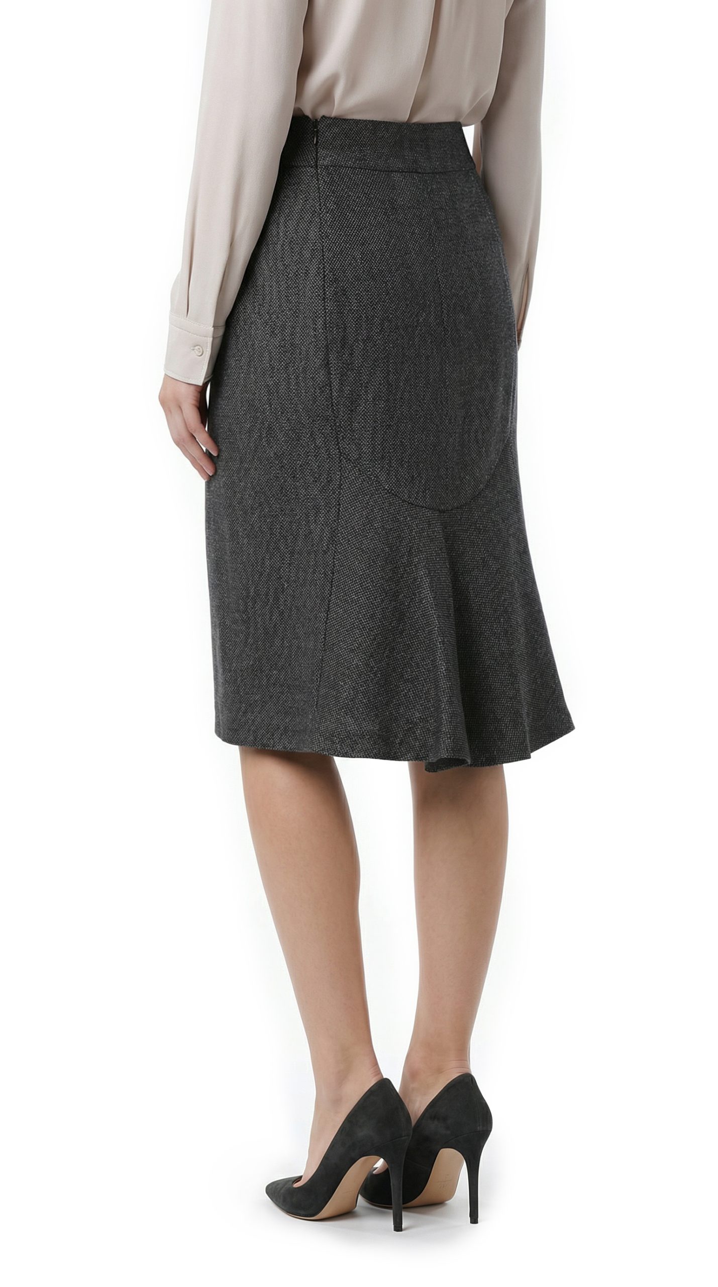 Женственная шерстяная юбка Max Mara темно-серого цвета с воланами по спинке. Широкий пояс по талии. Застежка на молнию. В составе 85% шерсть, 13% п/э, 2% эластан, на подкладе из 67% ацетата, 33% пэ. Состояние — идеальное, как новое.