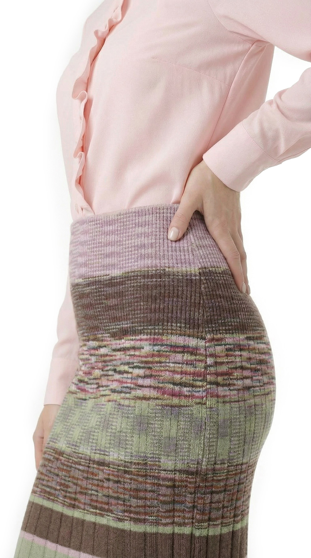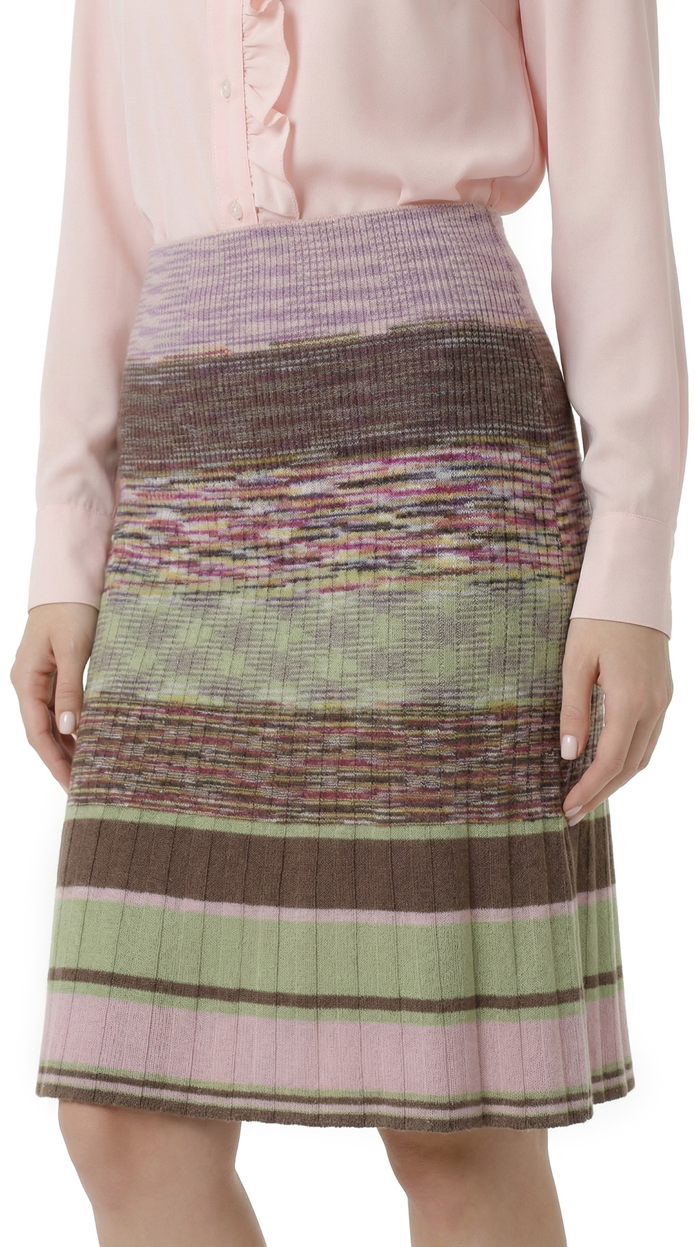 Трикотажная юбка итальянского бренда Missoni с характерным принтом «зигзаг» в розово-салатово-бордовых тонах. Посадка по талии, без застежки. Оригинал. В составе 79% шерсть, 21% вискоза, на подкладе из полиамида — ткань плотная, мягкая. Состояние — отличное.