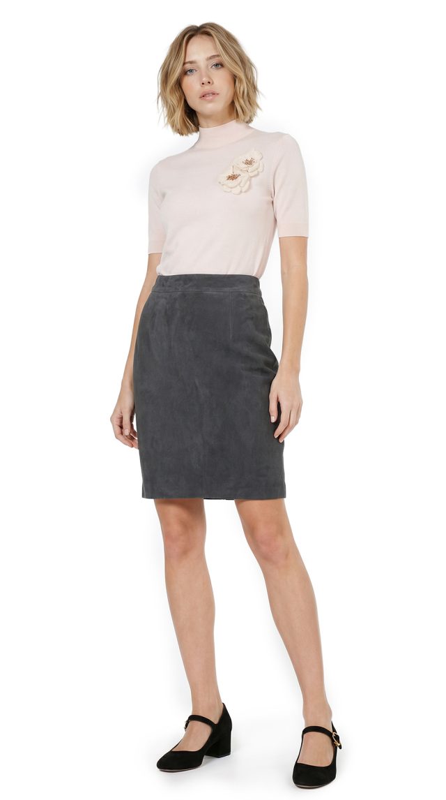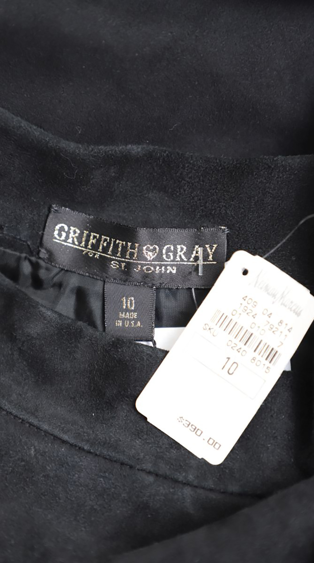 Новая замшевая юбка американского бренда класса люкс St. John (коллекция Griffith Gray) черного цвета. Застежка по спинке на молнию. В составе — 100% натуральная замша, на подкладе из 50% натурального ацетата и 50% вискозы. Ткань экстра выделки: очень мягкая и бархатистая. Состояние — новое, с биркой американского гипермаркета Neiman Marcus. Цена на бирке — 390$ (!).